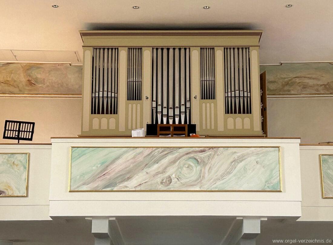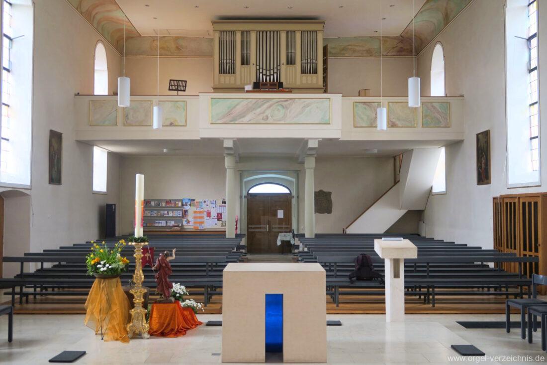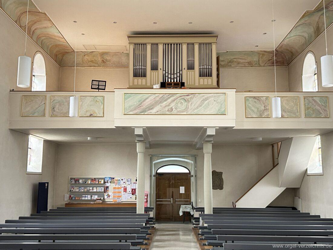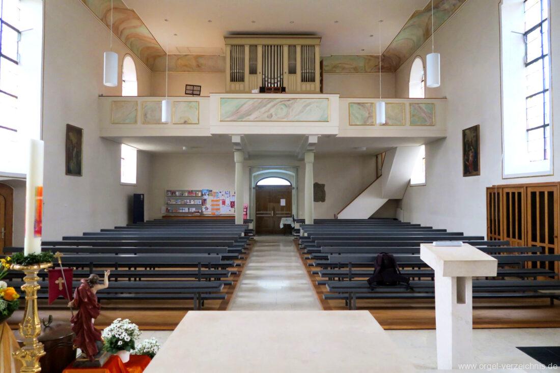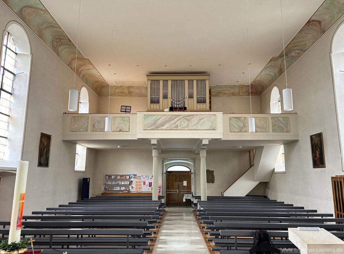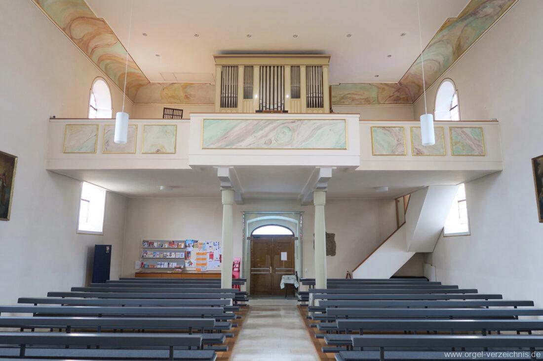 2015 Schleifladenorgel mit mittig freistehendem Spieltisch (Blickrichtung Chor) und mechanischer Traktur, erbaut unter Verwendung des Hieber-Gehäuses und des vorhandenen historischen Pfeifenmateriales und einiger Register von 1938 durch Orgelbau Wolfram Stützle (Waldkirch/Breisgau) II/17. Die ursprüngliche Tretanlage wird bei der Massnahme rekonstruiert und das Gehäuse mit neuer Farbfassung restauriert und verlängert – Einweihung mit OSV Georg Koch am 11. Oktober 2015. Bei der Einweihung wurden Werke von Johann Christian Kittel, Justin Heinrich Knecht, Josef Gabriel Rheinberger, Johann Sebastian Bach, Gustav Adolf Merkel, Heitor Villa-Lobos und Christian Heinrich Rinck dargeboten.