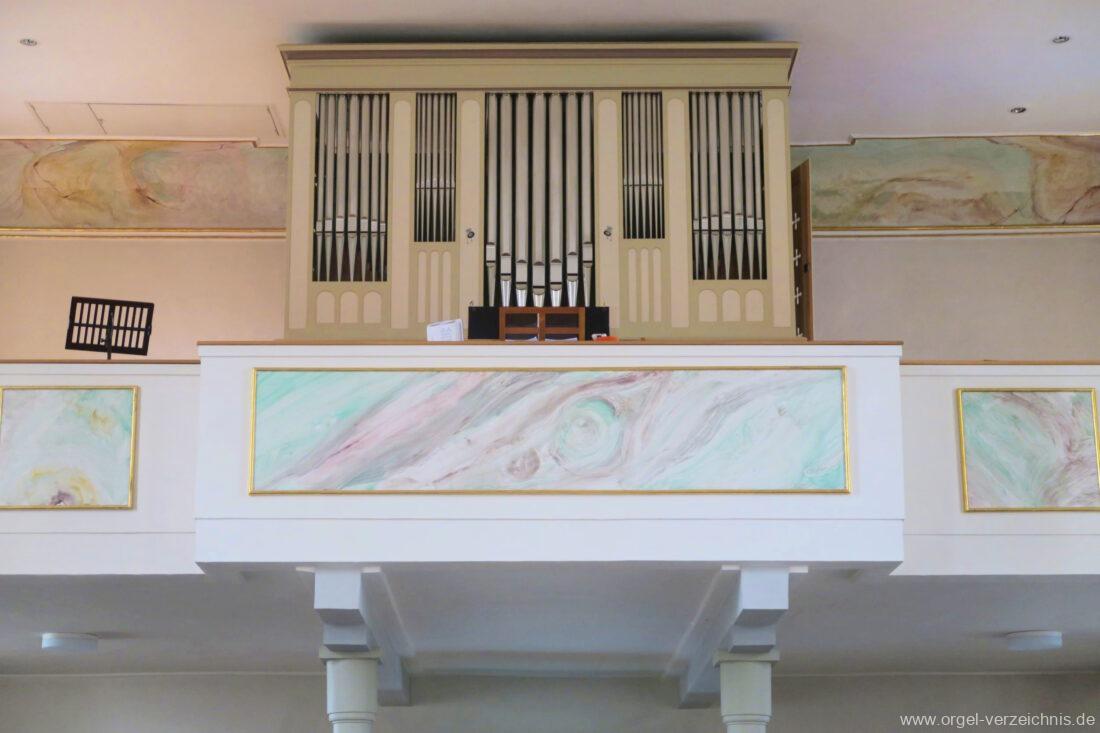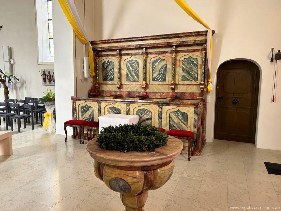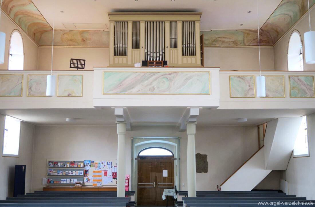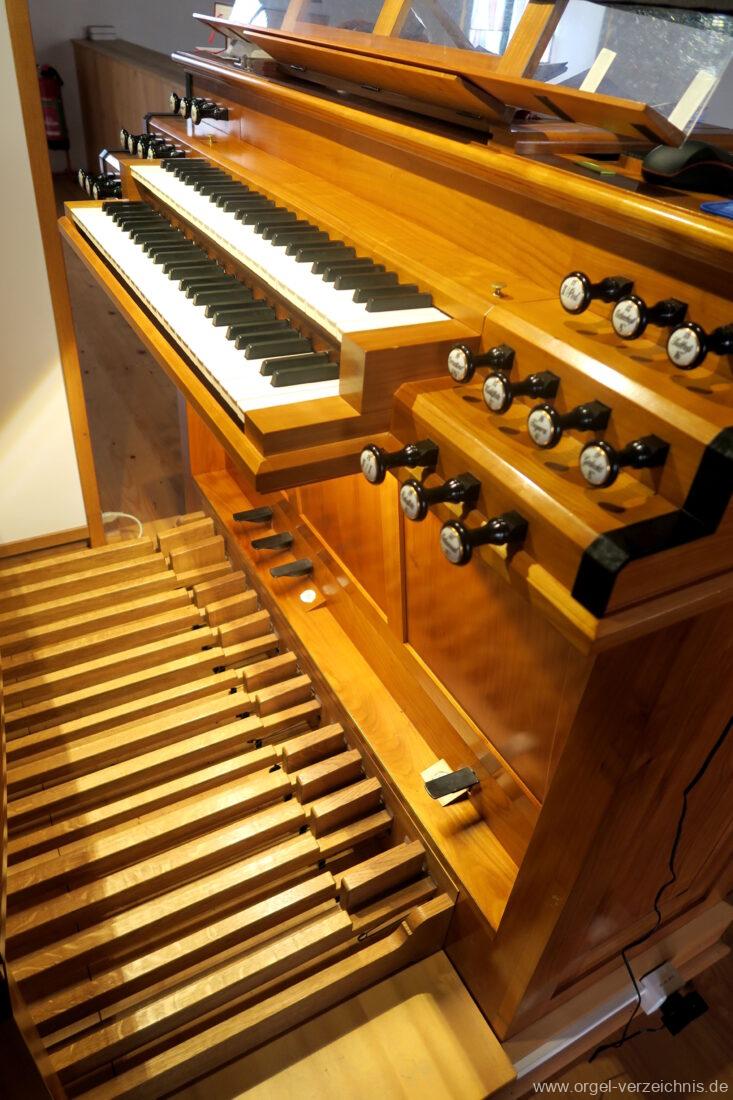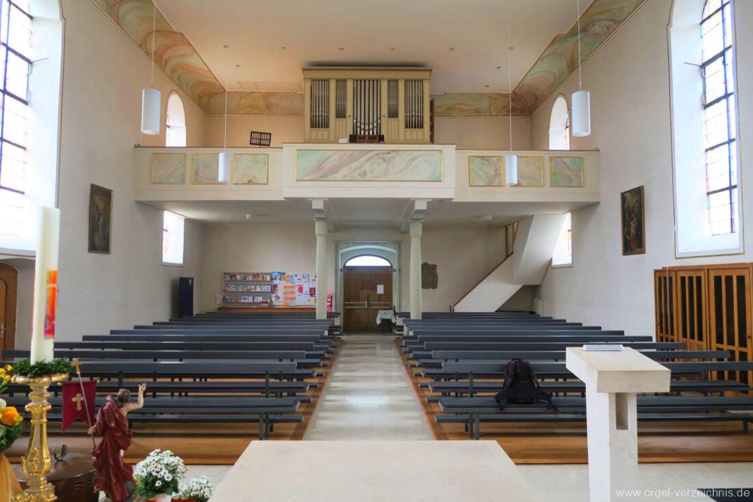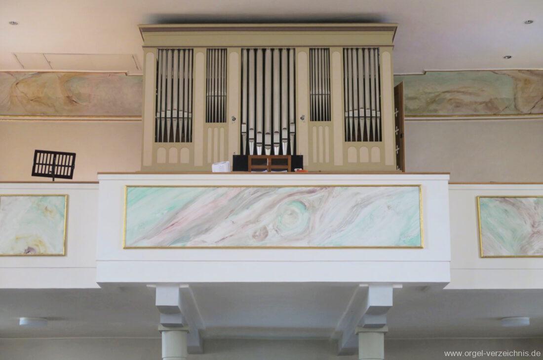 2015 Schleifladenorgel mit mittig freistehendem Spieltisch (Blickrichtung Chor) und mechanischer Traktur, erbaut unter Verwendung des Hieber-Gehäuses und des vorhandenen historischen Pfeifenmateriales und einiger Register von 1938 durch Orgelbau Wolfram Stützle (Waldkirch/Breisgau) II/17. Die ursprüngliche Tretanlage wird bei der Massnahme rekonstruiert und das Gehäuse mit neuer Farbfassung restauriert und verlängert – Einweihung mit OSV Georg Koch am 11. Oktober 2015. Bei der Einweihung wurden Werke von Johann Christian Kittel, Justin Heinrich Knecht, Josef Gabriel Rheinberger, Johann Sebastian Bach, Gustav Adolf Merkel, Heitor Villa-Lobos und Christian Heinrich Rinck dargeboten.