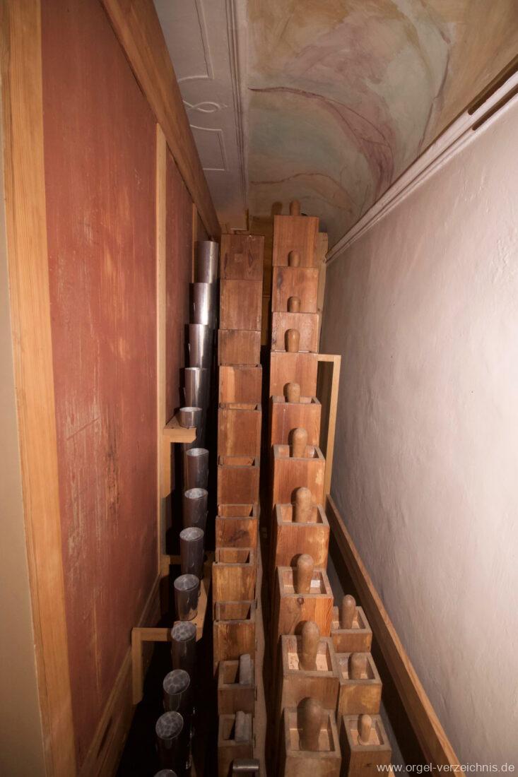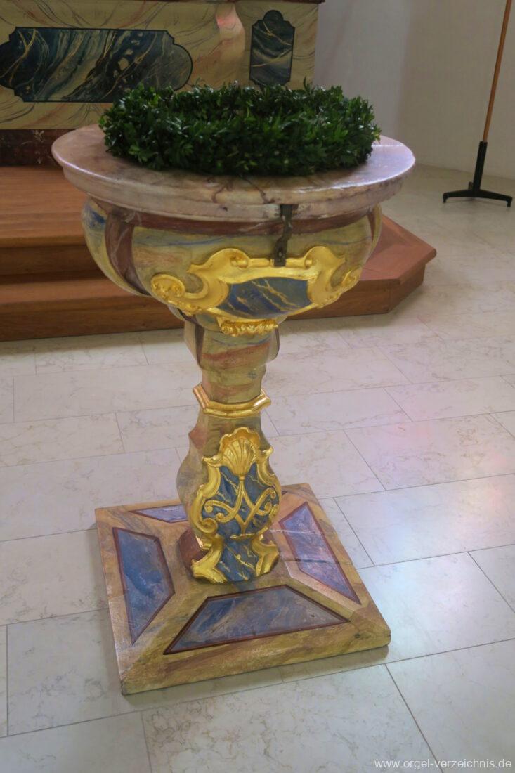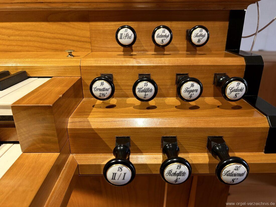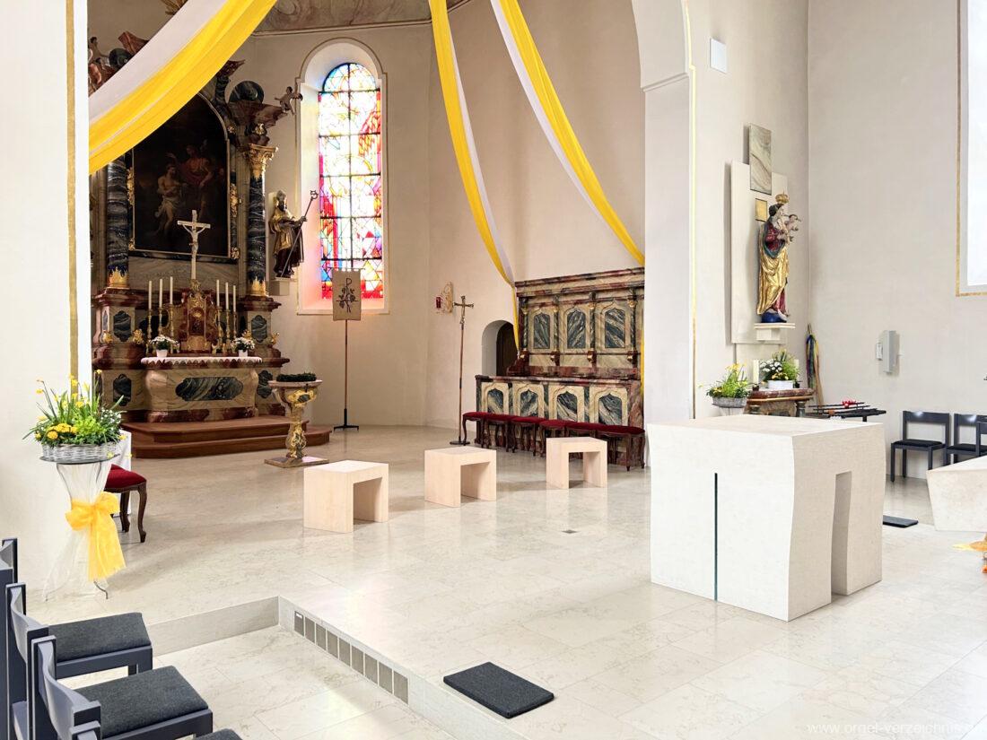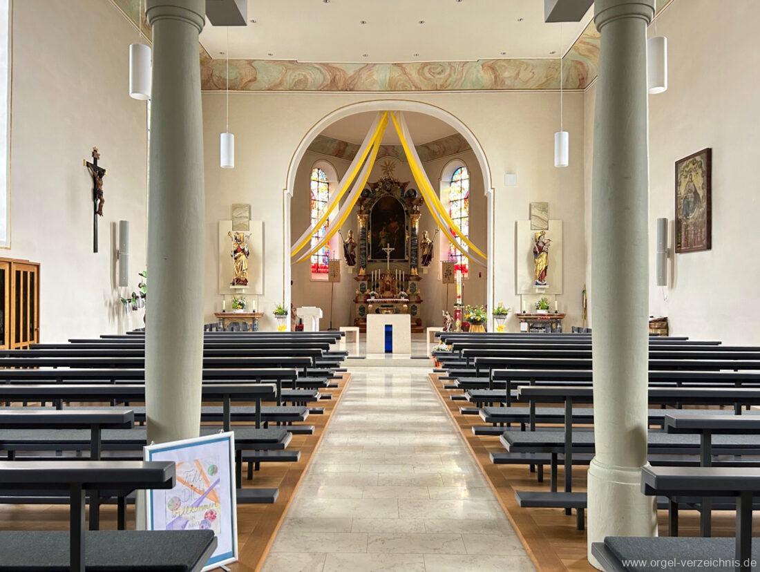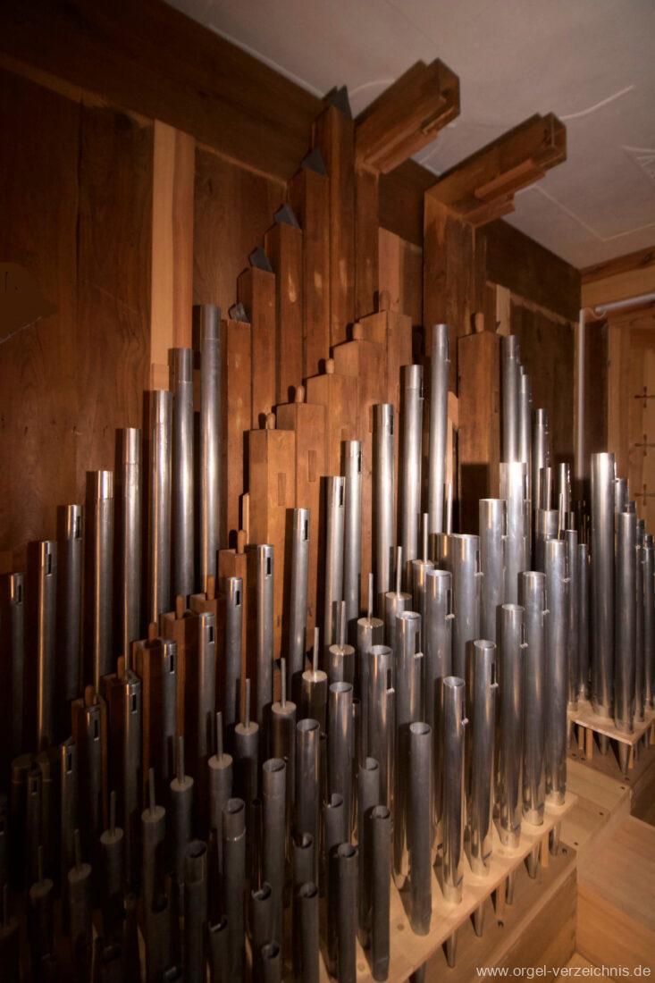 2015 Schleifladenorgel mit mittig freistehendem Spieltisch (Blickrichtung Chor) und mechanischer Traktur, erbaut unter Verwendung des Hieber-Gehäuses und des vorhandenen historischen Pfeifenmateriales und einiger Register von 1938 durch Orgelbau Wolfram Stützle (Waldkirch/Breisgau) II/17. Die ursprüngliche Tretanlage wird bei der Massnahme rekonstruiert und das Gehäuse mit neuer Farbfassung restauriert und verlängert – Einweihung mit OSV Georg Koch am 11. Oktober 2015. Bei der Einweihung wurden Werke von Johann Christian Kittel, Justin Heinrich Knecht, Josef Gabriel Rheinberger, Johann Sebastian Bach, Gustav Adolf Merkel, Heitor Villa-Lobos und Christian Heinrich Rinck dargeboten.