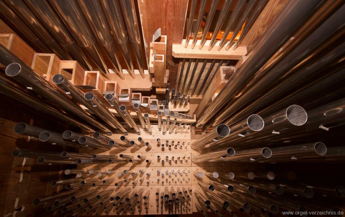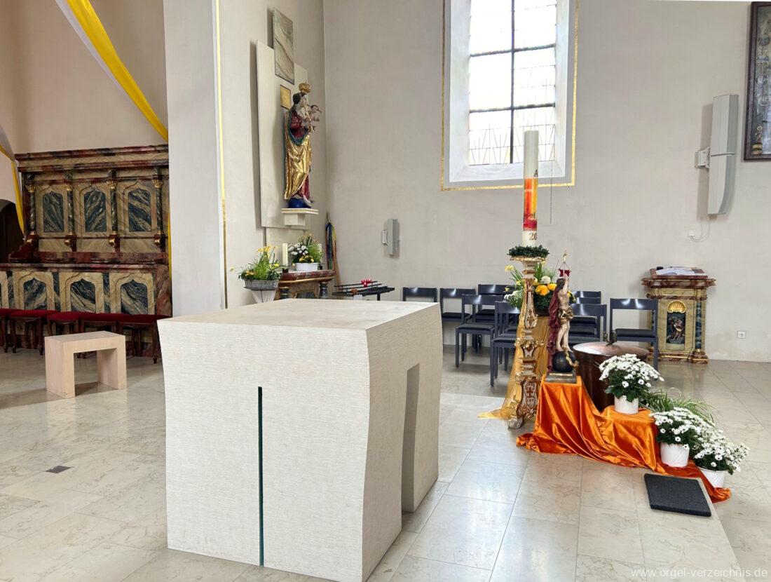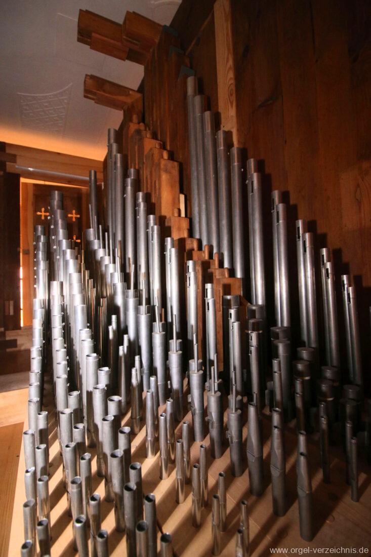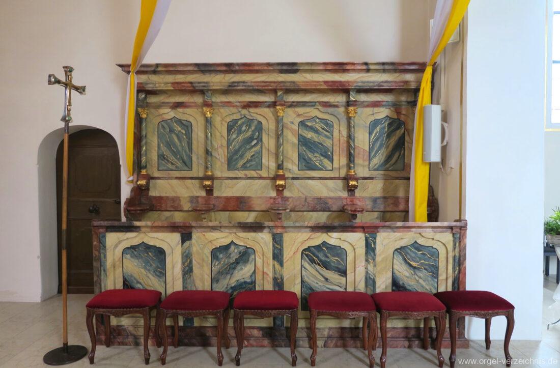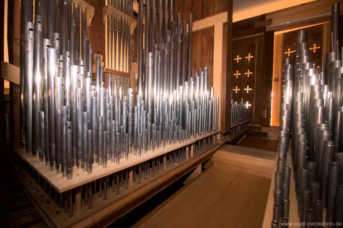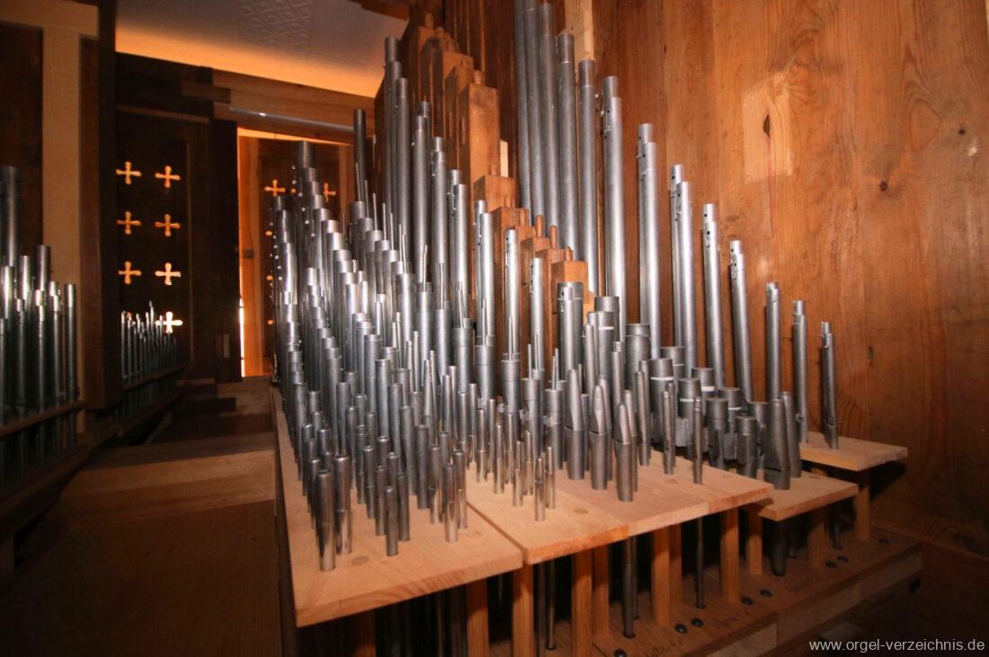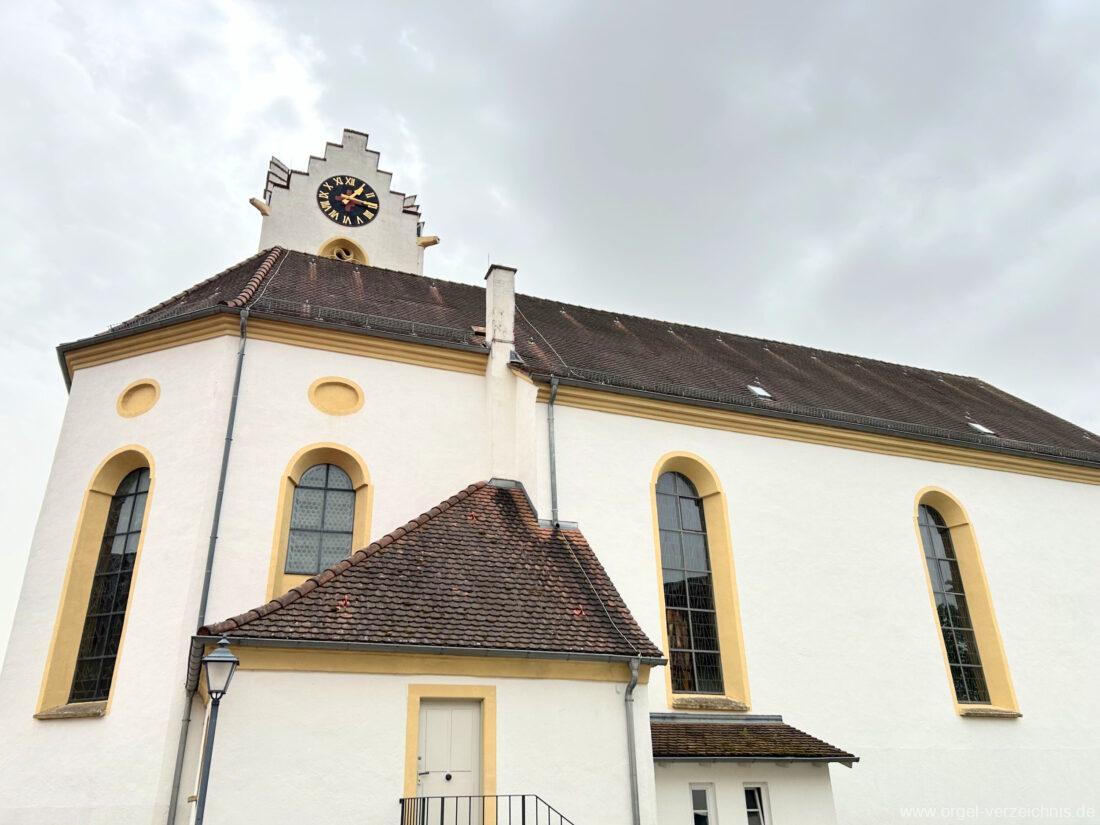 2015 Schleifladenorgel mit mittig freistehendem Spieltisch (Blickrichtung Chor) und mechanischer Traktur, erbaut unter Verwendung des Hieber-Gehäuses und des vorhandenen historischen Pfeifenmateriales und einiger Register von 1938 durch Orgelbau Wolfram Stützle (Waldkirch/Breisgau) II/17. Die ursprüngliche Tretanlage wird bei der Massnahme rekonstruiert und das Gehäuse mit neuer Farbfassung restauriert und verlängert – Einweihung mit OSV Georg Koch am 11. Oktober 2015. Bei der Einweihung wurden Werke von Johann Christian Kittel, Justin Heinrich Knecht, Josef Gabriel Rheinberger, Johann Sebastian Bach, Gustav Adolf Merkel, Heitor Villa-Lobos und Christian Heinrich Rinck dargeboten.