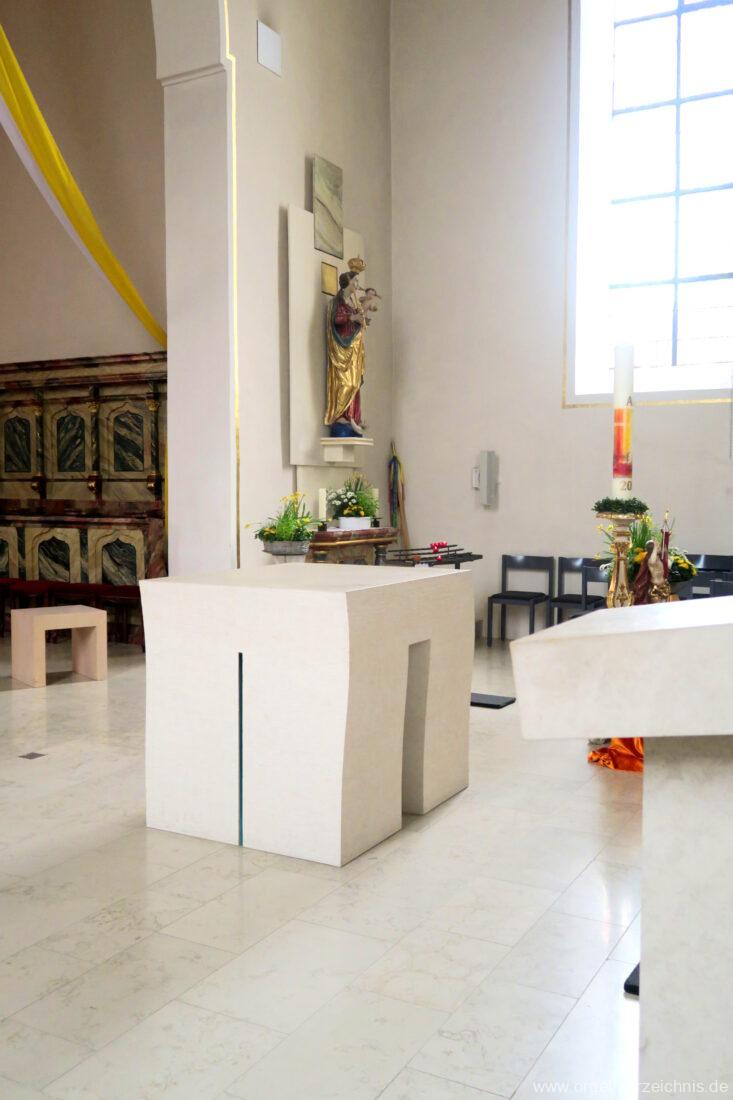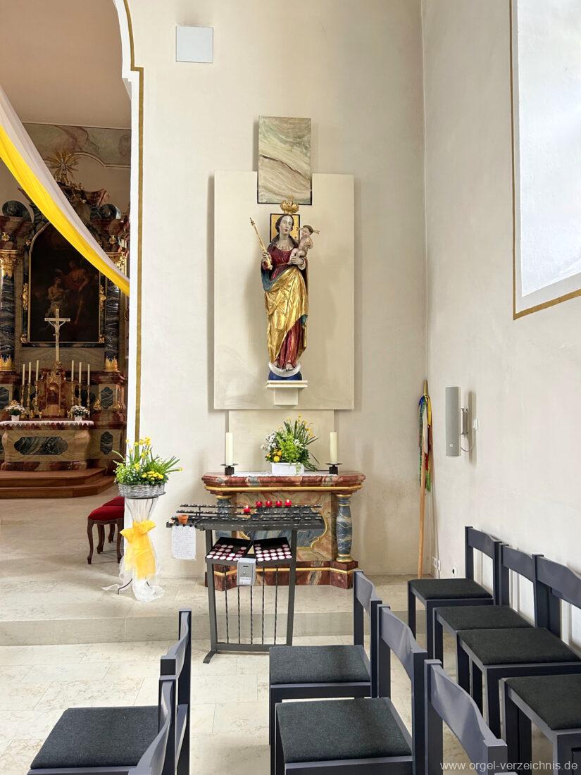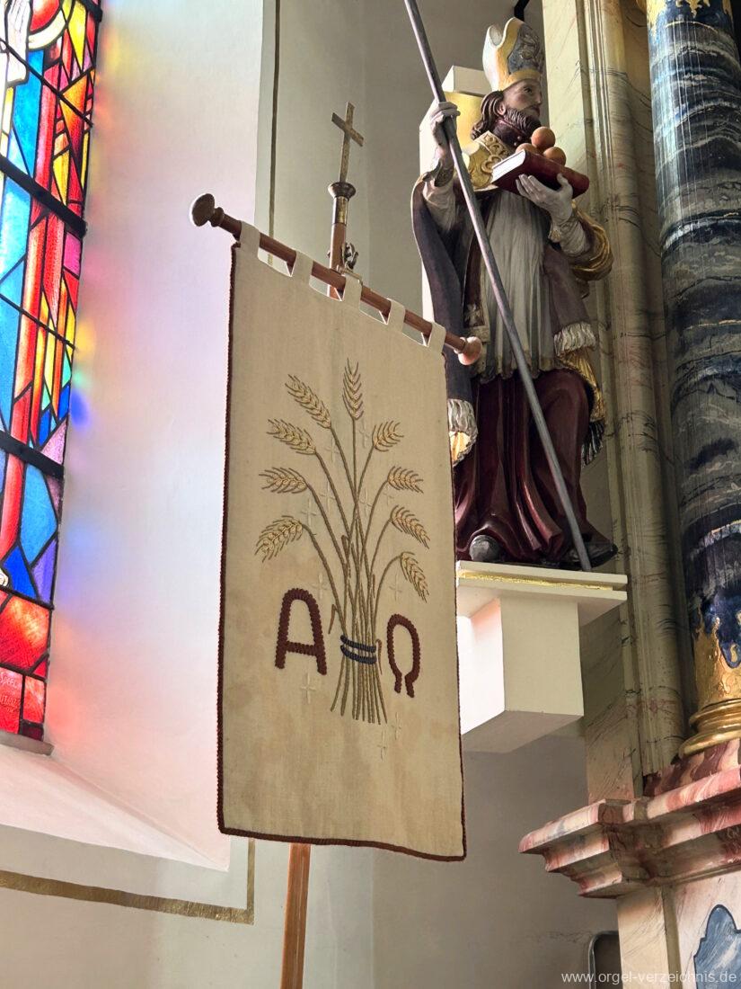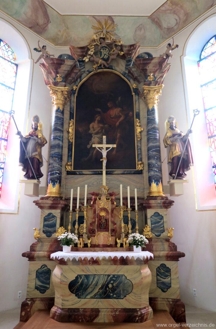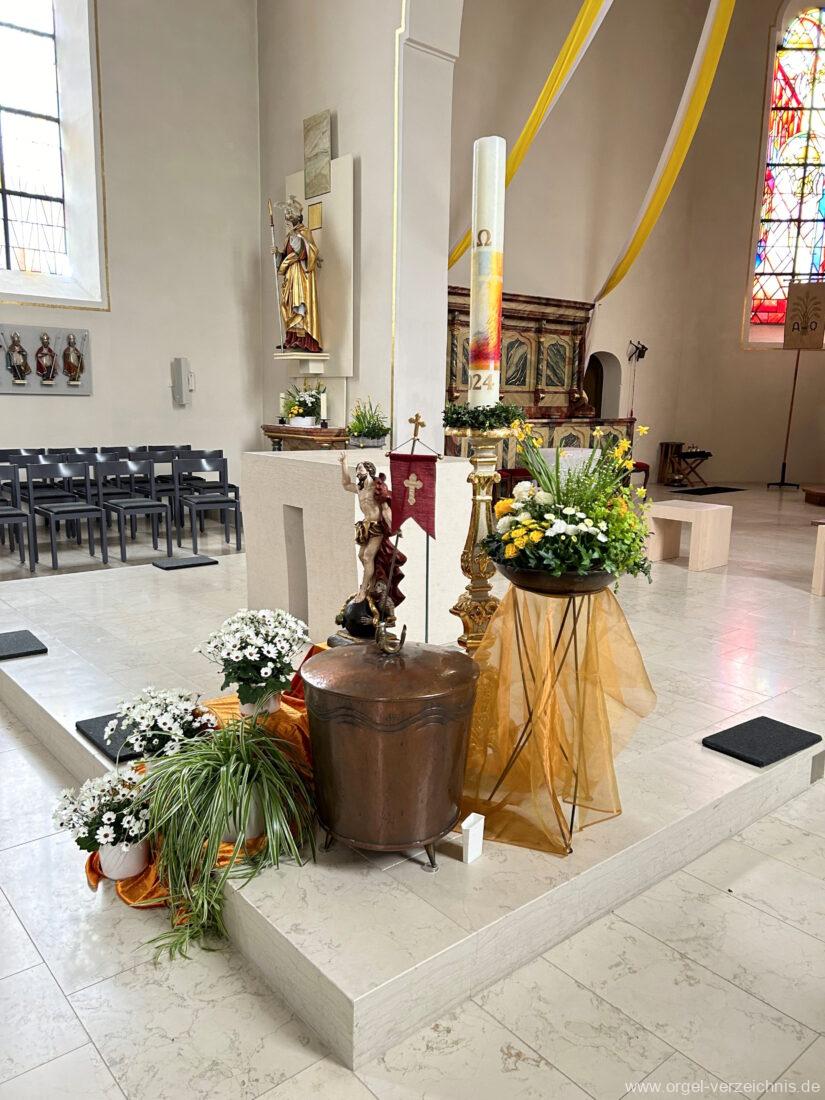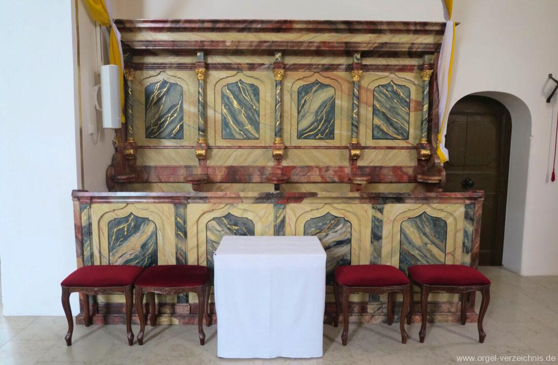 2015 Schleifladenorgel mit mittig freistehendem Spieltisch (Blickrichtung Chor) und mechanischer Traktur, erbaut unter Verwendung des Hieber-Gehäuses und des vorhandenen historischen Pfeifenmateriales und einiger Register von 1938 durch Orgelbau Wolfram Stützle (Waldkirch/Breisgau) II/17. Die ursprüngliche Tretanlage wird bei der Massnahme rekonstruiert und das Gehäuse mit neuer Farbfassung restauriert und verlängert – Einweihung mit OSV Georg Koch am 11. Oktober 2015. Bei der Einweihung wurden Werke von Johann Christian Kittel, Justin Heinrich Knecht, Josef Gabriel Rheinberger, Johann Sebastian Bach, Gustav Adolf Merkel, Heitor Villa-Lobos und Christian Heinrich Rinck dargeboten.