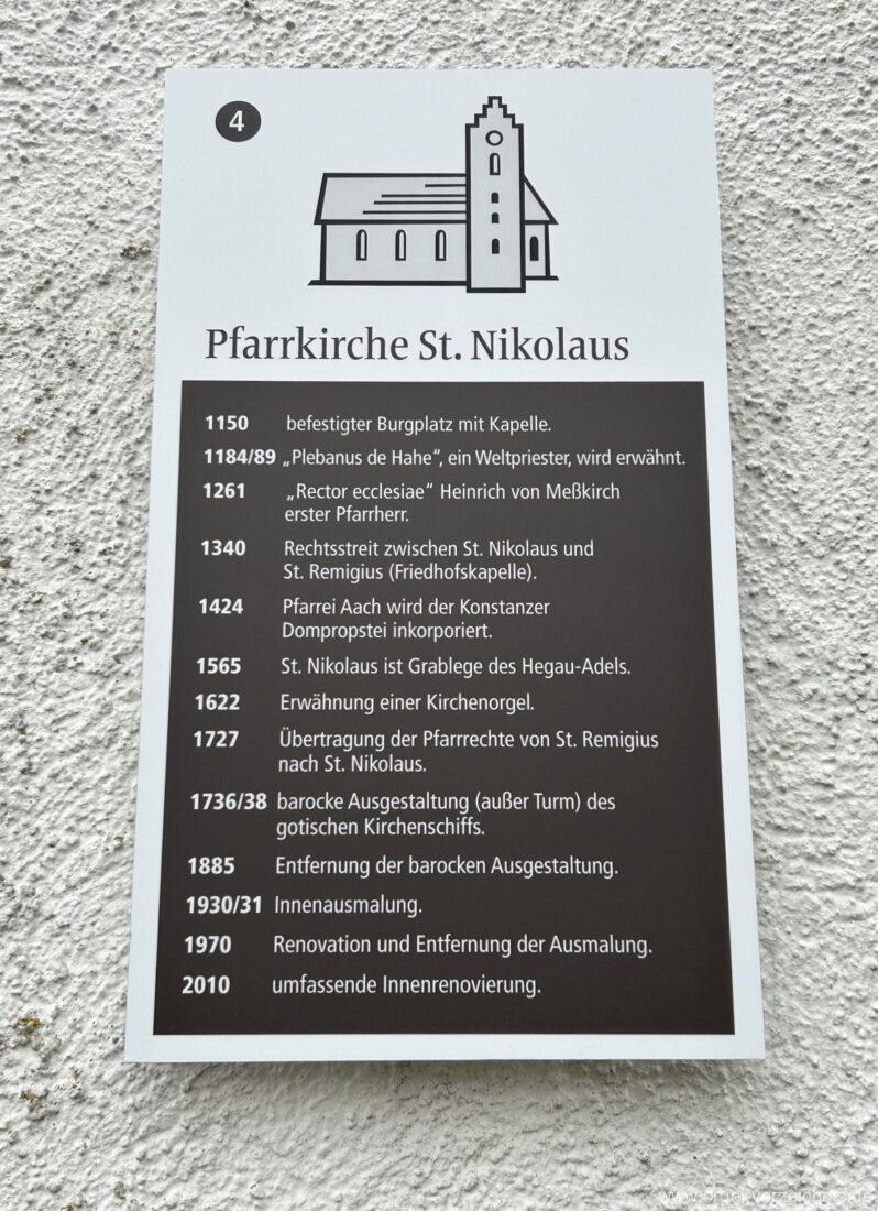Kirchengeschichte: Angabe der Kirchgemeinde vor Ort – Geschichtstafeln, zitiert aus der Zeitaufstellung der Broschüre „Orgelweihe Stadtkirche St. Nikolaus Aach“ 11. Oktober 2015 (Autoren P.Späth und W.Hornstein) und von den Seiten der Kirchgemeinde (Link folgend).