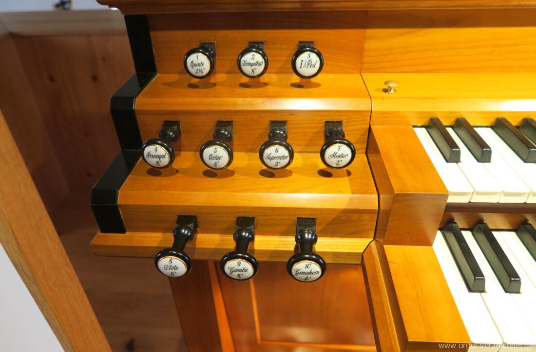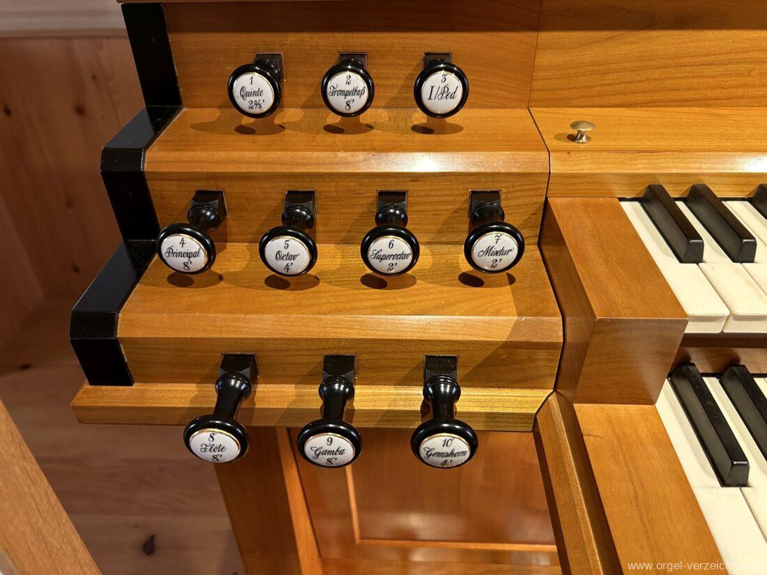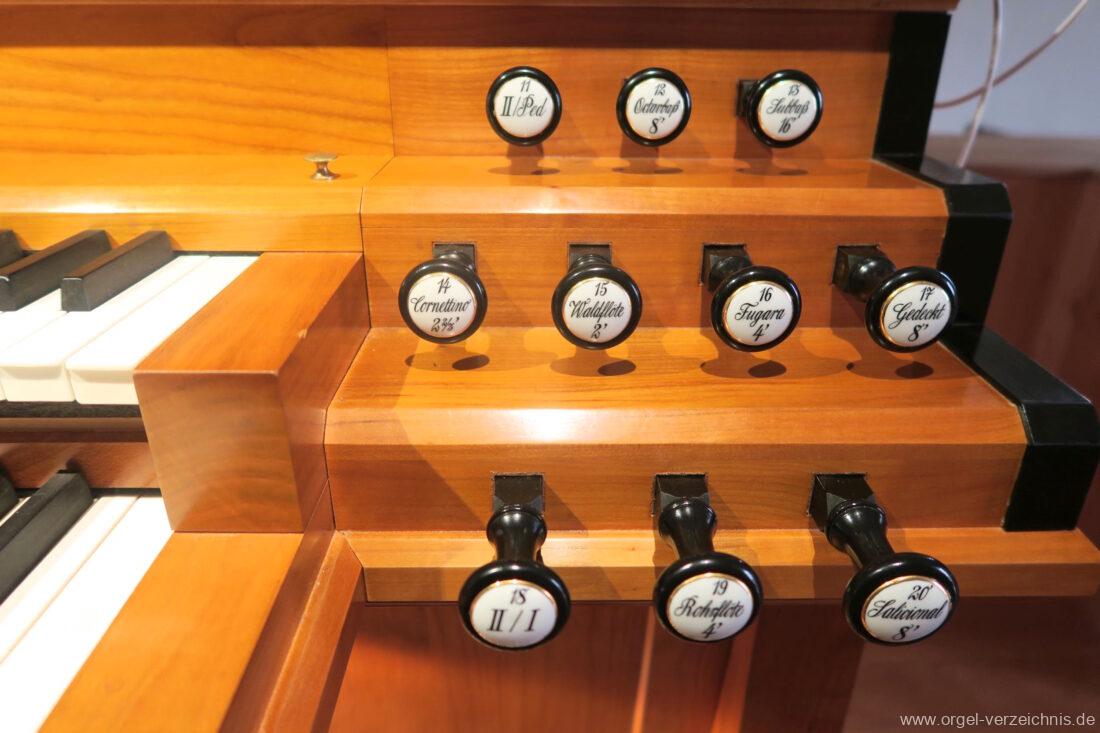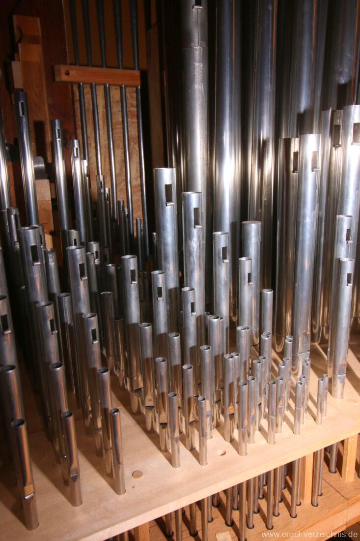 I Hauptwerk C – f“‘Principal 8′ C – E Holz offen, F – ds“ Prospekt neu, ab e“ Hieber Flöte 8′ Doppelflöte, C – e° Holz ged. 1938, ab f° Holz offen, doppelt labiiert Hieber Gamba 8′ Metall, C – H Rollbart Holz, ab c° Streichbart, neu Octav 4′ C – GS neu, ab A Hieber Gemshorn 4′ Metall konisch, C – f° neu, fs° – f“‘ Hieber aus Quintchor der ehem. Mixtur Quinte 2 2/3′ C – h° ged., ab c‘ offen Superoctav 2′ neu, Metall Mixtur 2′ IV – rep. c°/c’/c“, neu