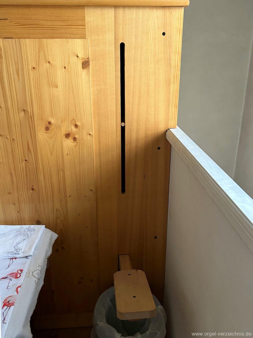 Fuß: II / I, II/Ped., I/Ped. als Hebeltritte auf der linken Seite, Tremulant als Hebeltritt auf der rechten Seite (auf das gesamte Werk wirkend)