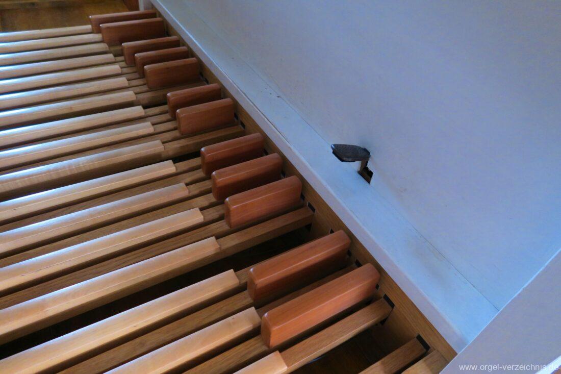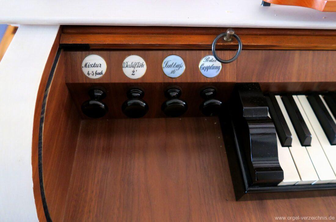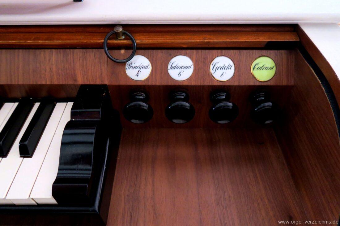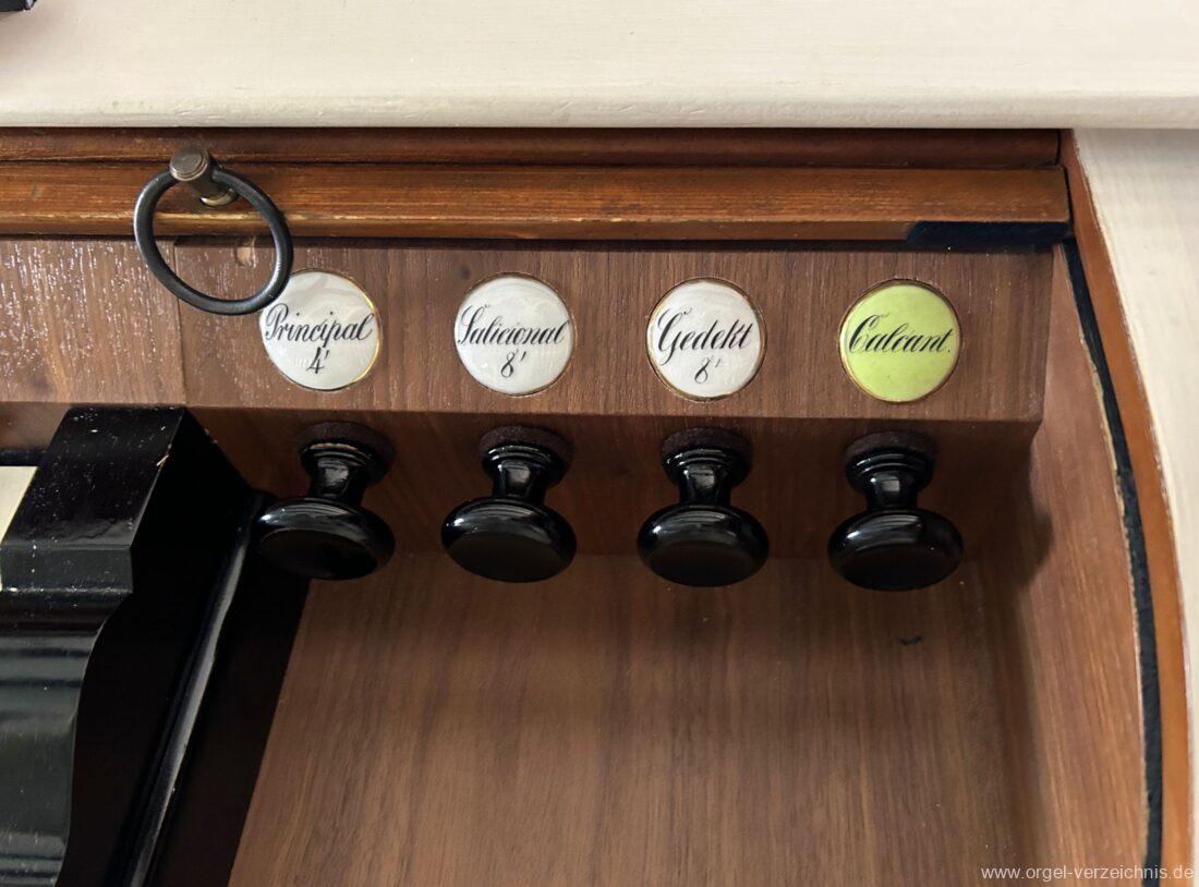 Manual C – f“‘Gedekt 8′ Holz ged., ab c‘ innen labiiert Salicional 8′ C – H Holz offen, ab c° Metall Principal 4′ C – c° Prospekt, neu Waldflöte 2′ alt Mixtur 4-5 fach 1 1/3′ – rep. H/b°, ab H V