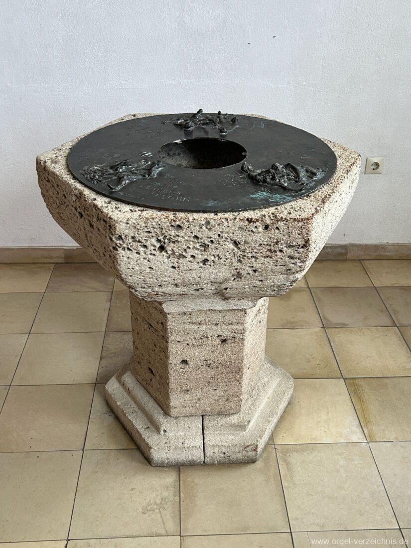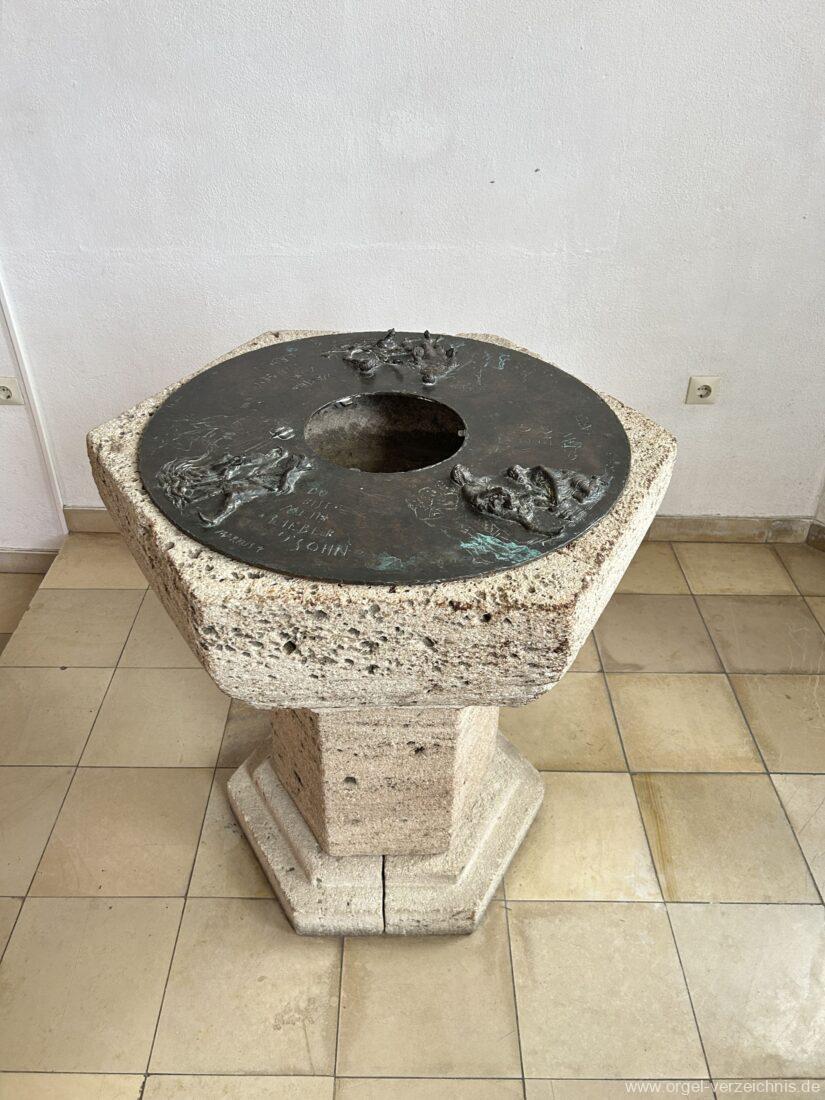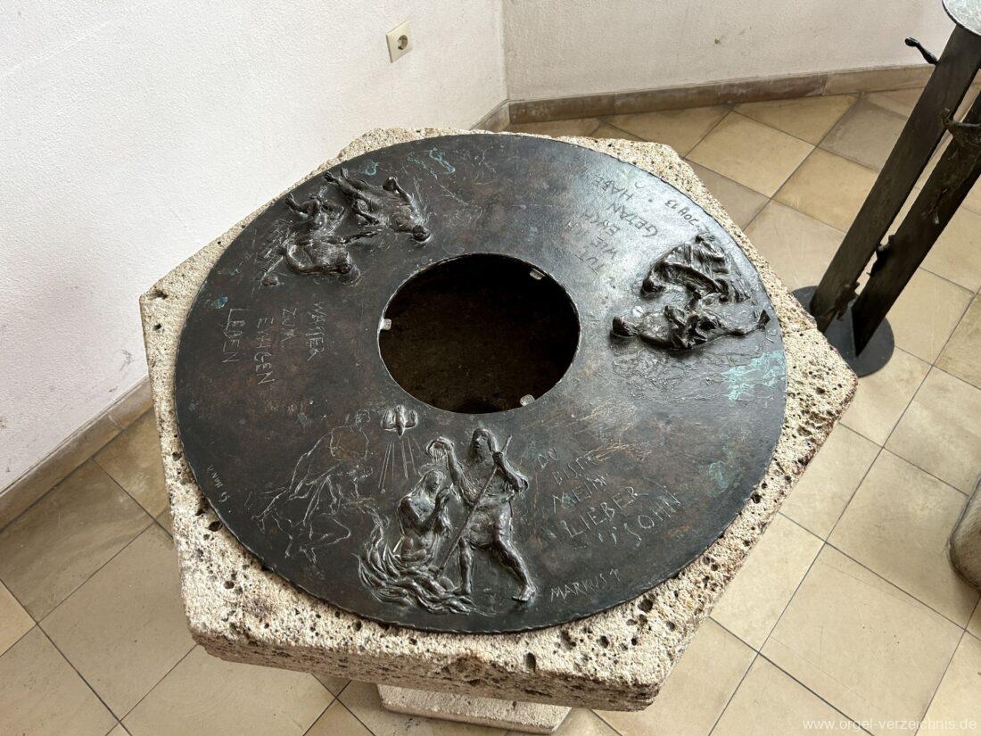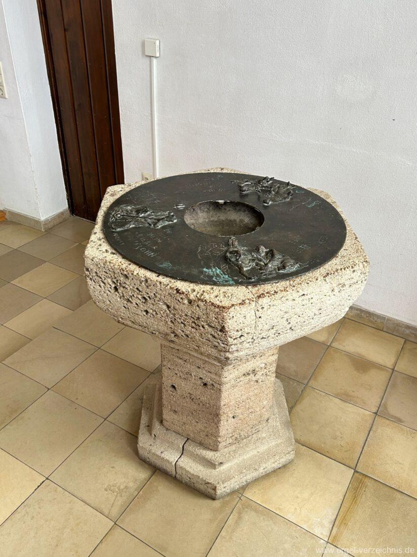 1985 neuer Bronzedeckel des Taufsteines von Bildhauer Karl Ulrich Nuss (Strümpfelbach).