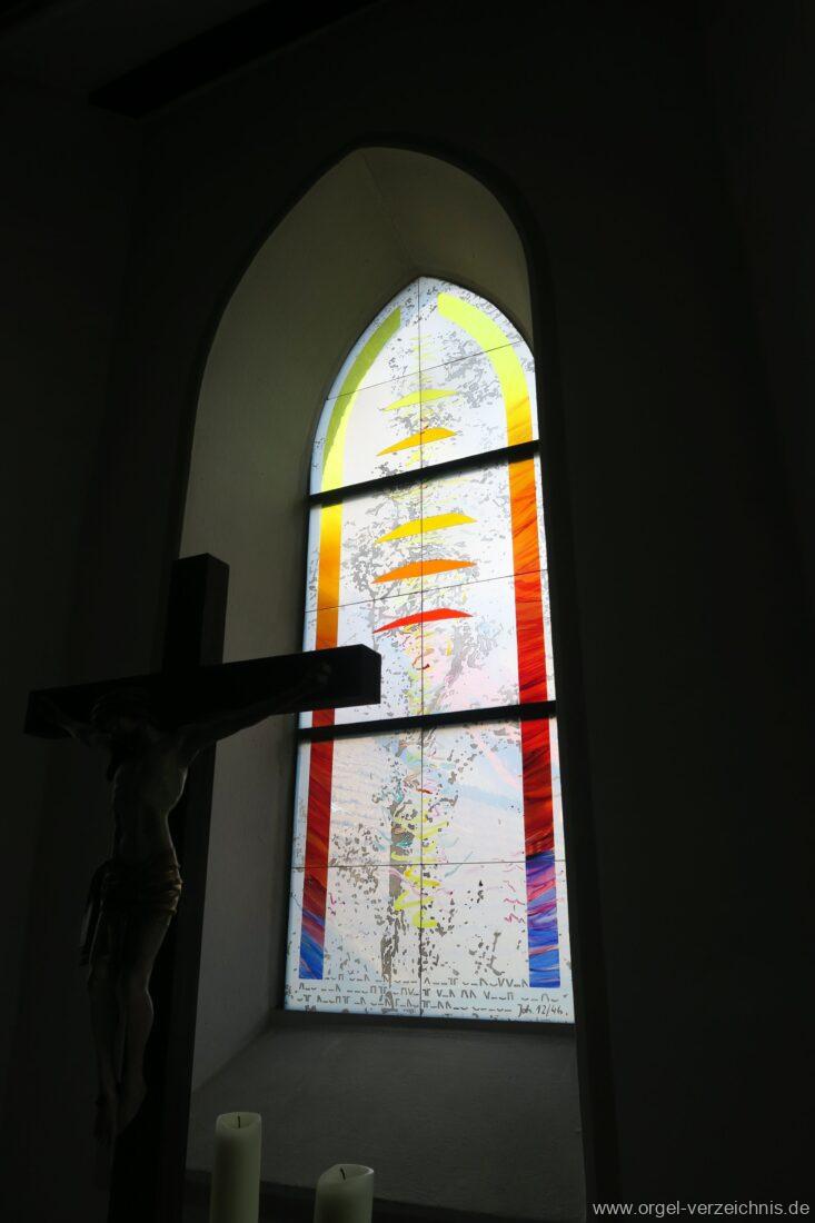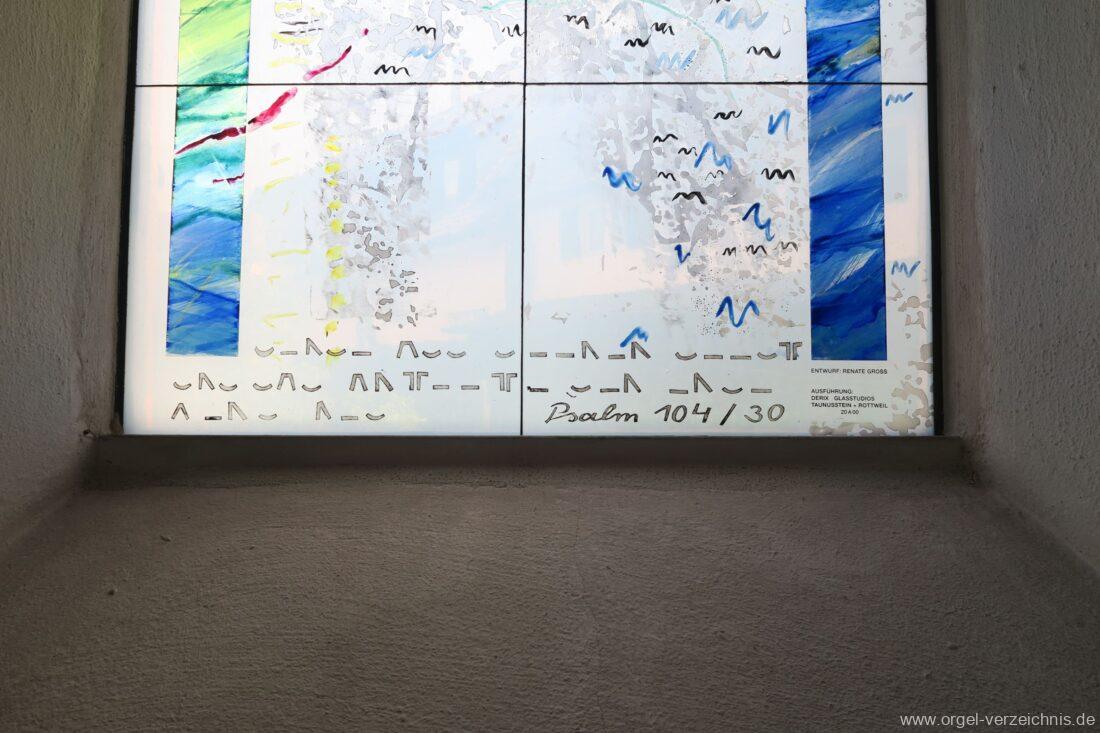 1999/2000 neue Chorfenster mit Glasmalereien im Zuge einer Renovierung von der Künstlerin Renate Groß – Ausführung Derix Glasstudios (Taunusstein/Rottweil).