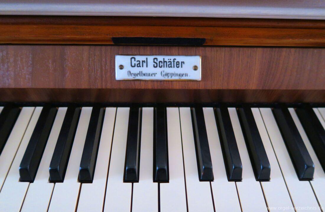 1896 mechanische Kegelladenorgel mit mittig freistehendem Spieltisch vor Prospekt (Blickrichtung Chor), erbaut von Orgelbauer Carl Schäfer (Göppingen) I/6.