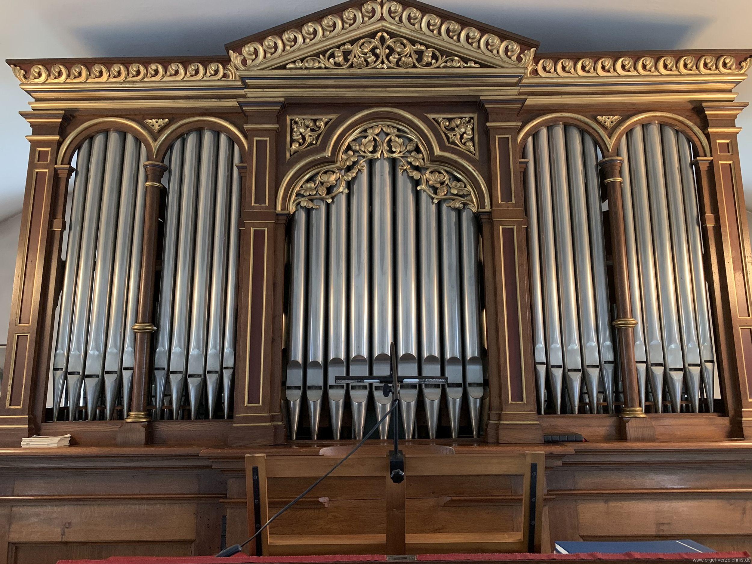 1893 mechanische Kegelladenorgel mit mittig freistehendem Spieltisch vor Prospekt, erbaut als Opus 111 von Friedrich I Goll (Luzern) II/10.
