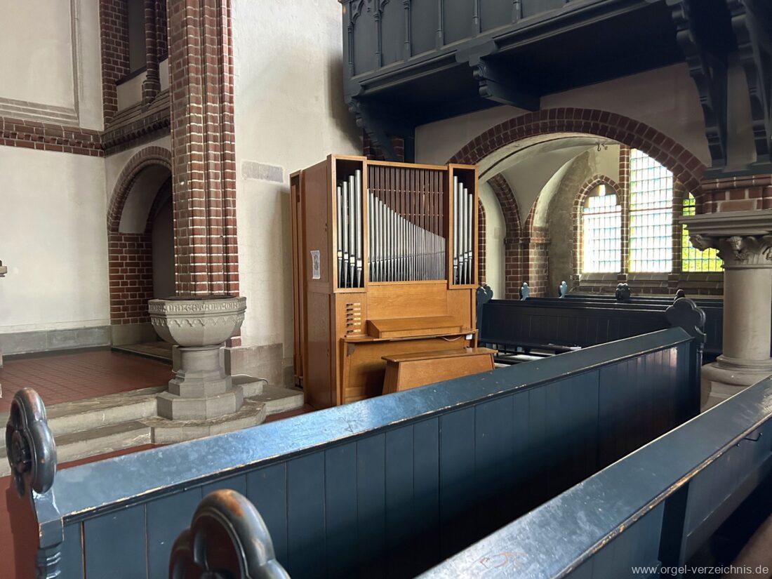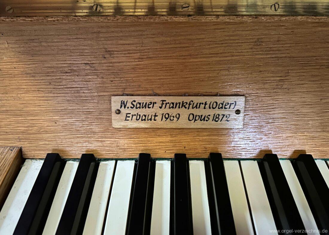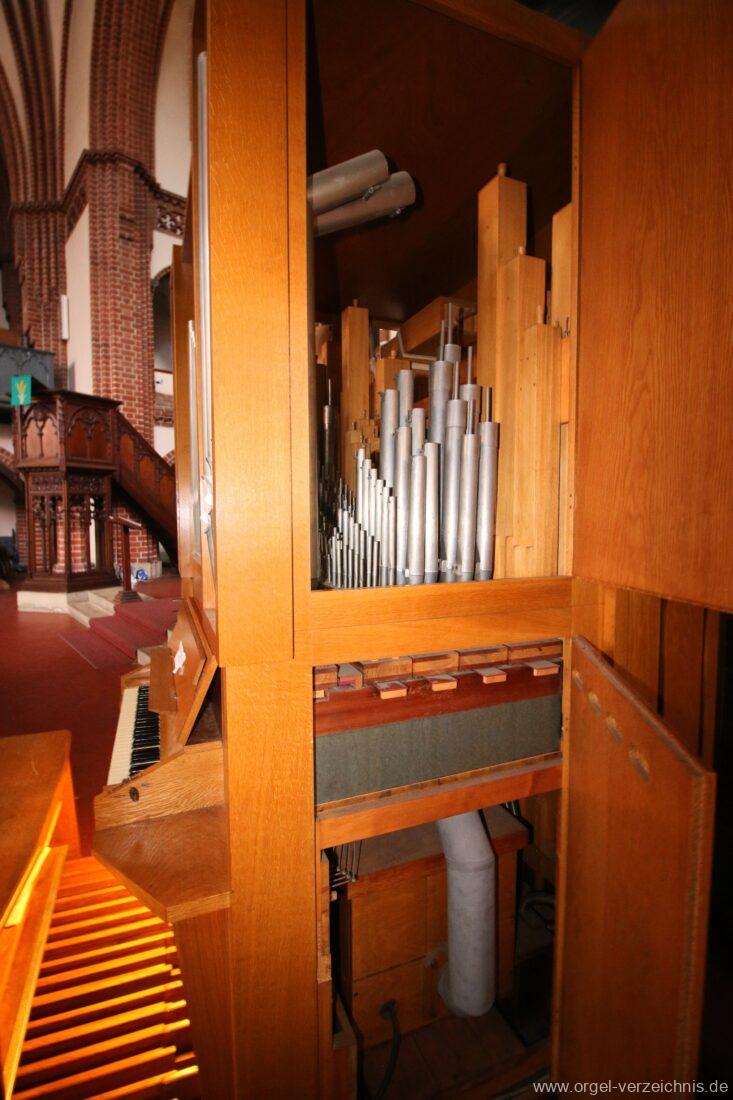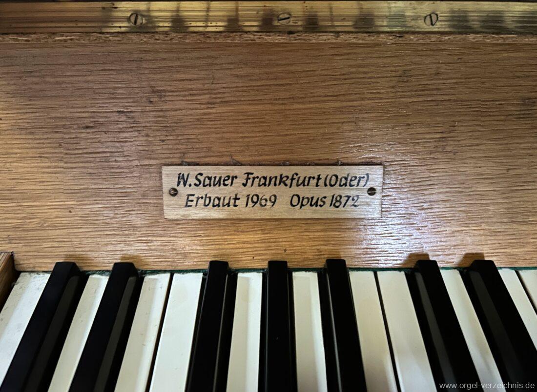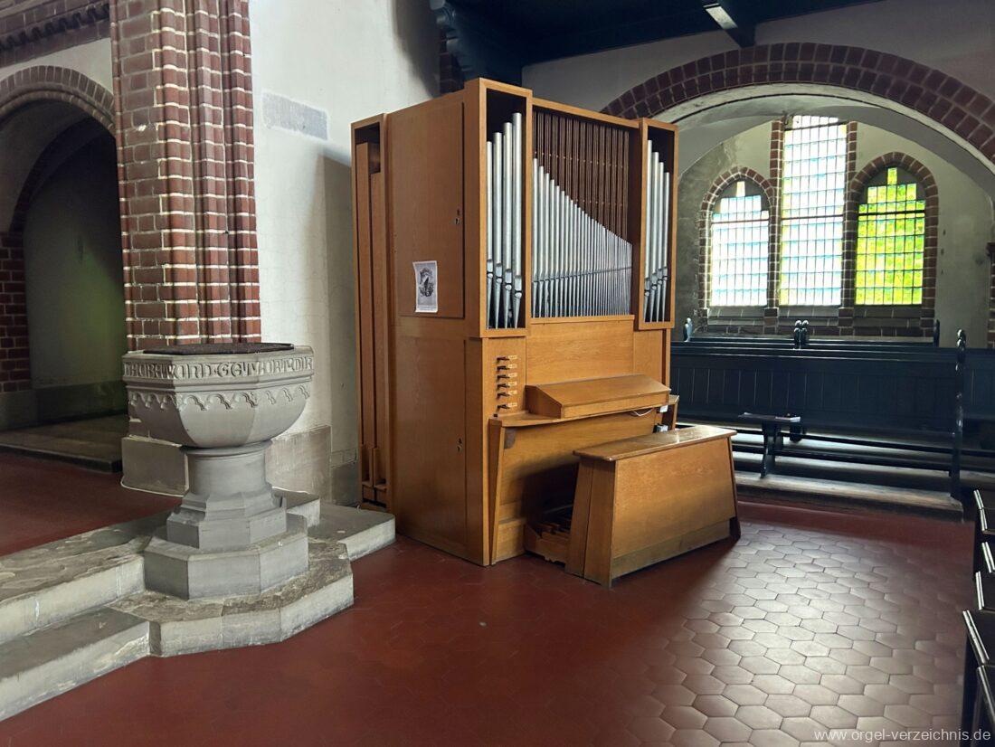 1969 mechanische Schleifladenorgel mit mittig fest ins Gehäuse eingelassenem Spieltisch, erbaut als Opus 1872 für das Gemeindehaus der St. Elisabethen-Kirche Berlin durch Orgelbau W. Sauer Frankfurt (Oder) I/6.