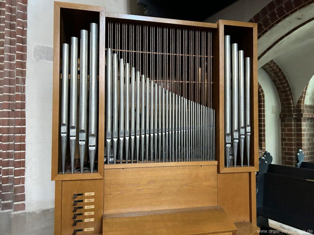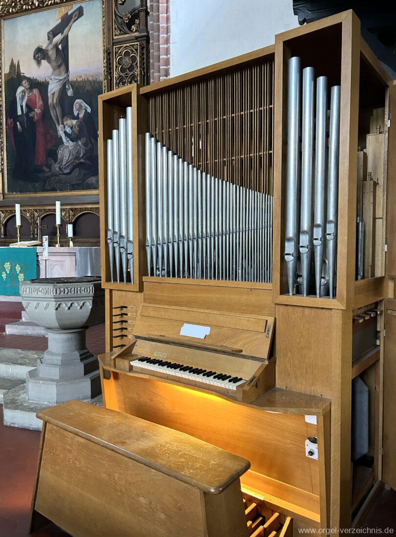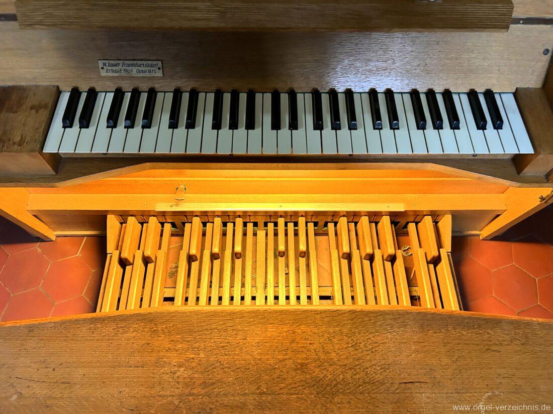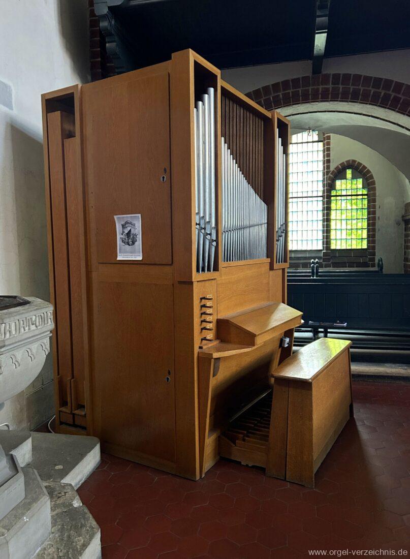 1969 mechanische Schleifladenorgel mit mittig fest ins Gehäuse eingelassenem Spieltisch, erbaut als Opus 1872 für das Gemeindehaus der St. Elisabethen-Kirche Berlin durch Orgelbau W. Sauer Frankfurt (Oder) I/6.