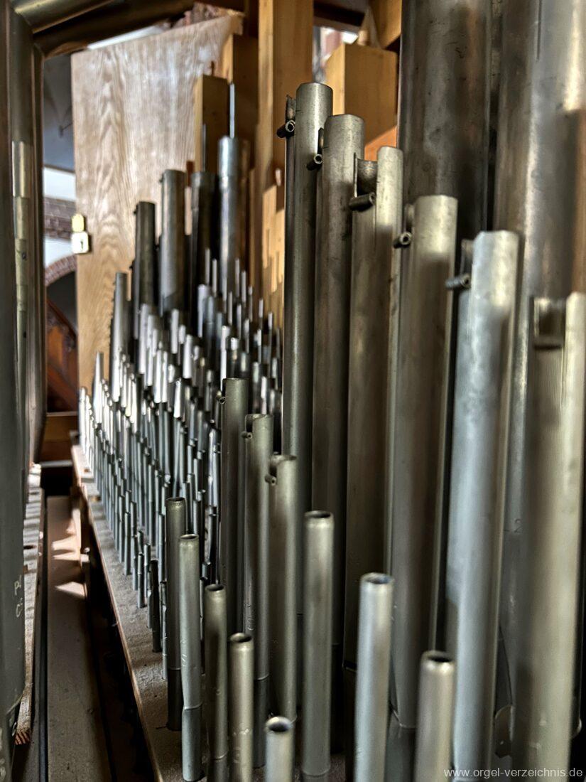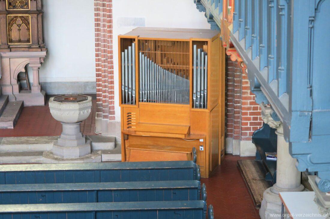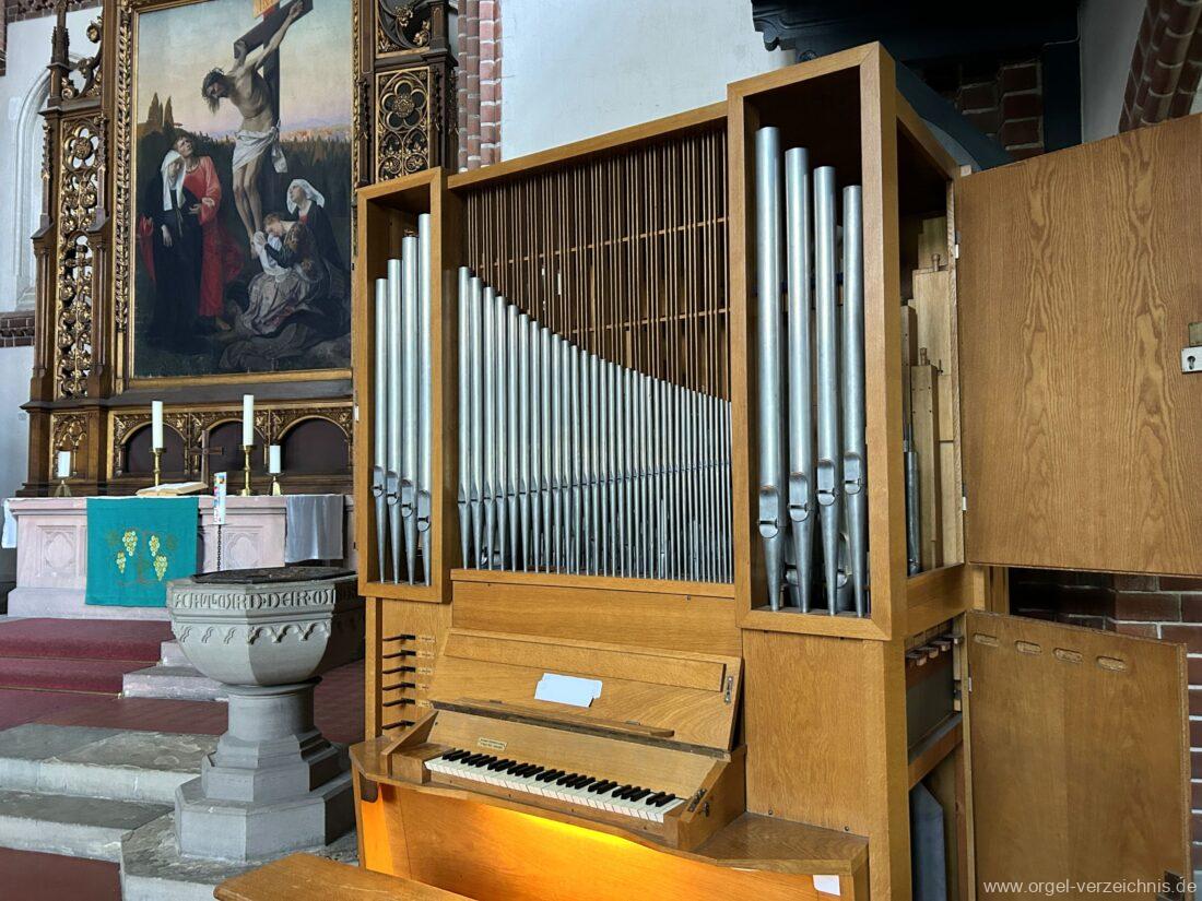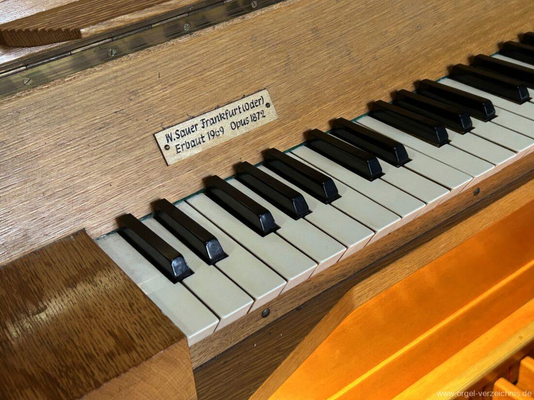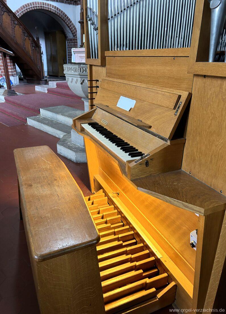 1969 mechanische Schleifladenorgel mit mittig fest ins Gehäuse eingelassenem Spieltisch, erbaut als Opus 1872 für das Gemeindehaus der St. Elisabethen-Kirche Berlin durch Orgelbau W. Sauer Frankfurt (Oder) I/6.