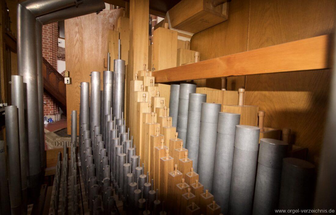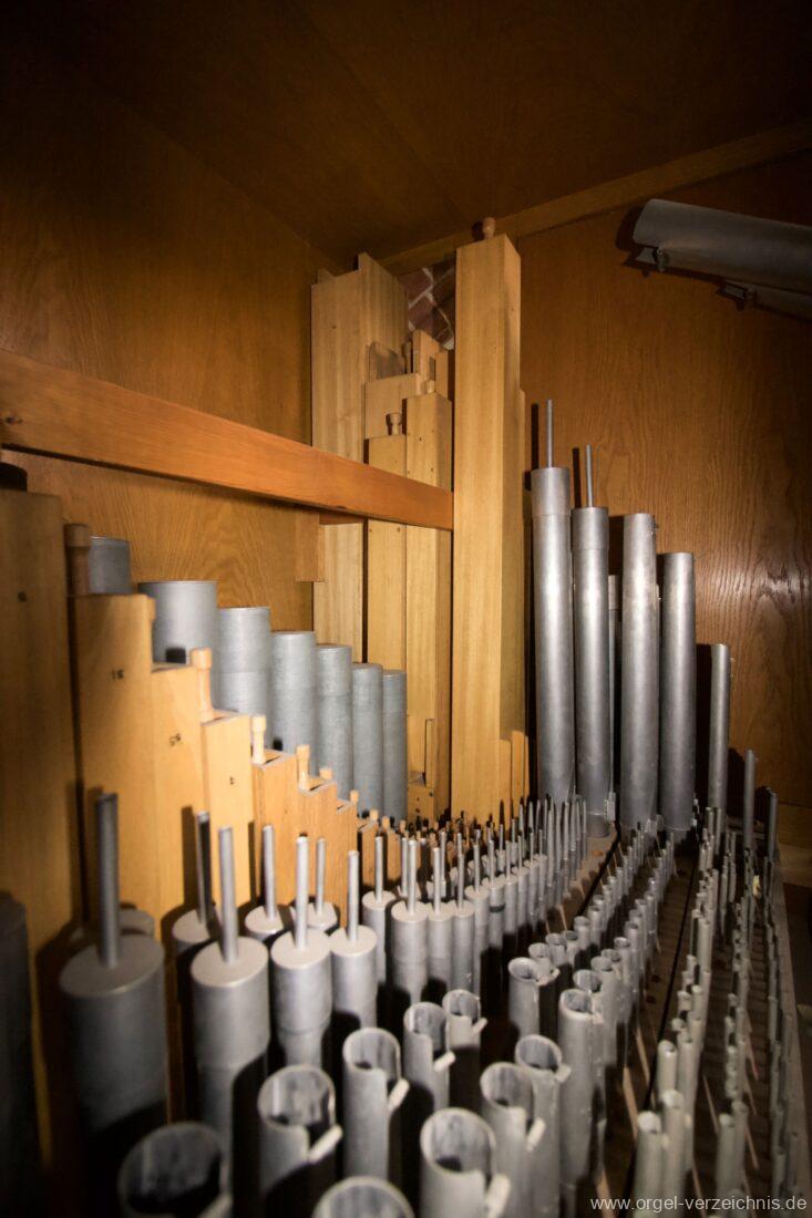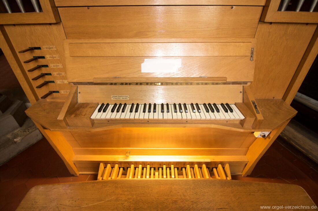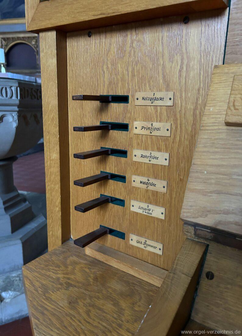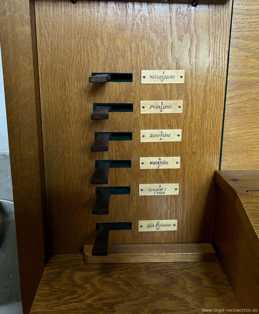 Manual C – f“‘Holzgedackt 8′ Holz ged. Prinzipal 4′ C – DS innen, Metall; E – d“‘ teilw. Prospekt – Anm. 1; ab ds“‘ innen, Metall Rohrflöte 4′ Metall rohrged.; ab fs“ offen, konisch Waldflöte 2′ Metall, leicht konisch Scharff 1′ 3-4 fach rep. c°/b°/a’/gs“/ds“‘, ab ds“‘ 4 fach!