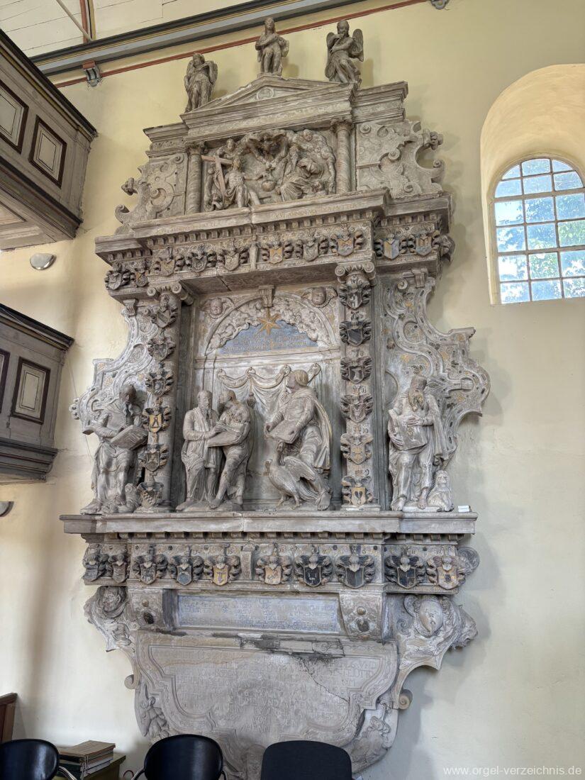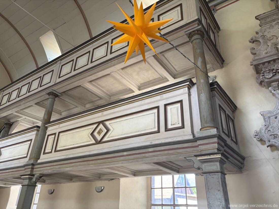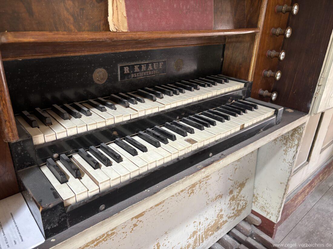 1888 (Dehio, S. 517) Neubau durch Robert Knauf (Bleicherode) – mechanische Schleifladenorgel II/15 mit Pedal hinter dem vorhandenen Gehäuse.