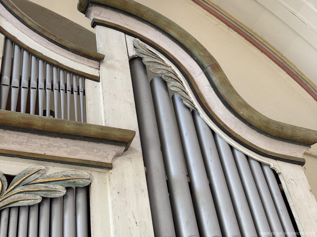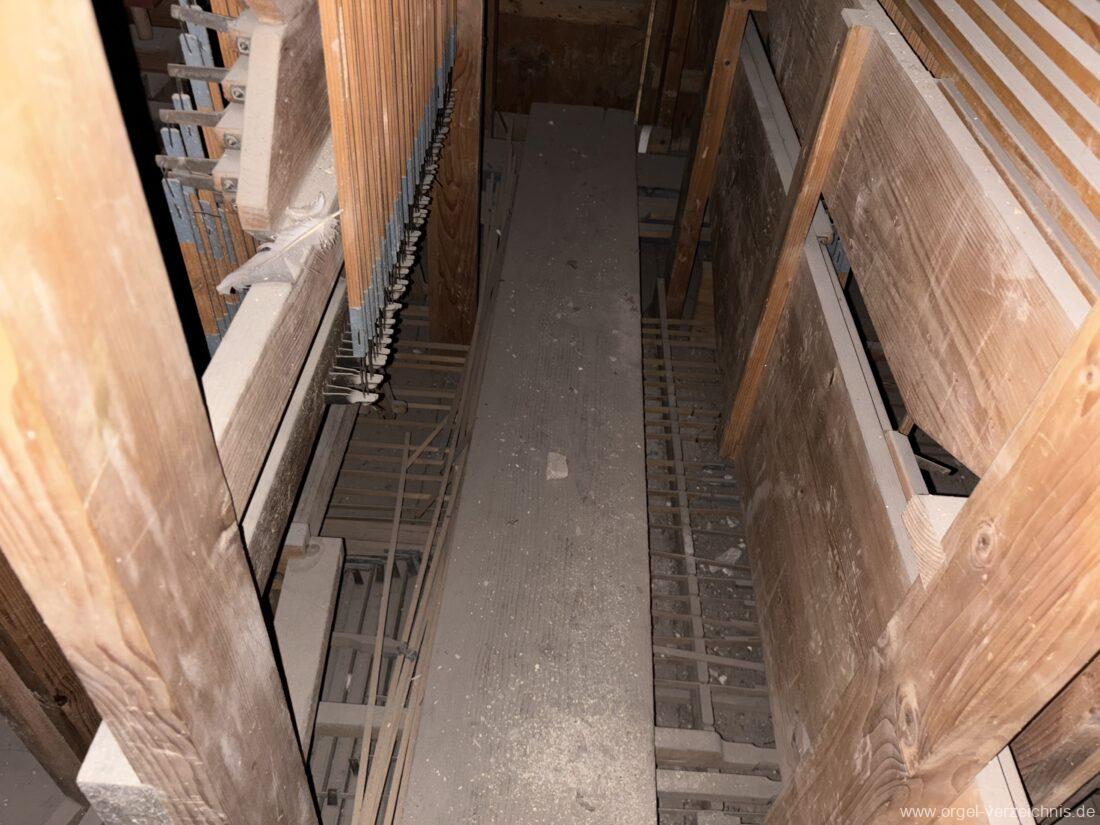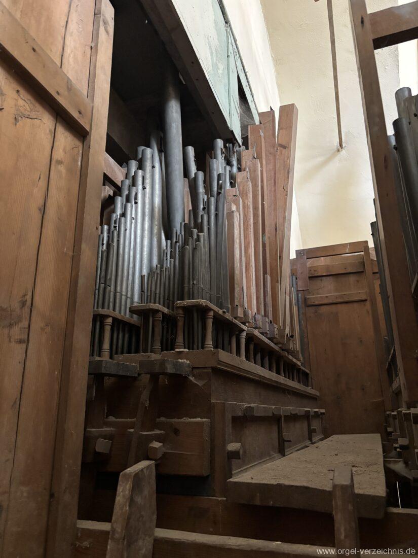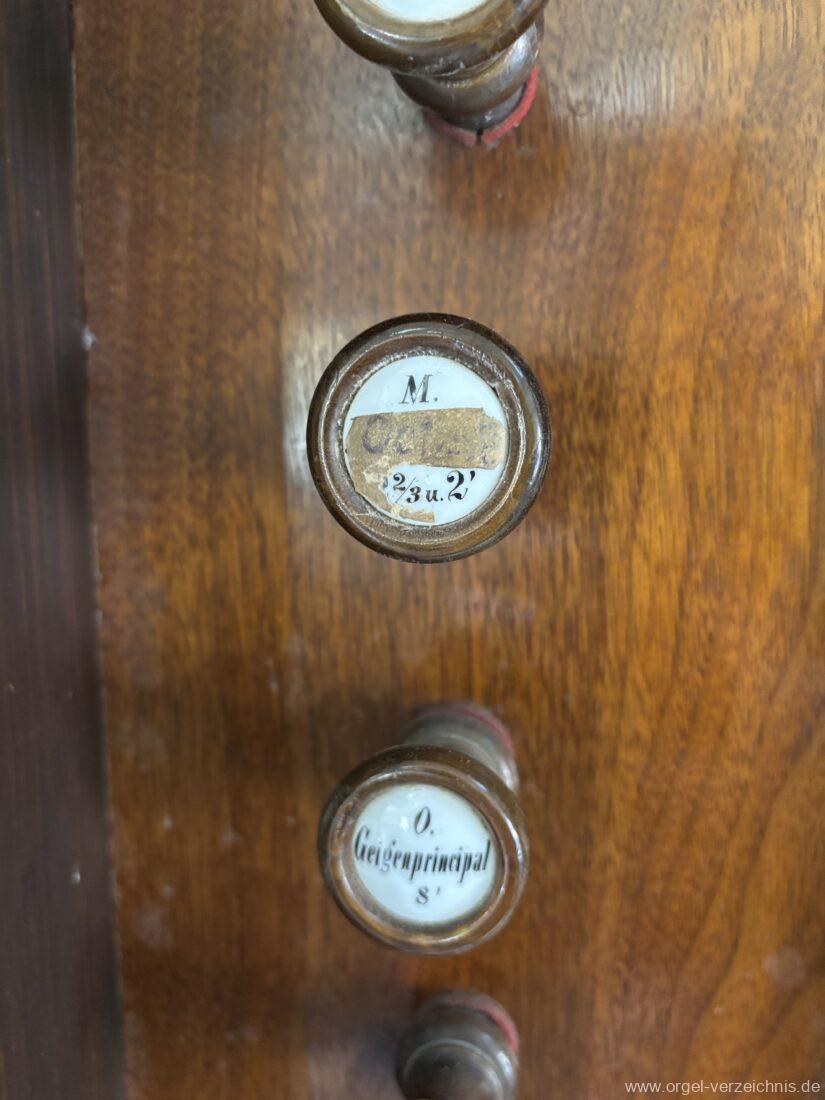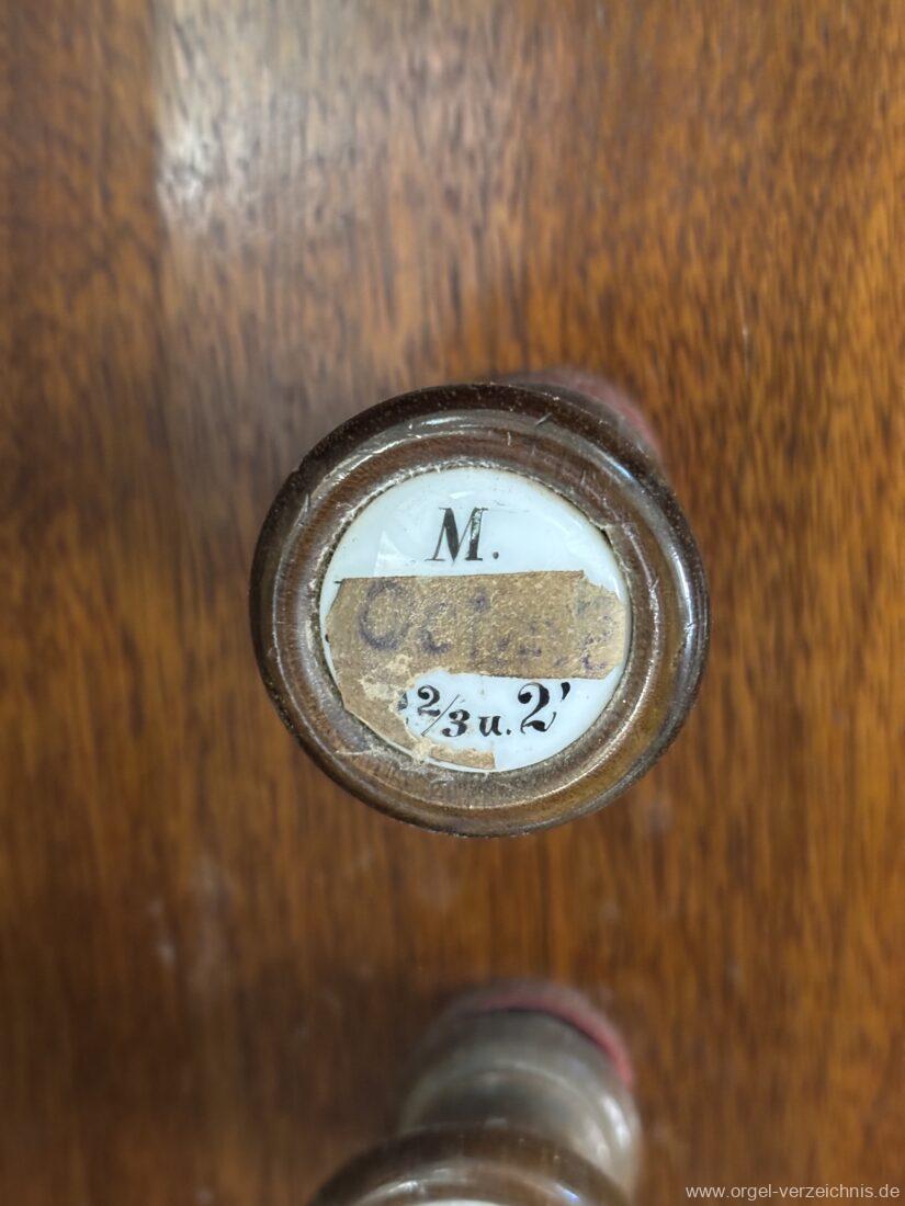 Manual I – Hauptwerk C – f“‘Bordun 16′ Principal 8′ Hohlflöte 8′ Gambe 8′ Octave 4′ Rauschquinte 2 2/3 u. 2′ [heute Octave 2′, Registerschild teilw. überklebt] Mixtur 1 2/3′ 3fach [sic!] |