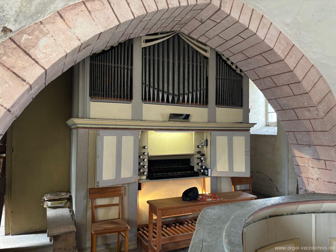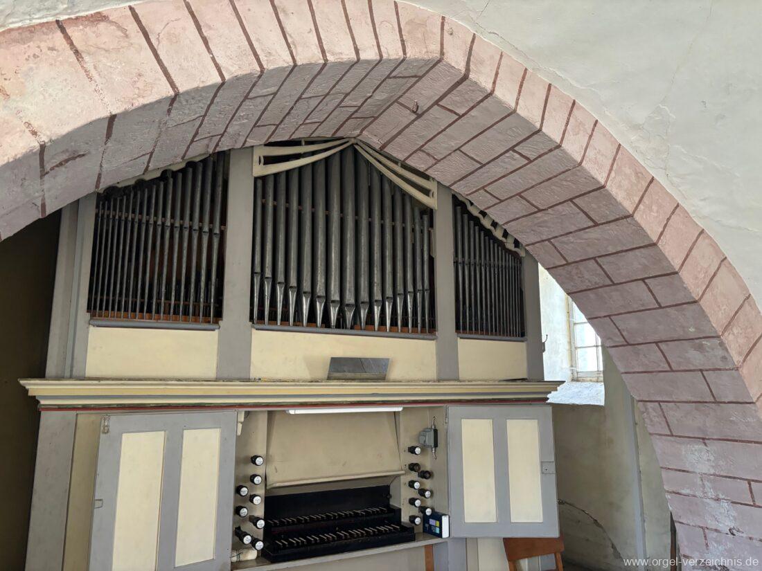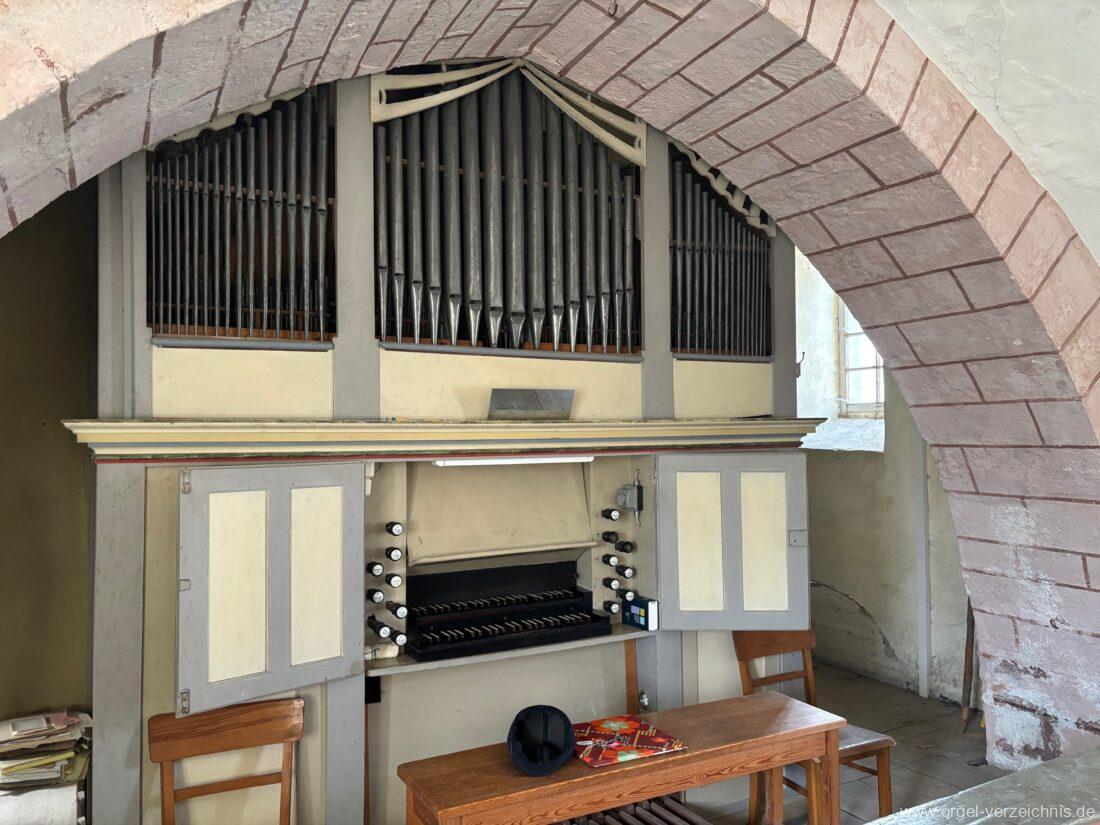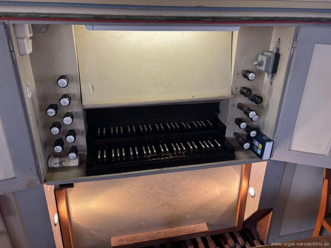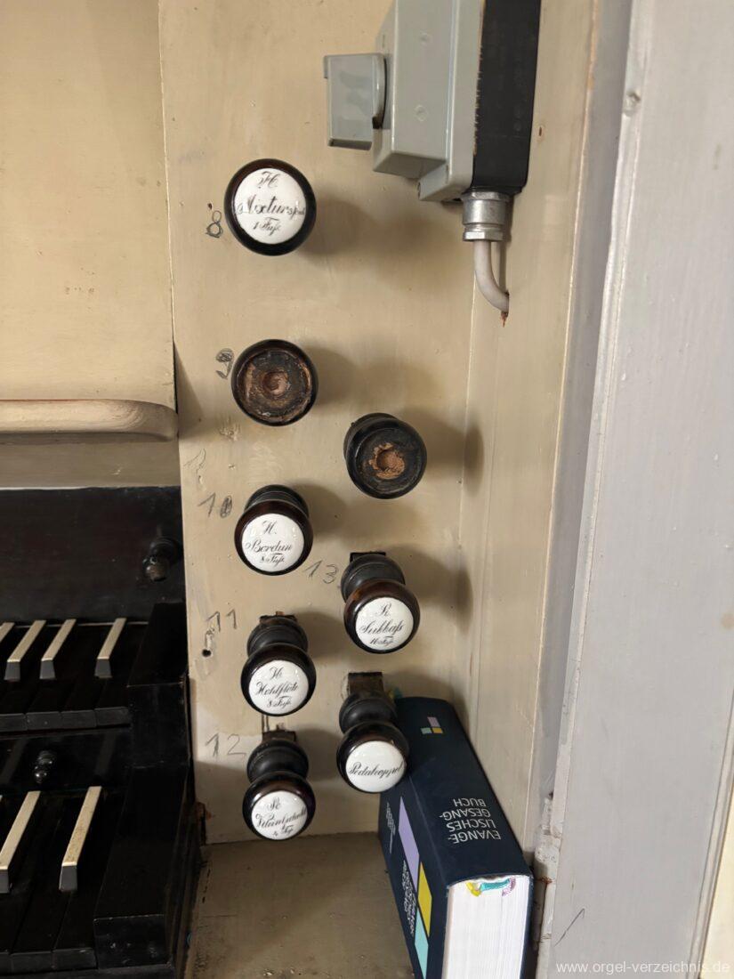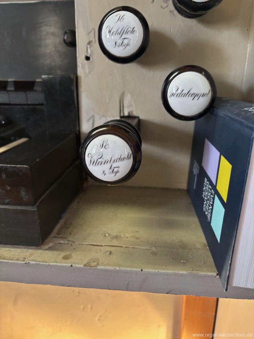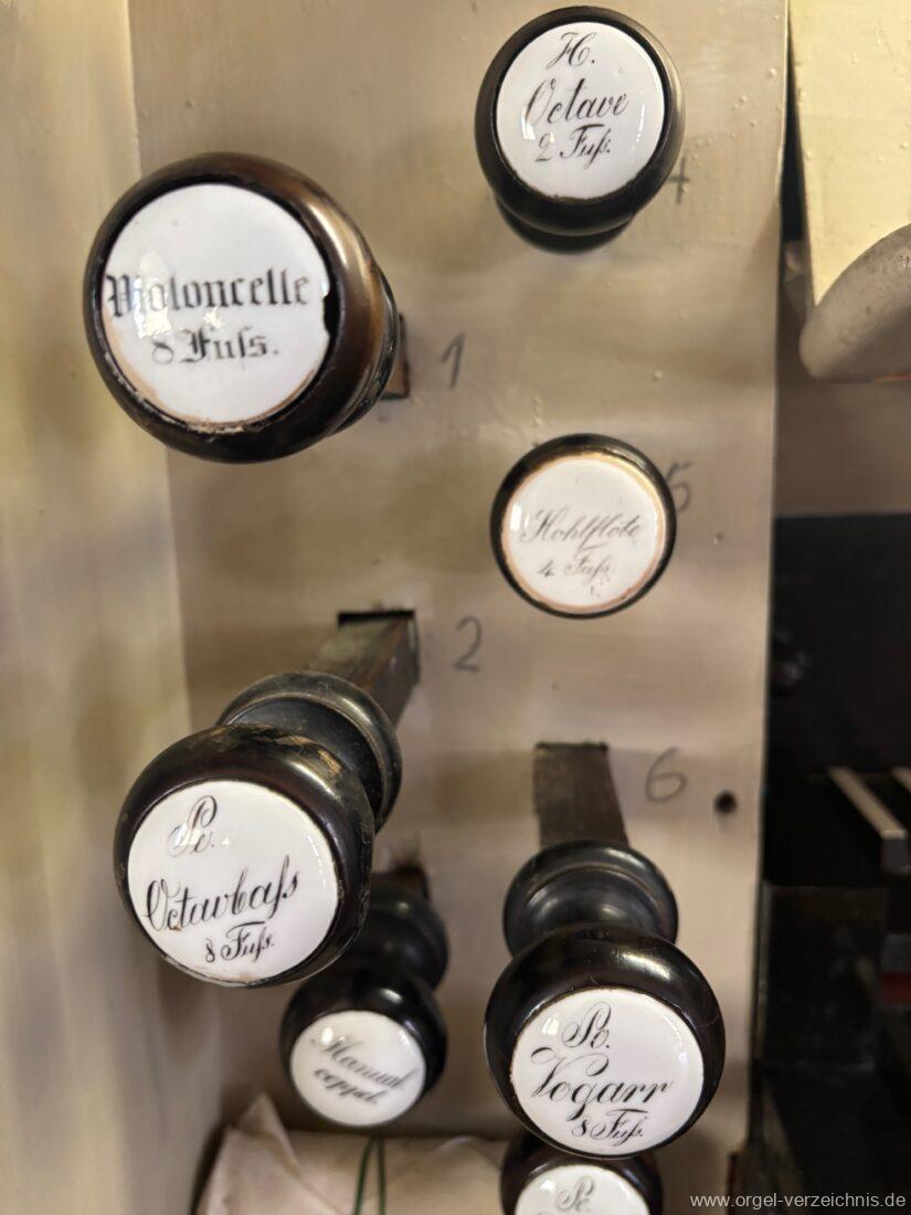 2025 Die Orgel ist in relativ gutem Zustand und spielbar. Der Spieltisch weist drei verschiedene Arten von Registerschildern auf: Weißes Porzellan mit Goldrand und dünner Kursivschrift ohne Werkangabe (Hohlflöte 4′ HW), Weißes Porzellan mit schwarzer Kursivschrift und Werkangabe („H.“ für Hauptwerk, „Po.“ für Positiv, „Pe.“ für Pedal) und Porzellan mit schwarzer Fraktur (Violoncelle 8′). Zwei Registerschilder fehlen.