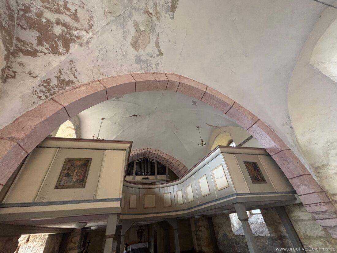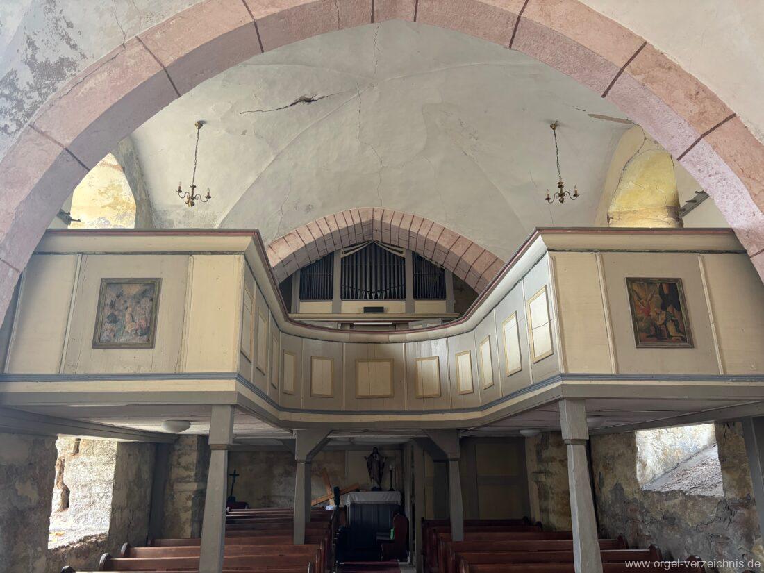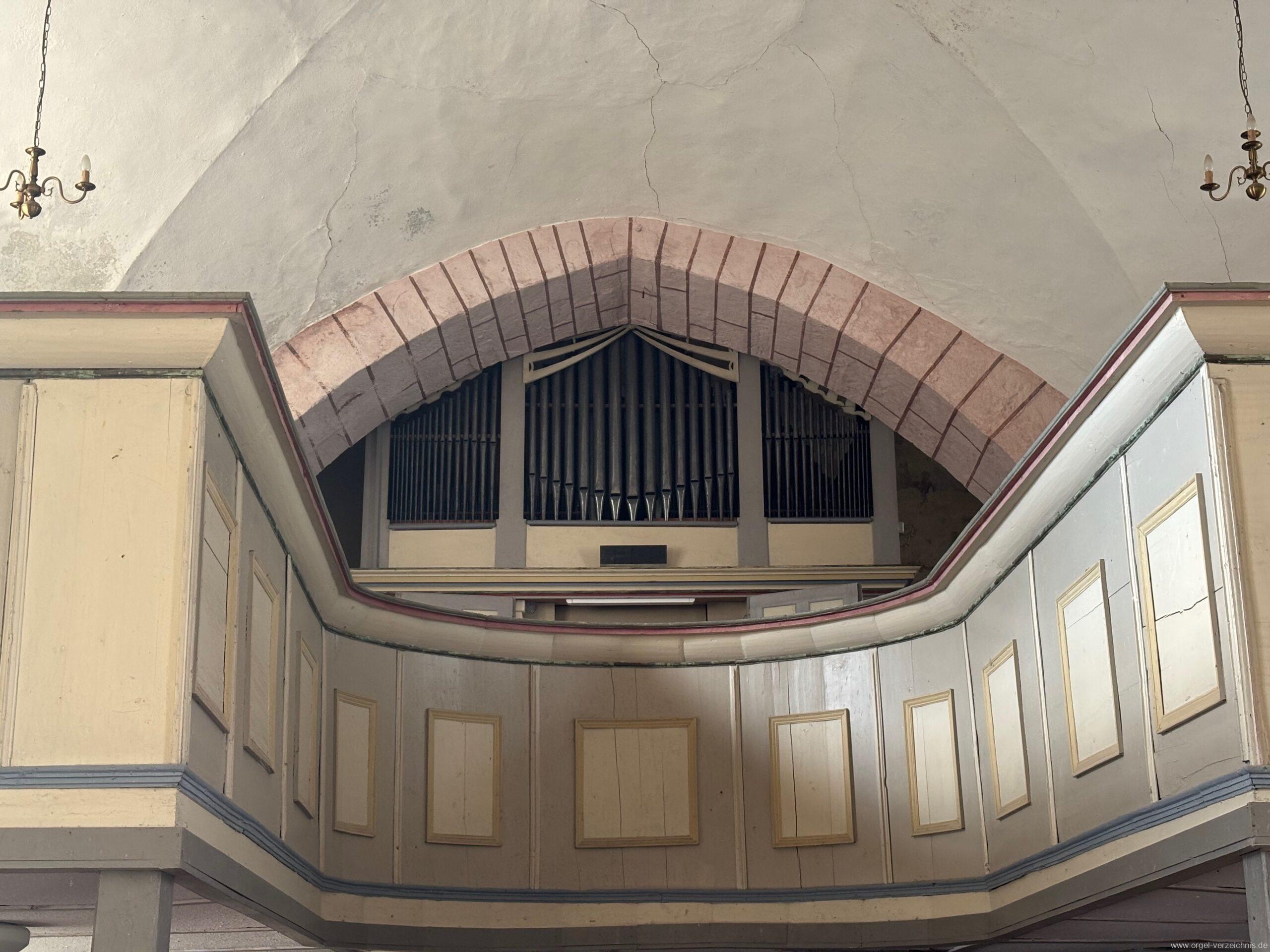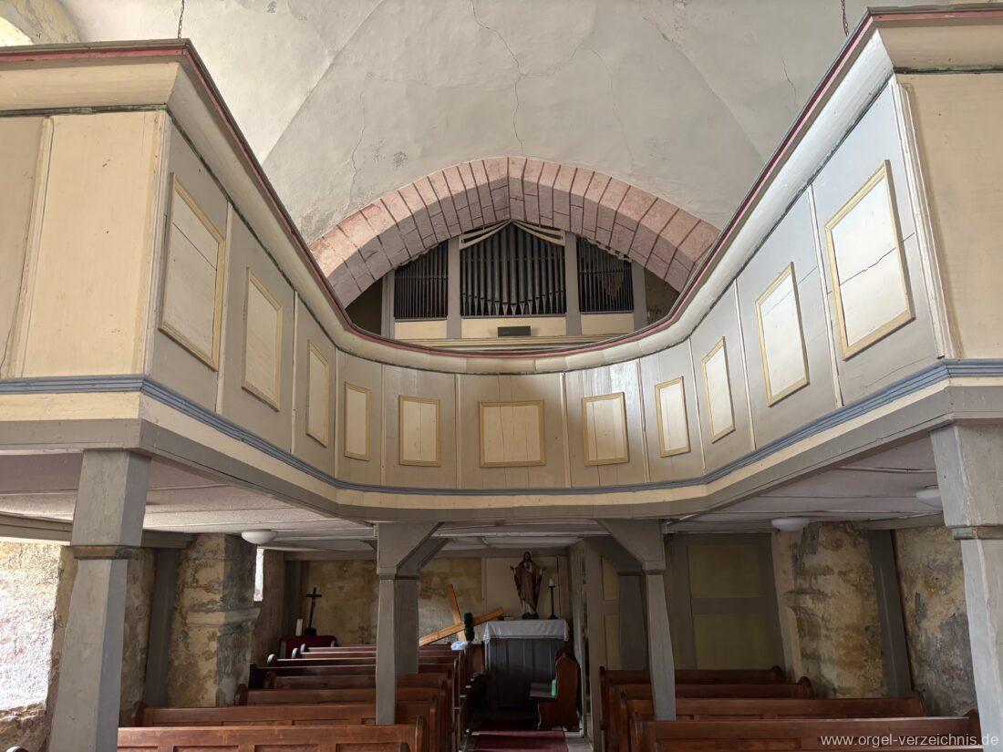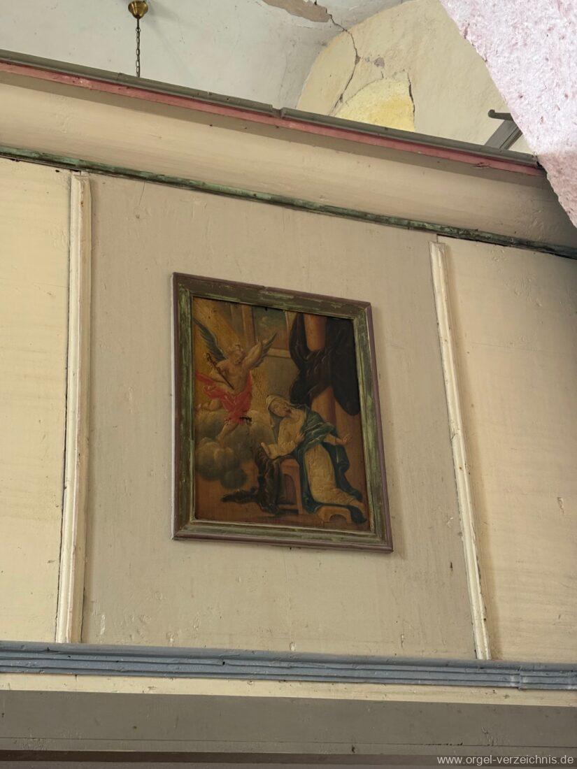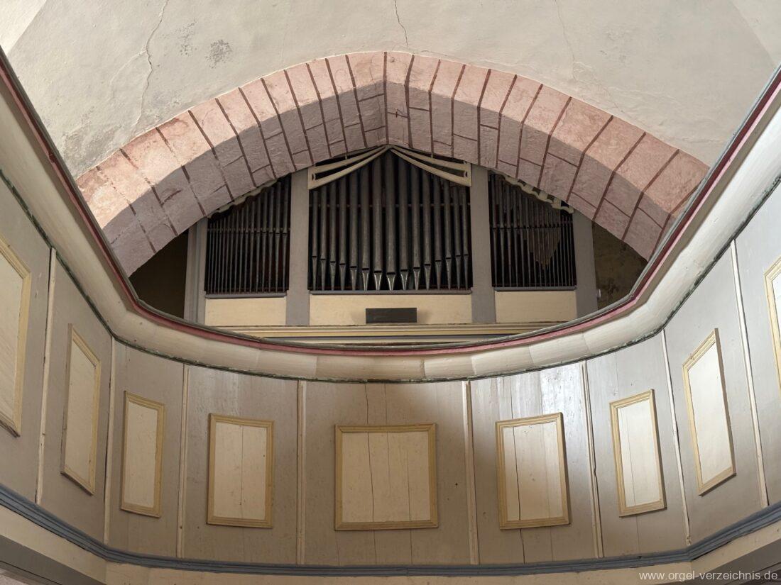 2025 Die Orgel ist in relativ gutem Zustand und spielbar. Der Spieltisch weist drei verschiedene Arten von Registerschildern auf: Weißes Porzellan mit Goldrand und dünner Kursivschrift ohne Werkangabe (Hohlflöte 4′ HW), Weißes Porzellan mit schwarzer Kursivschrift und Werkangabe („H.“ für Hauptwerk, „Po.“ für Positiv, „Pe.“ für Pedal) und Porzellan mit schwarzer Fraktur (Violoncelle 8′). Zwei Registerschilder fehlen.