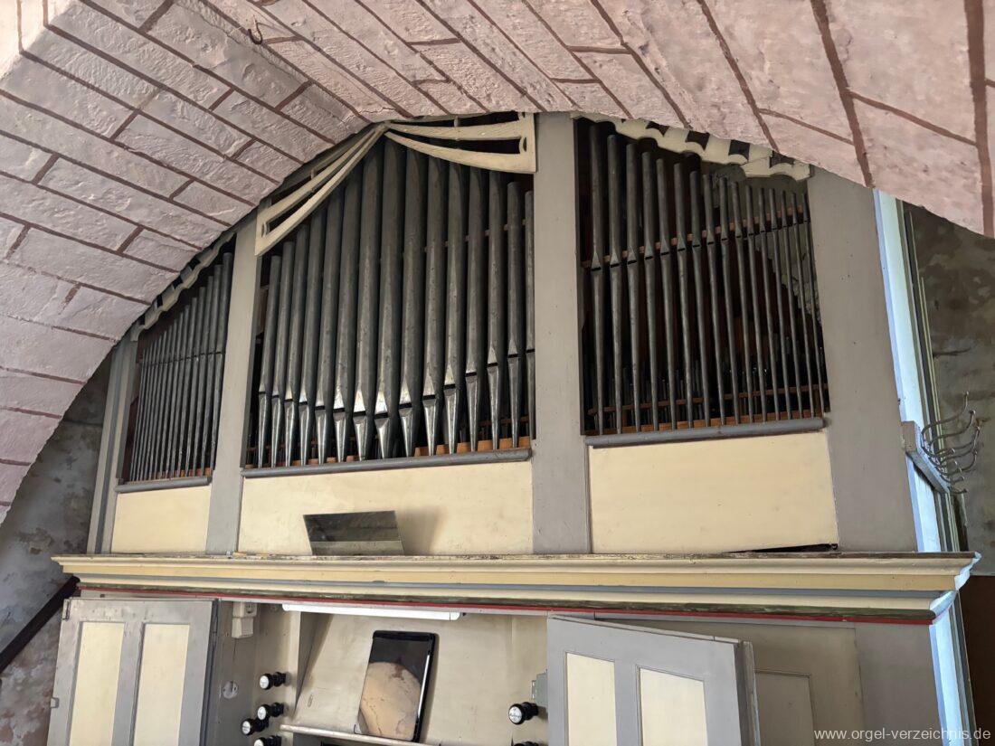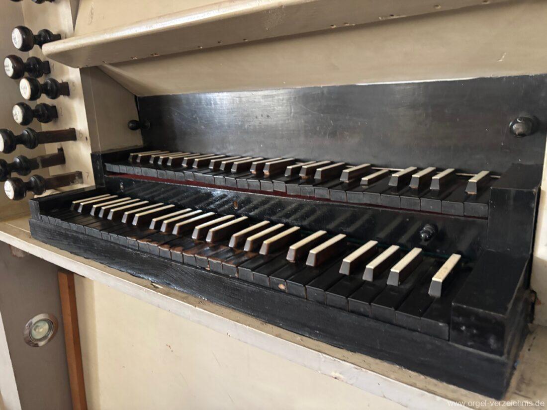 Manual I – Hauptwerk C – d“‘Bordun 8 Fuß. Hohlflöte 8 Fuß. Principal 4 Fuß. Hohlflöte 4 Fuß. Octave 2 Fuß. Quinte 1 1/3′ [urspr. Gambe 8′] Mixtur 3fach 1 Fuß. |