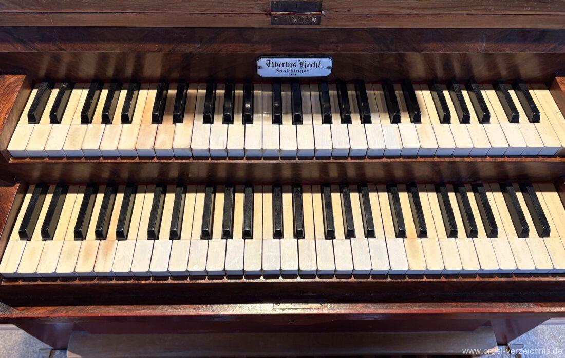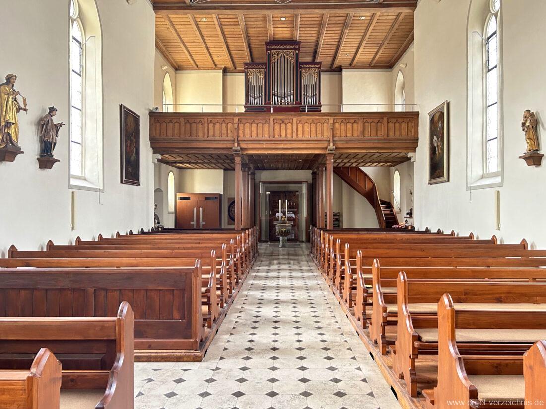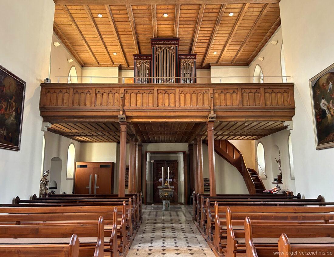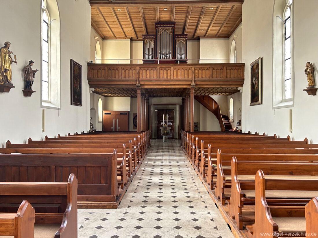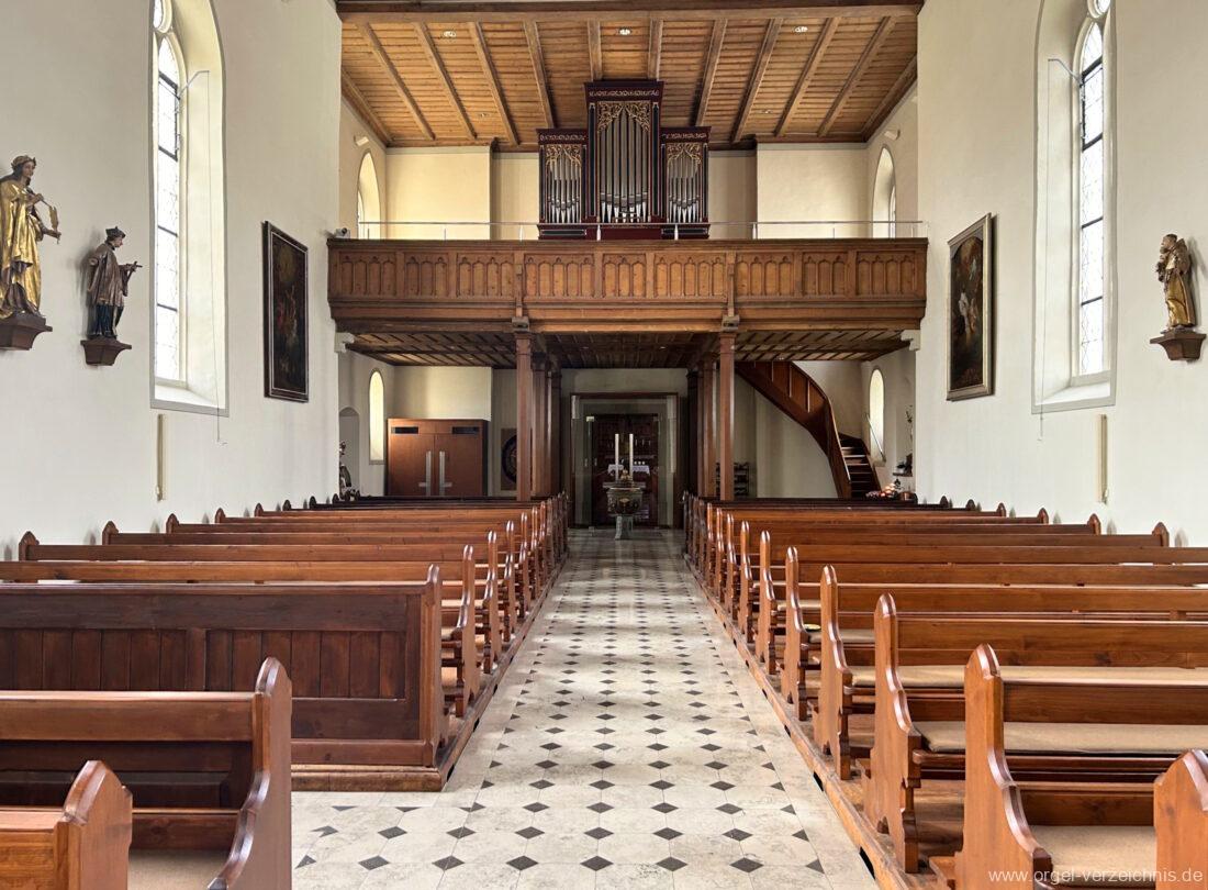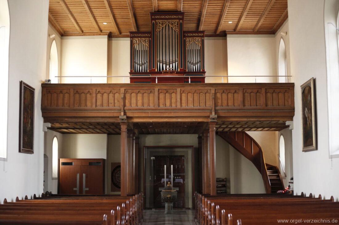 1878 mechanische Kegelladenorgel mit mittig freistehendem Spieltisch (Blickrichtung Chor), erbaut von Orgelbauer Tiberius Hecht (Spaichingen) II/17.