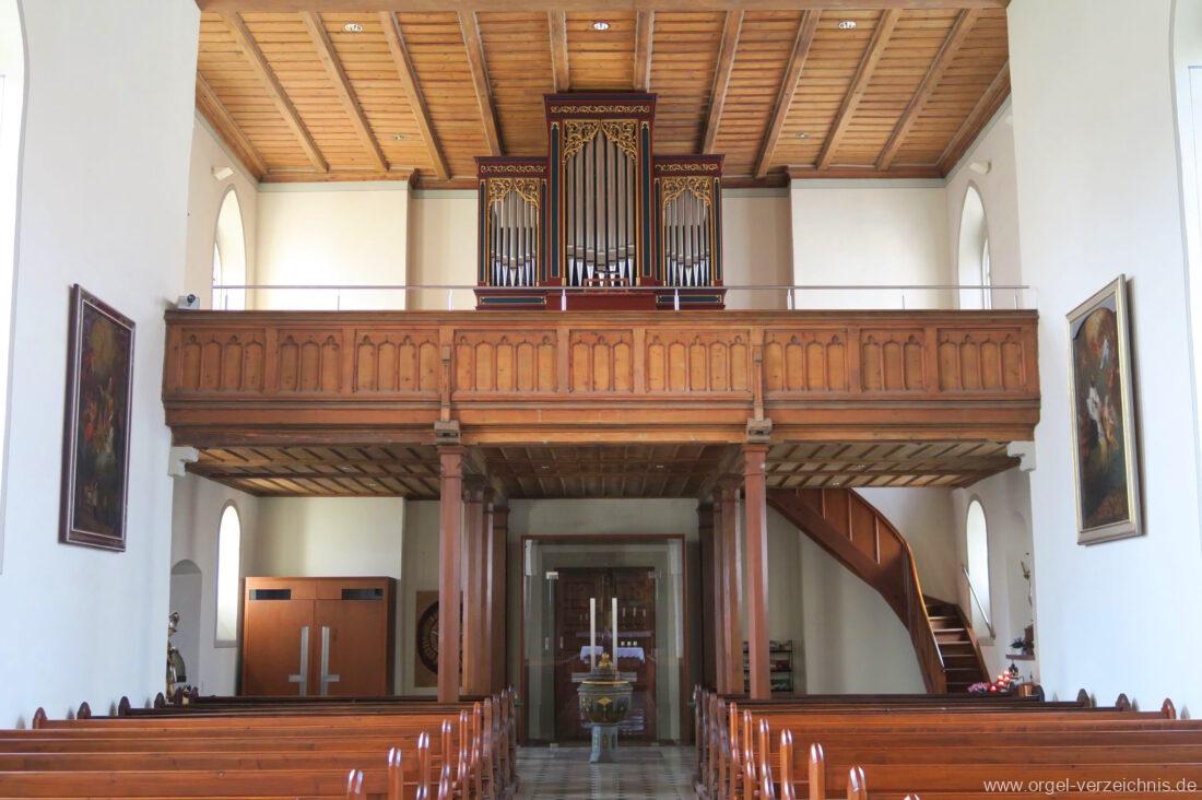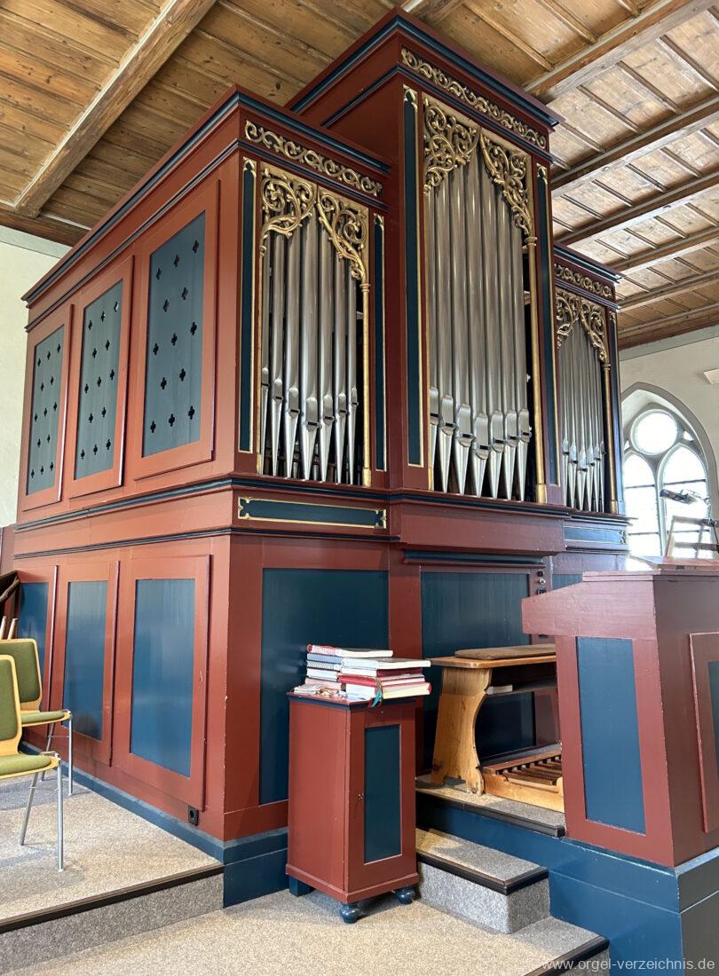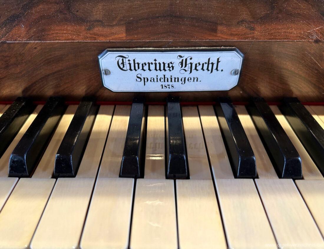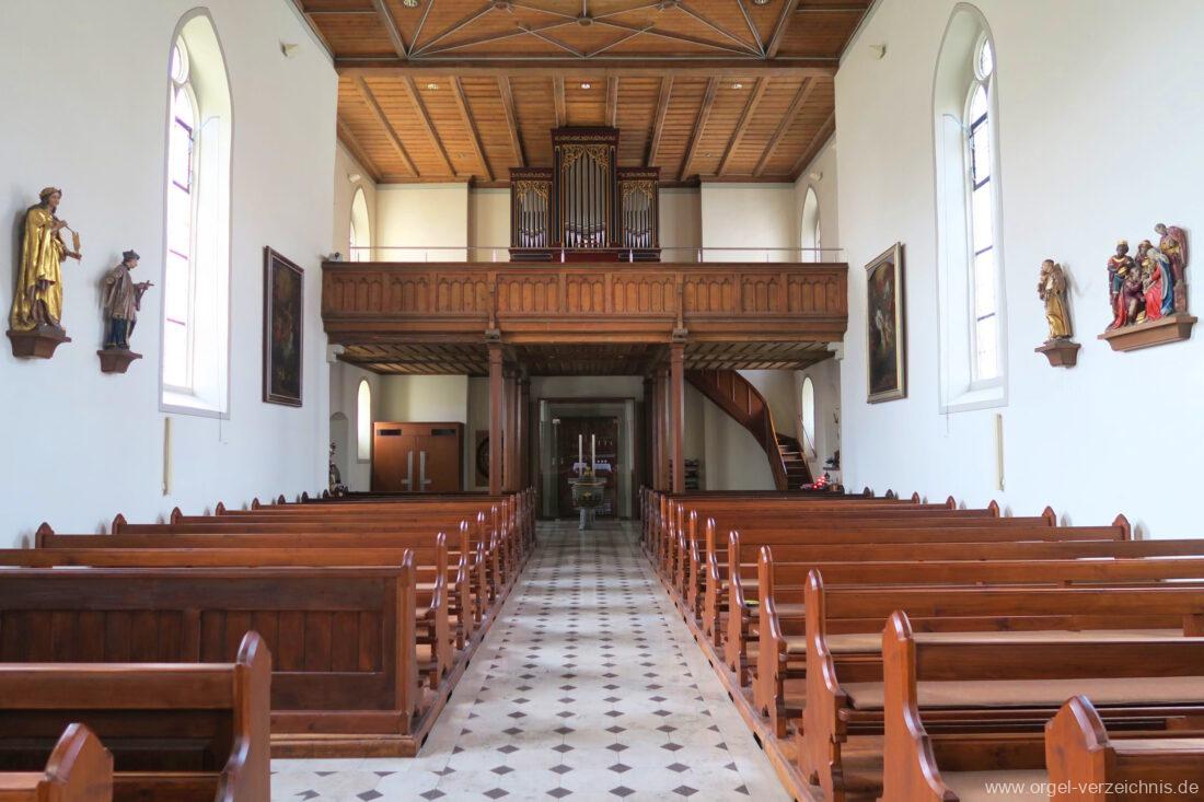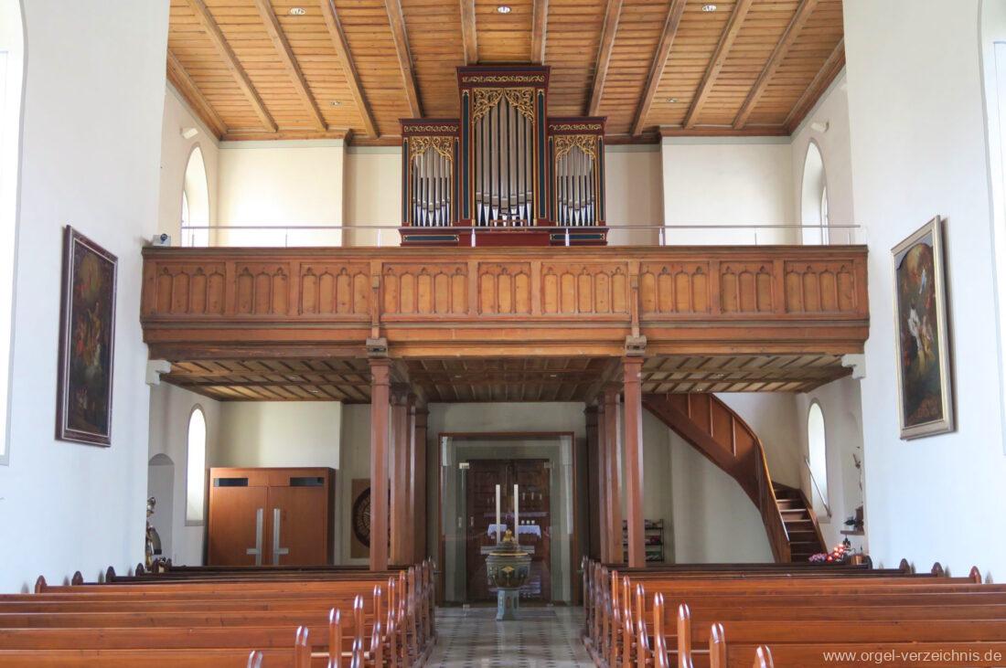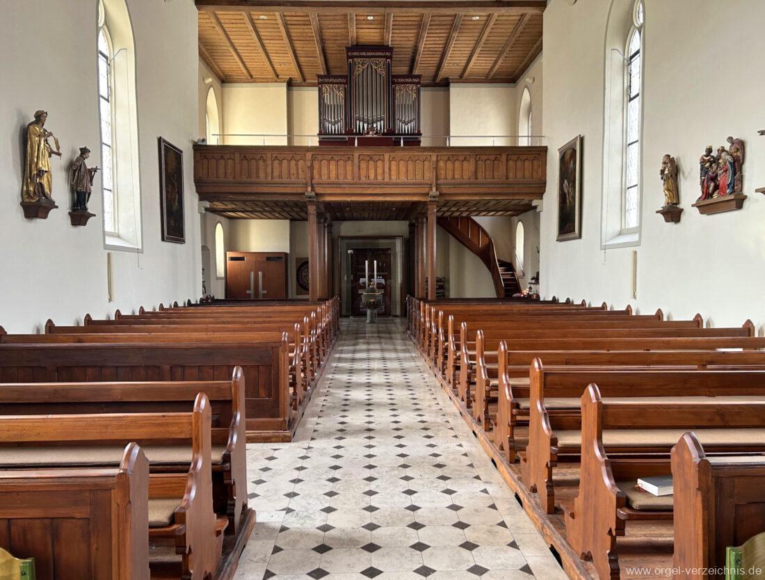 1878 mechanische Kegelladenorgel mit mittig freistehendem Spieltisch (Blickrichtung Chor), erbaut von Orgelbauer Tiberius Hecht (Spaichingen) II/17.