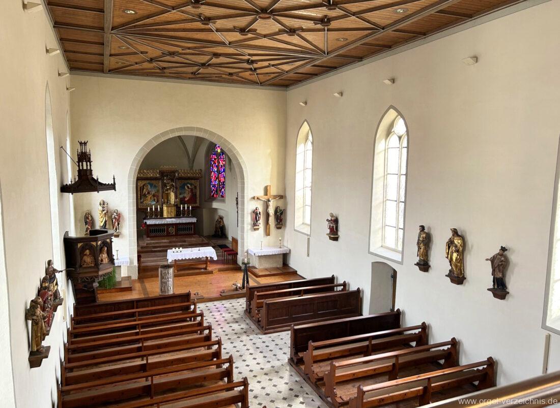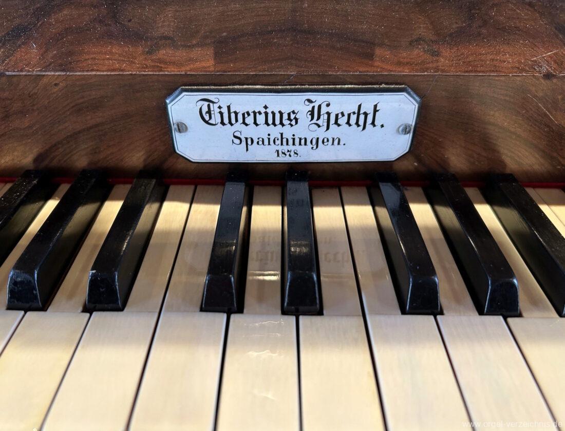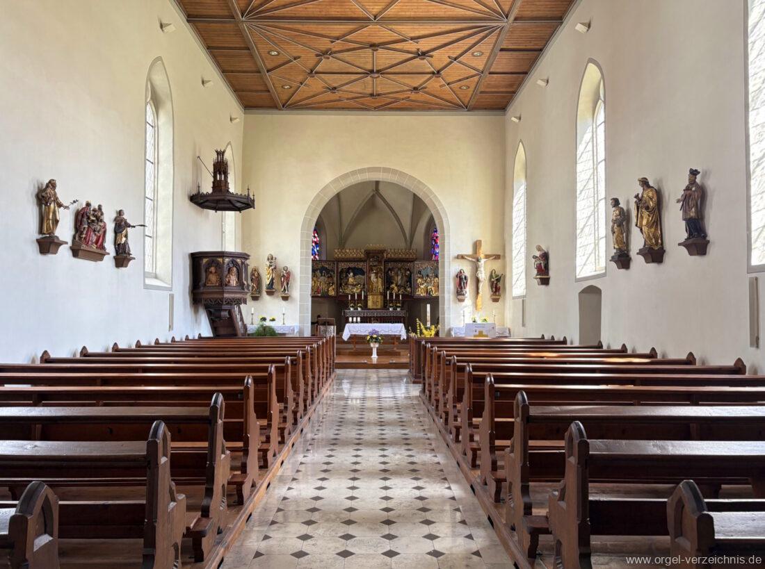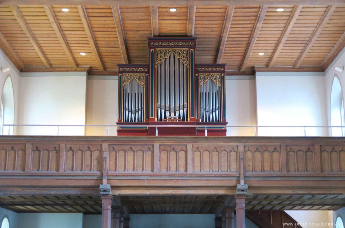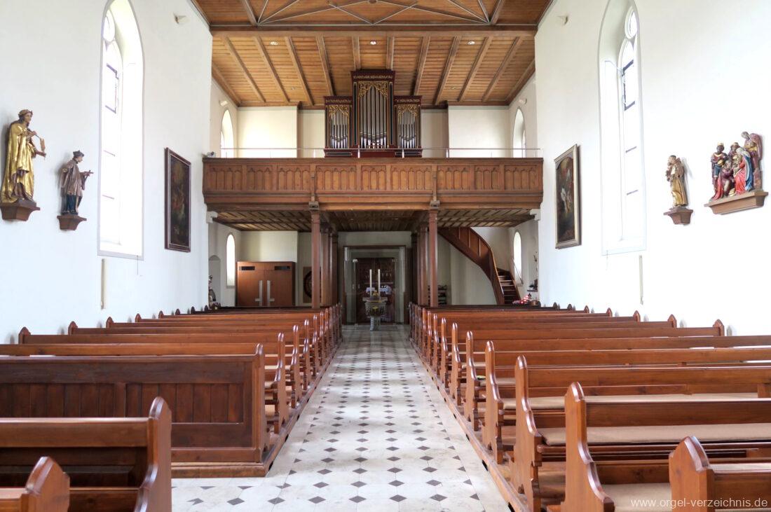 1878 mechanische Kegelladenorgel mit mittig freistehendem Spieltisch (Blickrichtung Chor), erbaut von Orgelbauer Tiberius Hecht (Spaichingen) II/17.