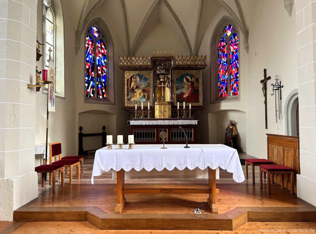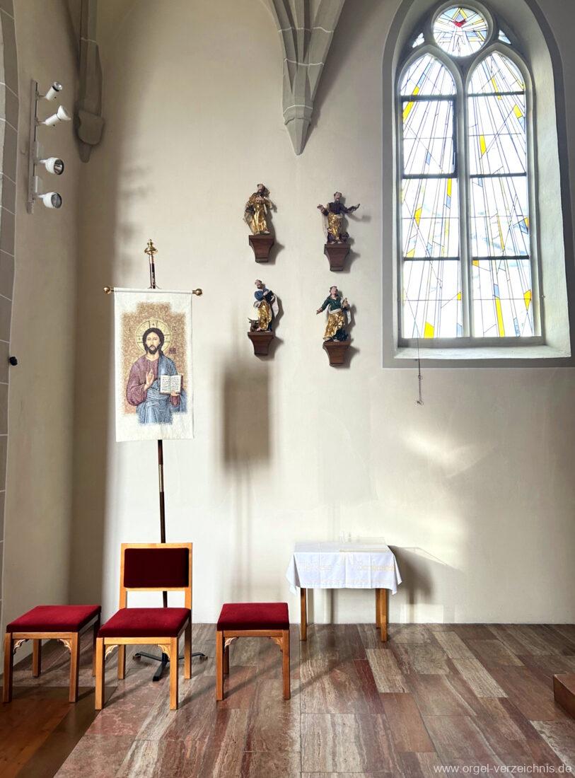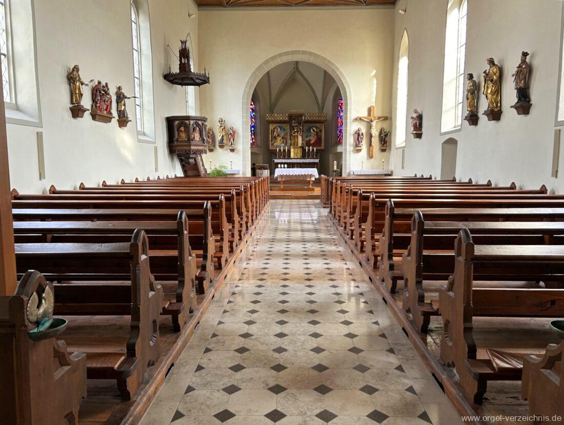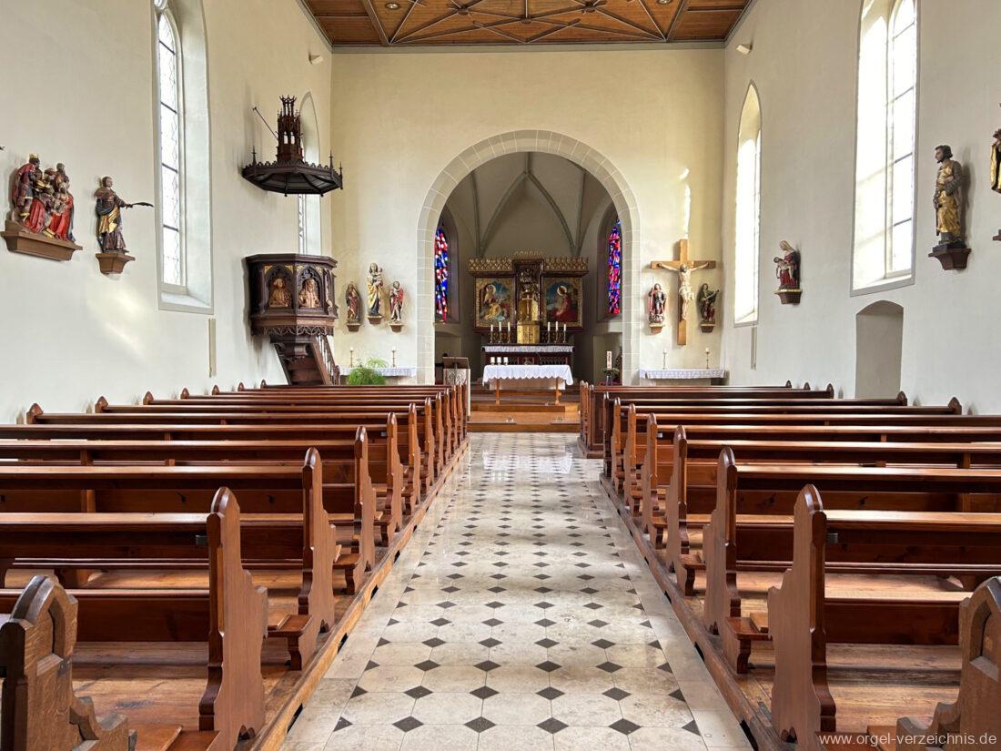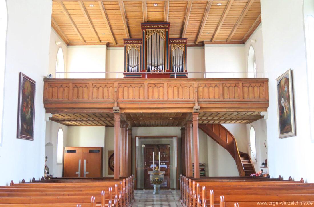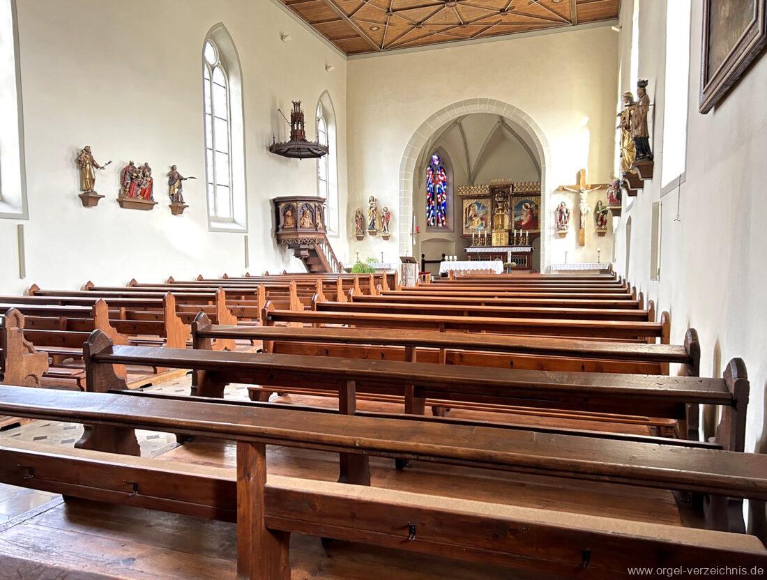 1878 mechanische Kegelladenorgel mit mittig freistehendem Spieltisch (Blickrichtung Chor), erbaut von Orgelbauer Tiberius Hecht (Spaichingen) II/17.