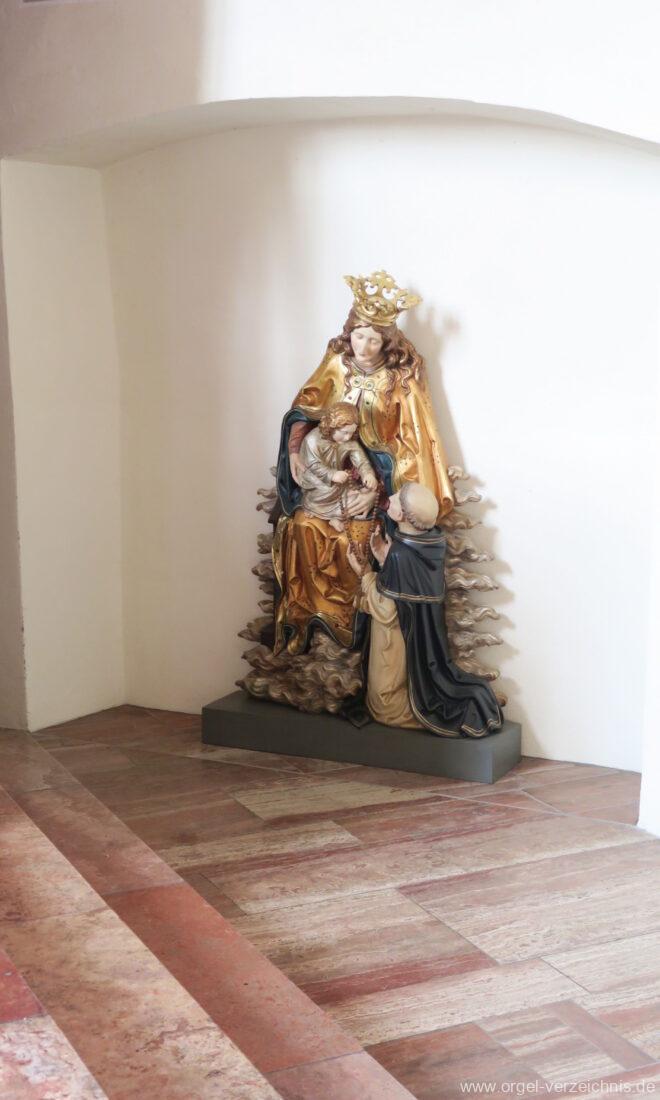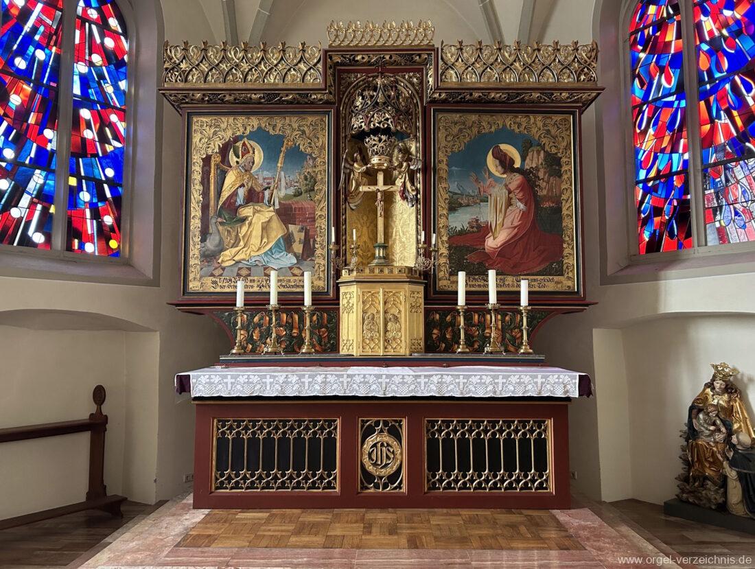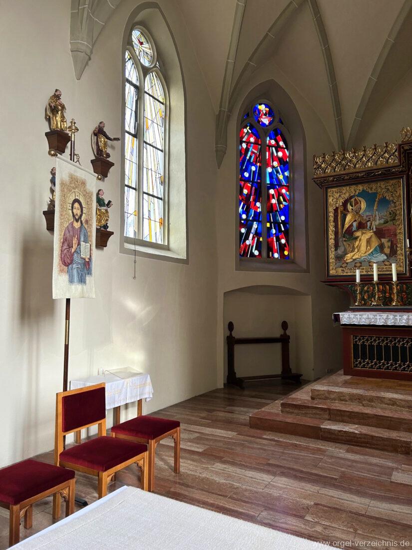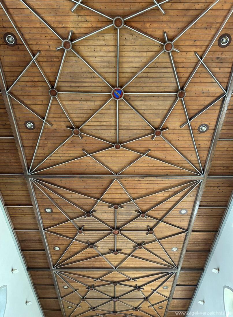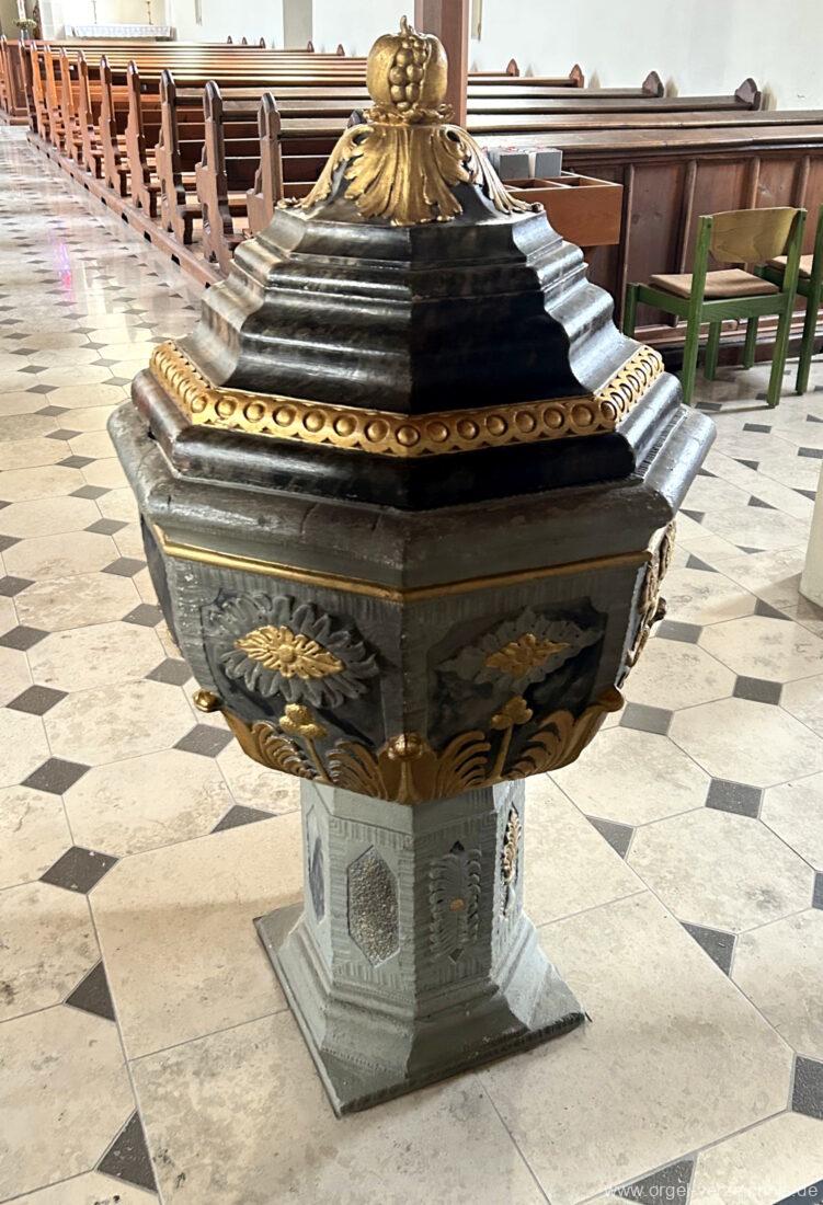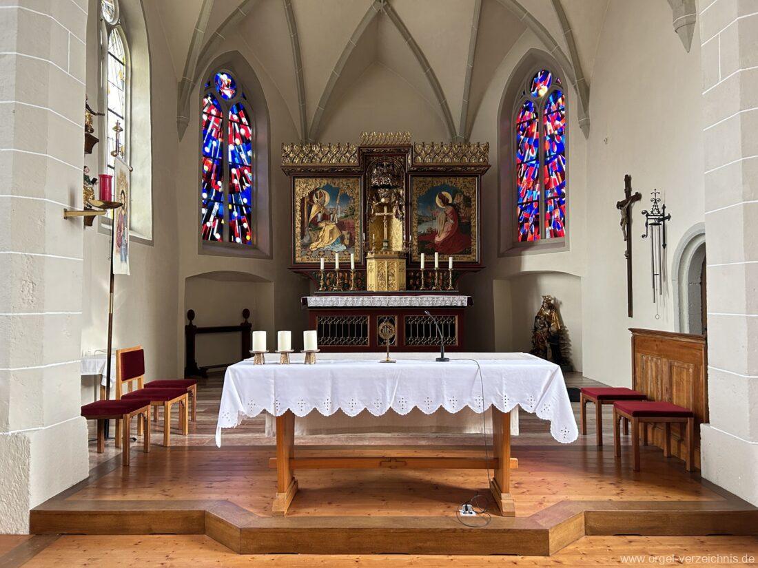 1878 mechanische Kegelladenorgel mit mittig freistehendem Spieltisch (Blickrichtung Chor), erbaut von Orgelbauer Tiberius Hecht (Spaichingen) II/17.