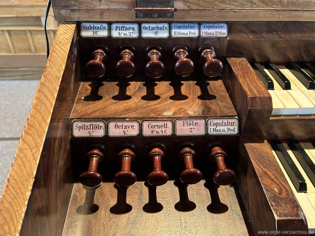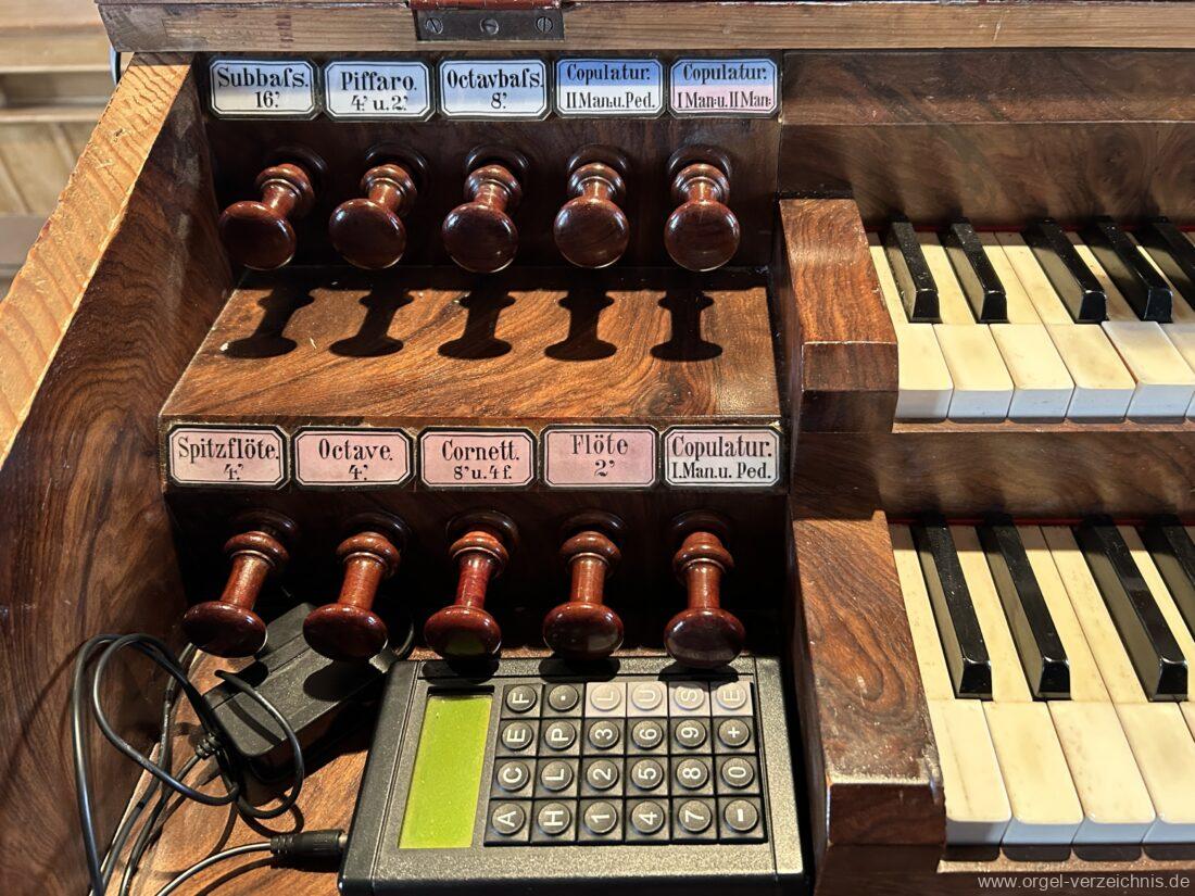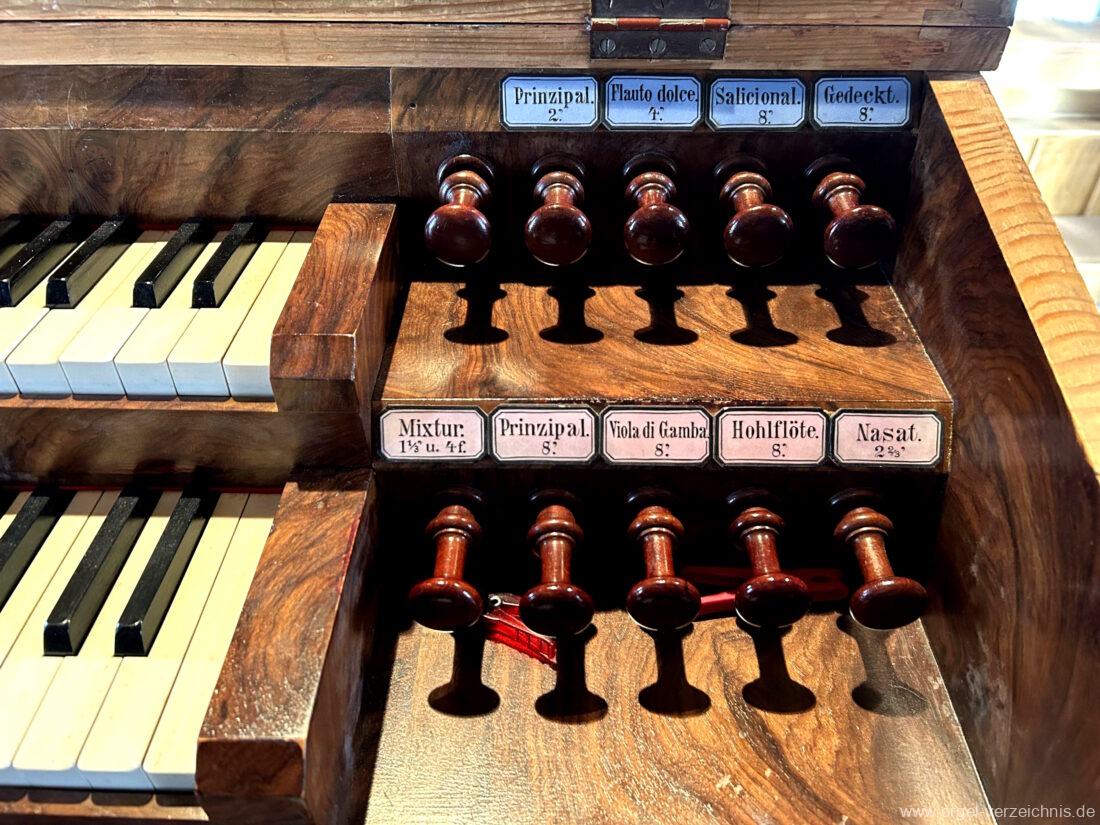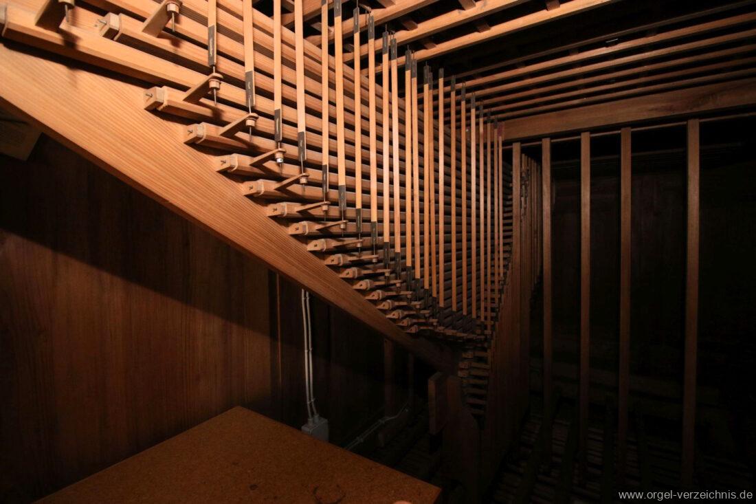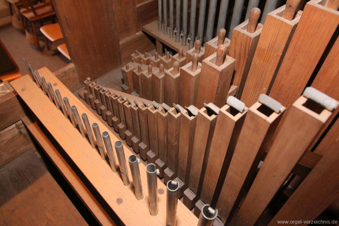 I Hauptwerk C – f“‘Prinzipal. 8′. C/CS Holz offen; ab D Metall; D – b° Prospekt, ab h° innen Viola di Gamba. 8′. Metall Hohlflöte. 8′. C – H Holz ged.; ab c° Holz offen Octave 4′. Metall Spitzflöte. 4′. Metall, konisch Nasat. 2 2/3′ Metall, konisch Flöte 2′ Metall, leicht konisch Cornett. 8′ u. 4 f. ab g°; Metall; 4′ rohrged. Mixtur. 1 1/3′ u. 4 f. Metall – rep. c°/c’/c“