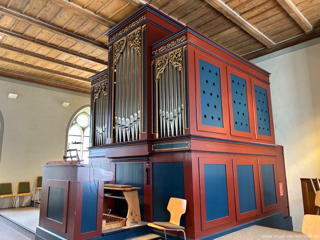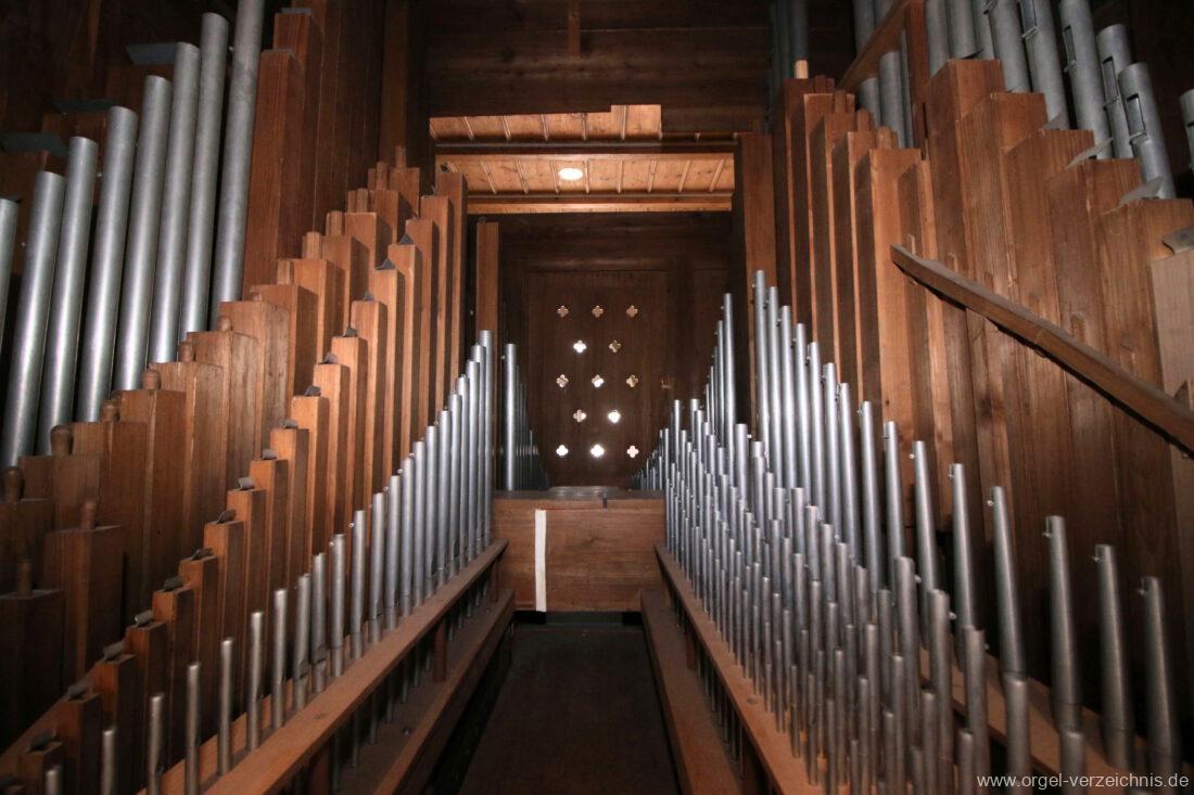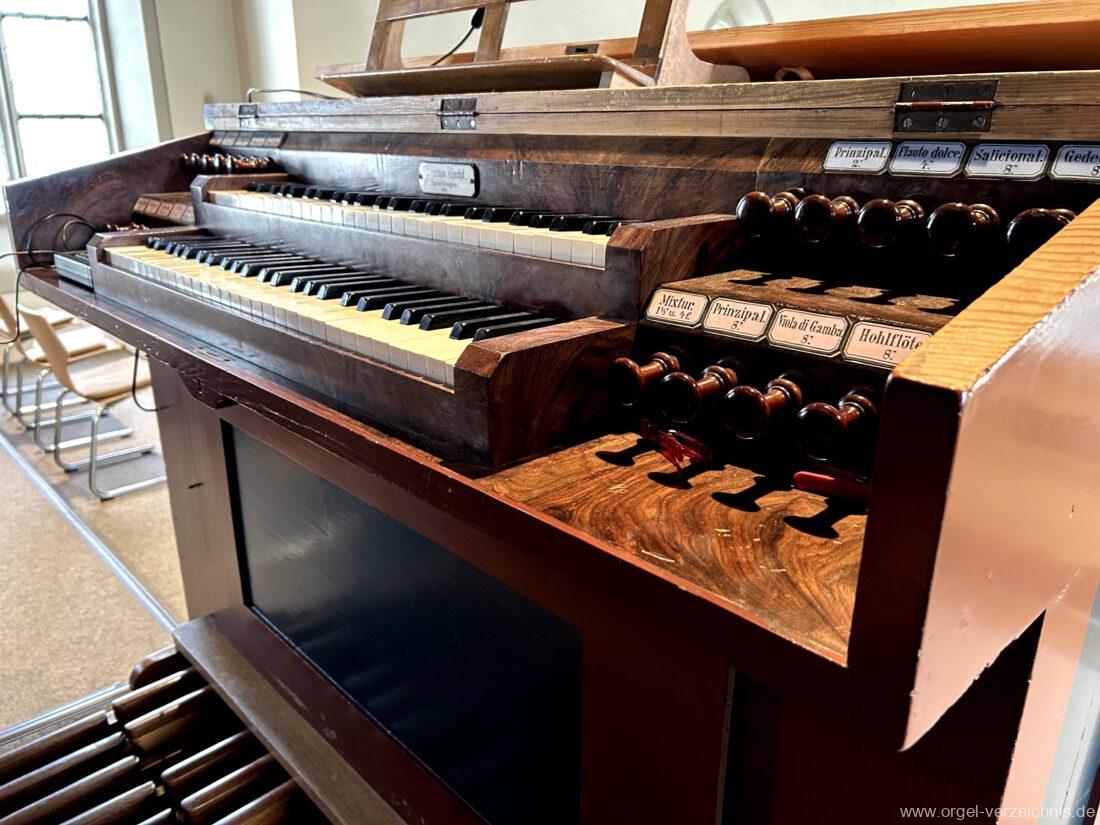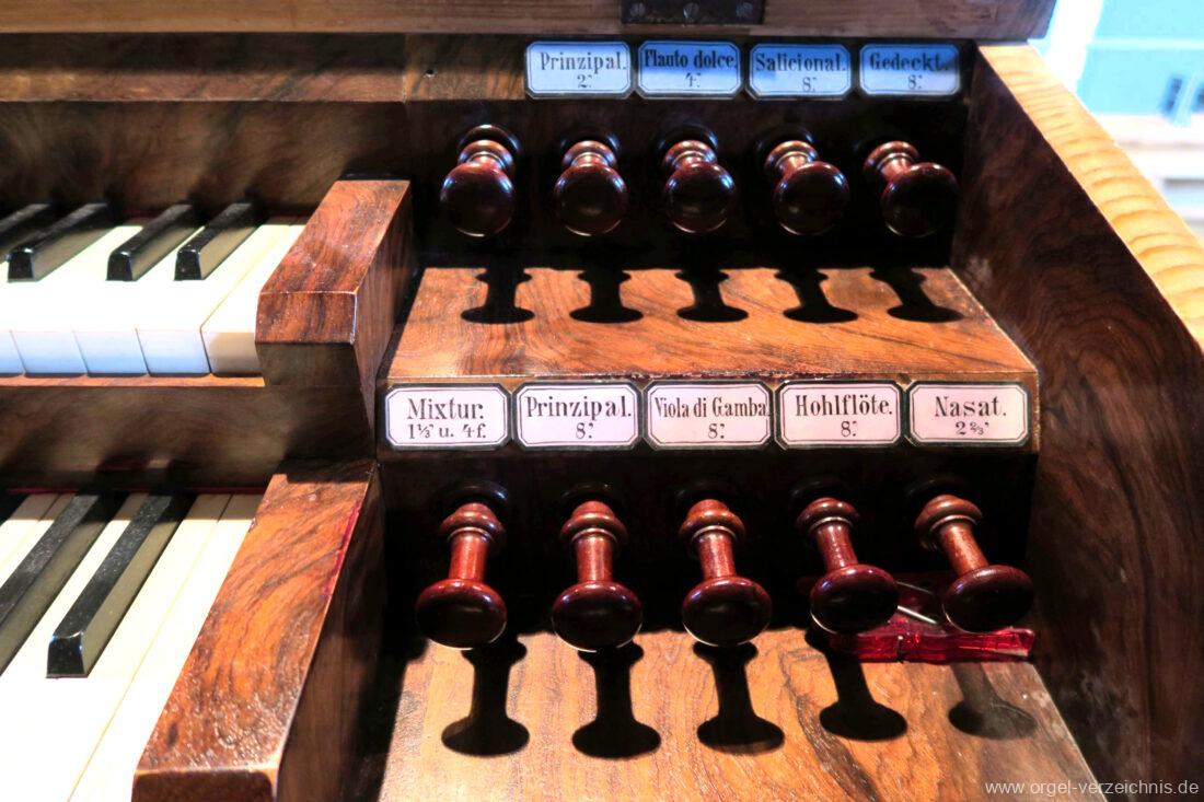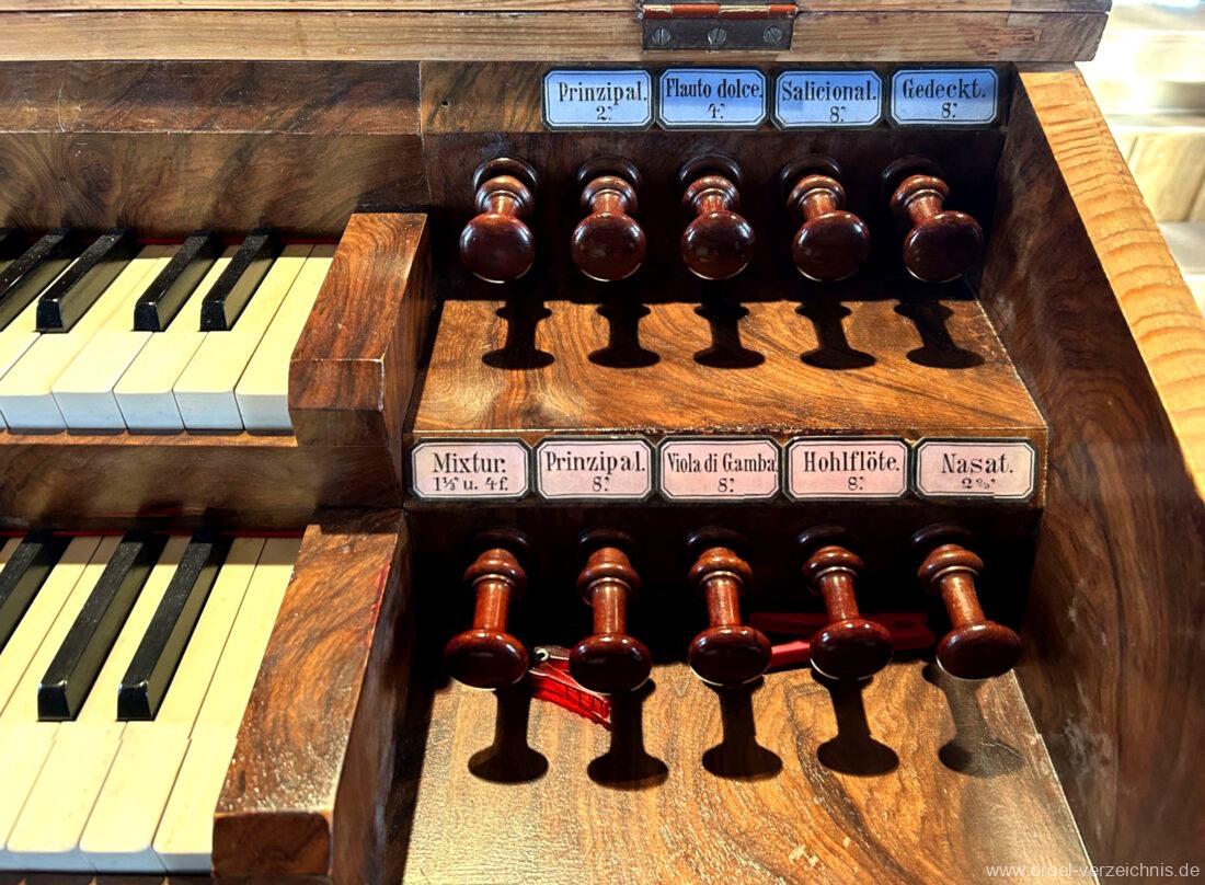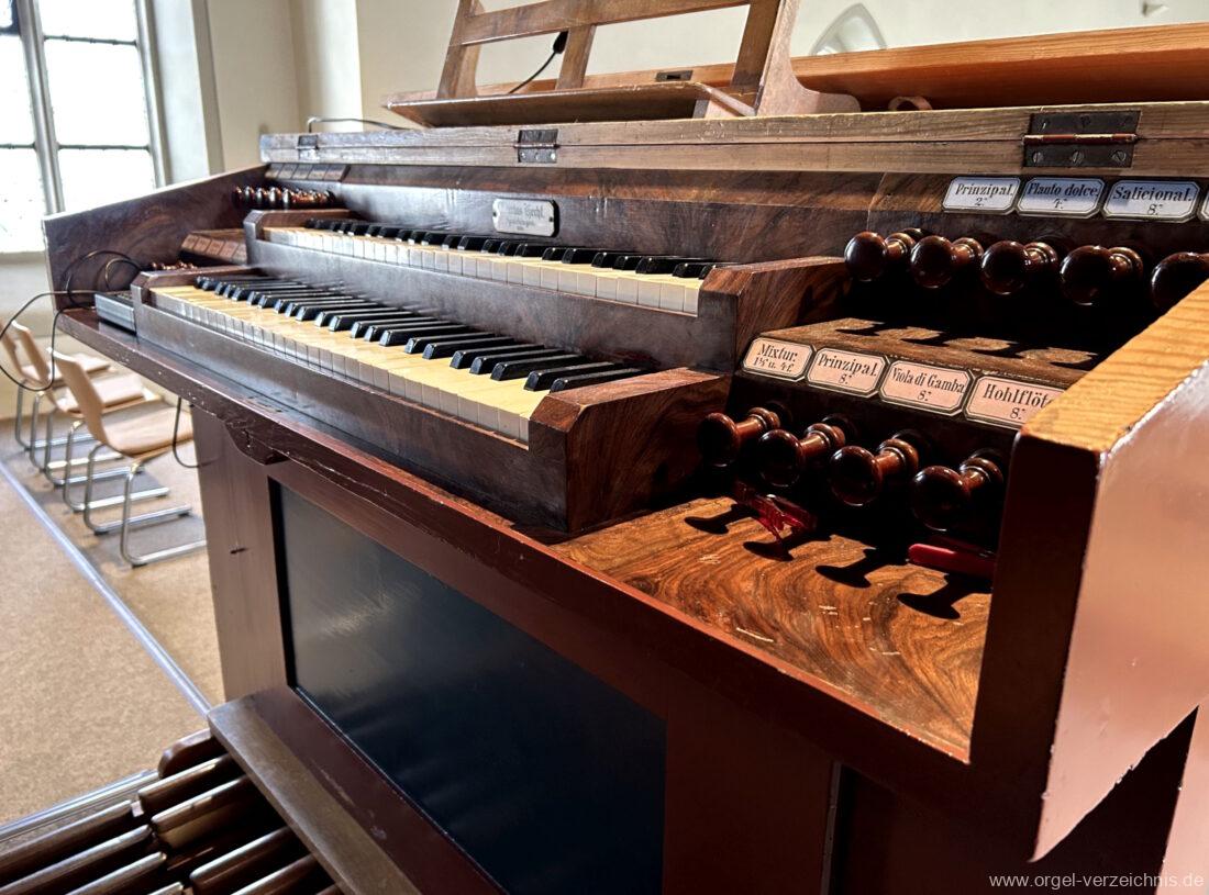 I Hauptwerk C – f“‘Prinzipal. 8′. C/CS Holz offen; ab D Metall; D – b° Prospekt, ab h° innen Viola di Gamba. 8′. Metall Hohlflöte. 8′. C – H Holz ged.; ab c° Holz offen Octave 4′. Metall Spitzflöte. 4′. Metall, konisch Nasat. 2 2/3′ Metall, konisch Flöte 2′ Metall, leicht konisch Cornett. 8′ u. 4 f. ab g°; Metall; 4′ rohrged. Mixtur. 1 1/3′ u. 4 f. Metall – rep. c°/c’/c“