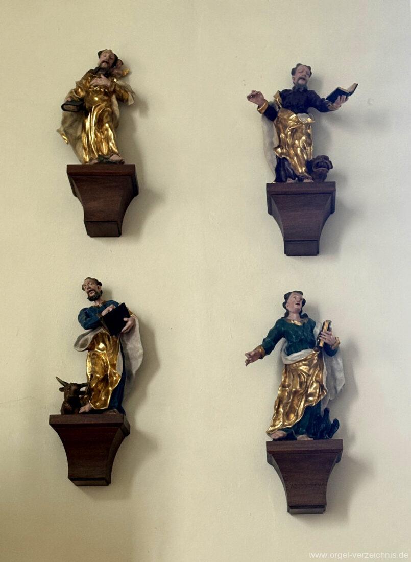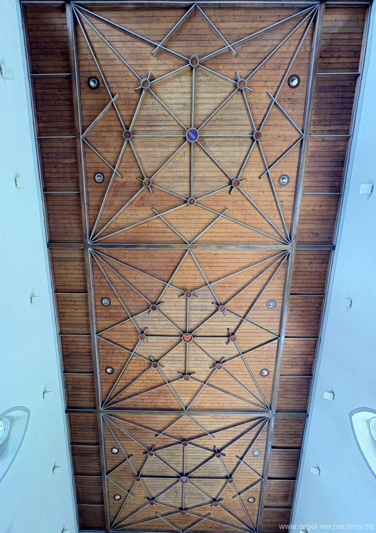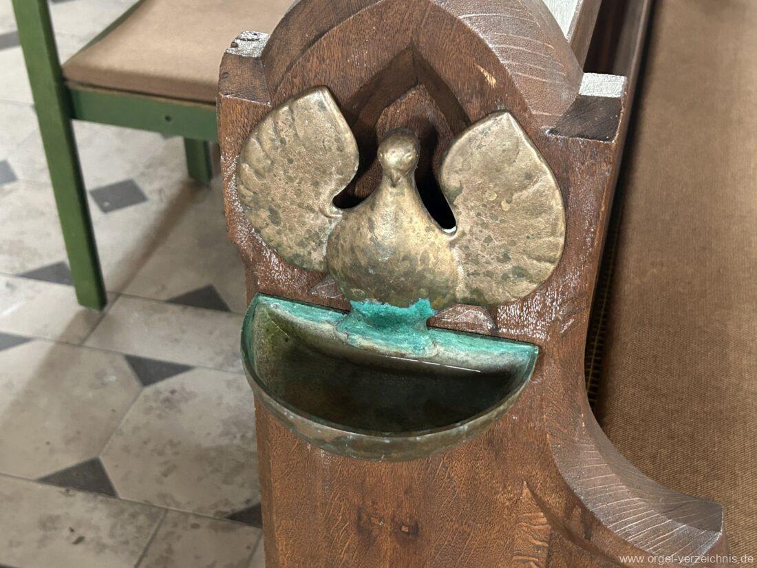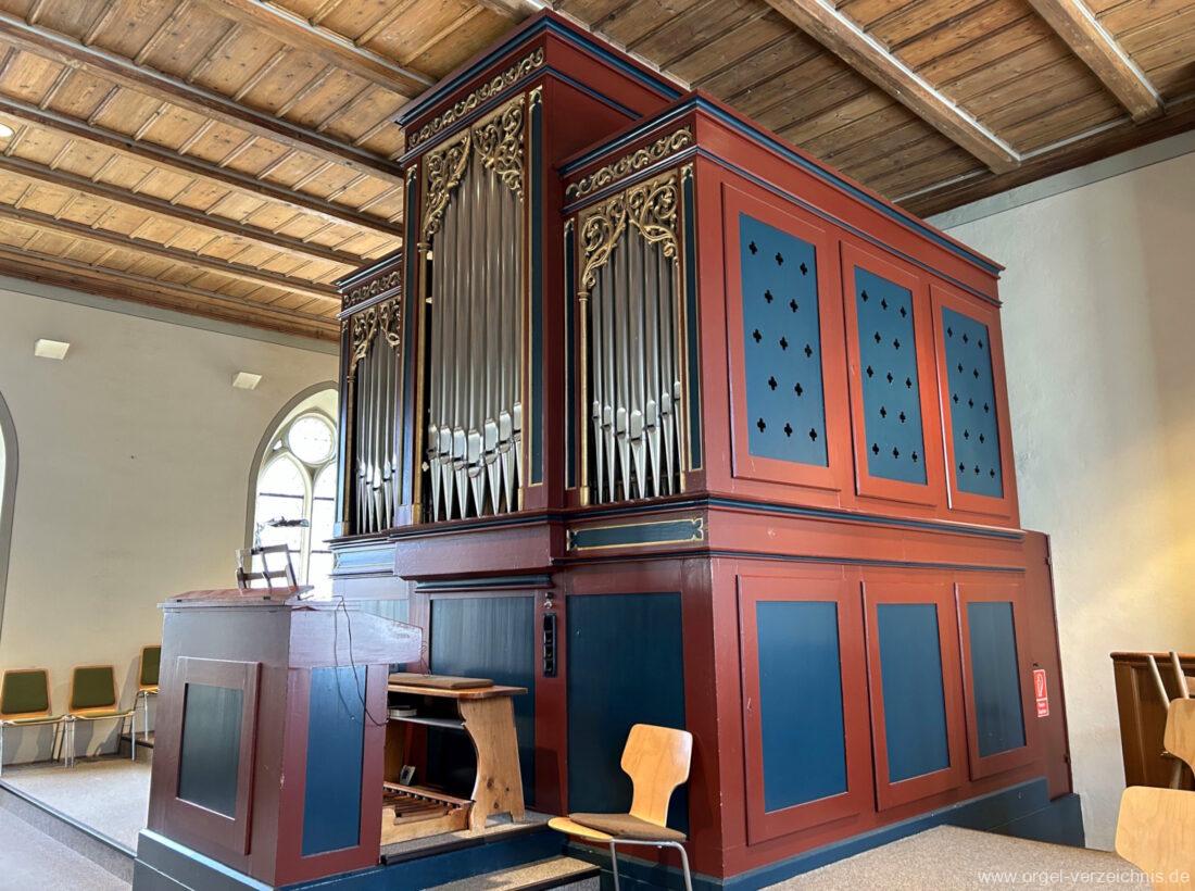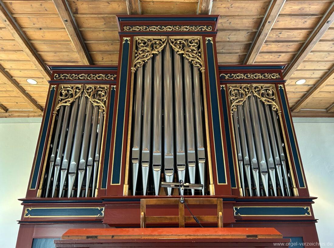 I Hauptwerk C – f“‘Prinzipal. 8′. C/CS Holz offen; ab D Metall; D – b° Prospekt, ab h° innen Viola di Gamba. 8′. Metall Hohlflöte. 8′. C – H Holz ged.; ab c° Holz offen Octave 4′. Metall Spitzflöte. 4′. Metall, konisch Nasat. 2 2/3′ Metall, konisch Flöte 2′ Metall, leicht konisch Cornett. 8′ u. 4 f. ab g°; Metall; 4′ rohrged. Mixtur. 1 1/3′ u. 4 f. Metall – rep. c°/c’/c“