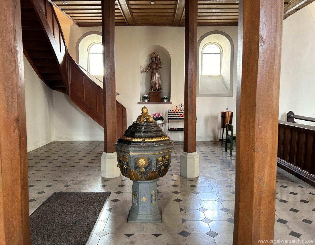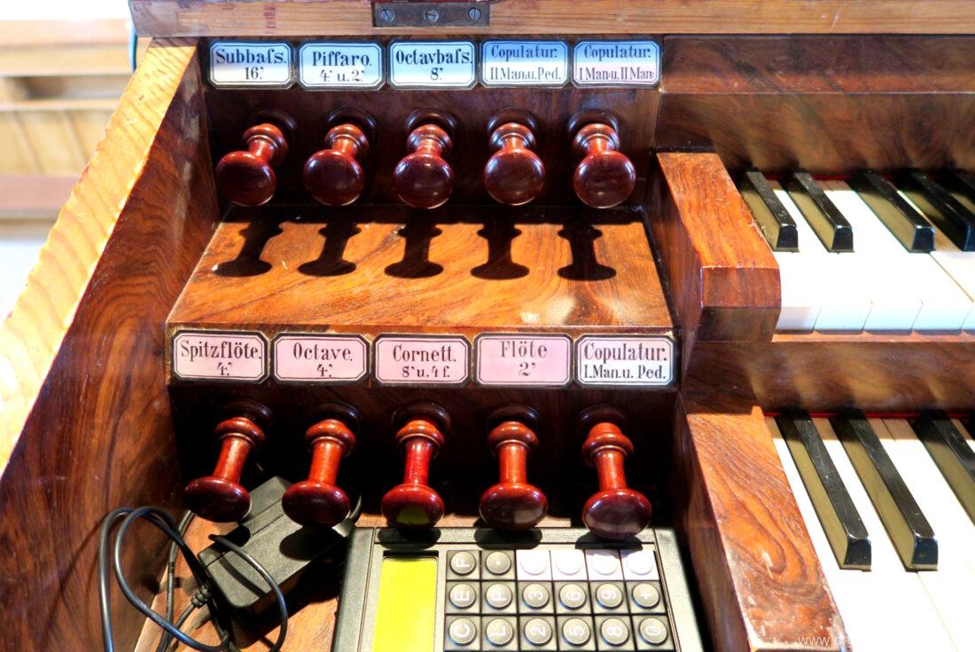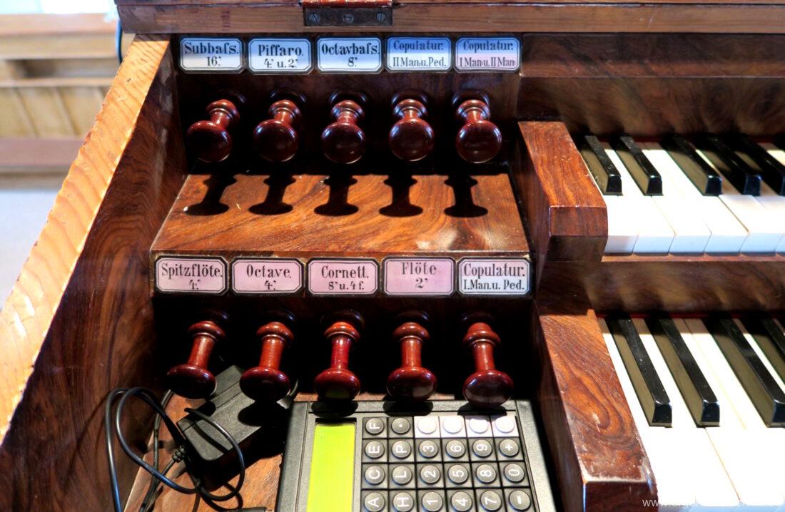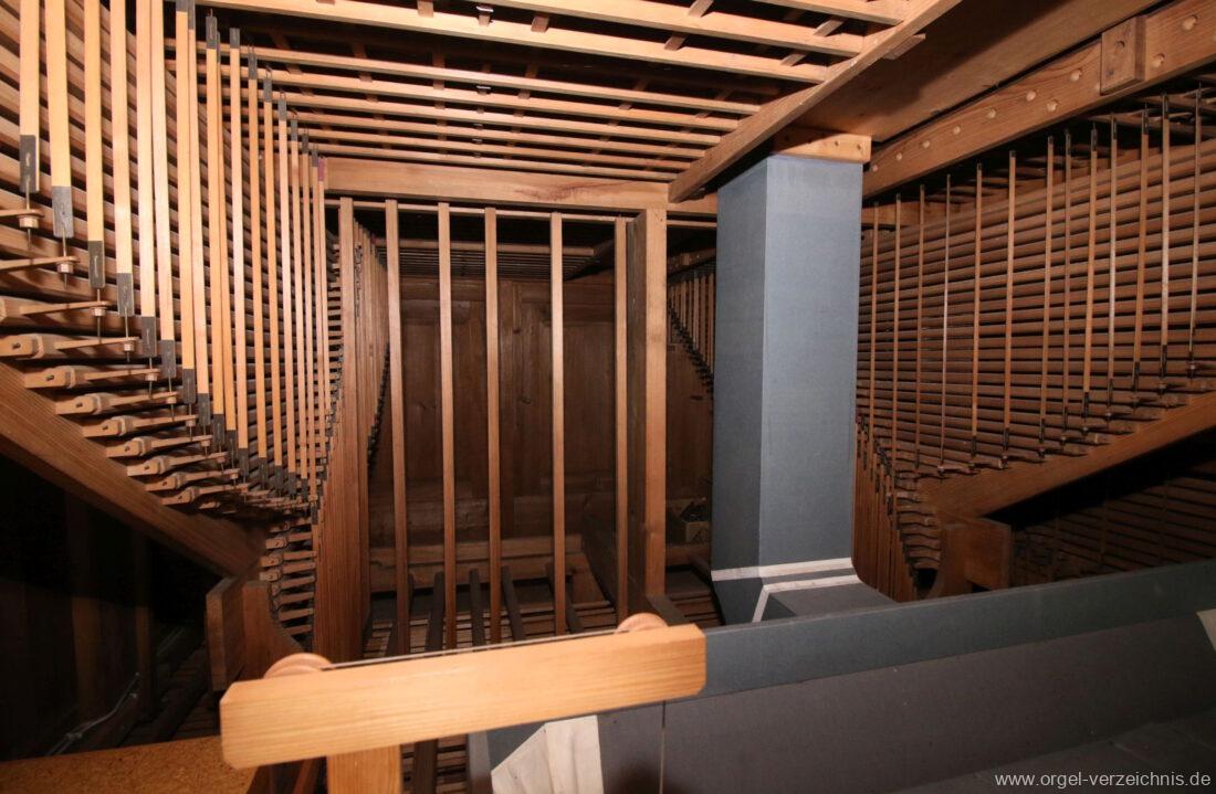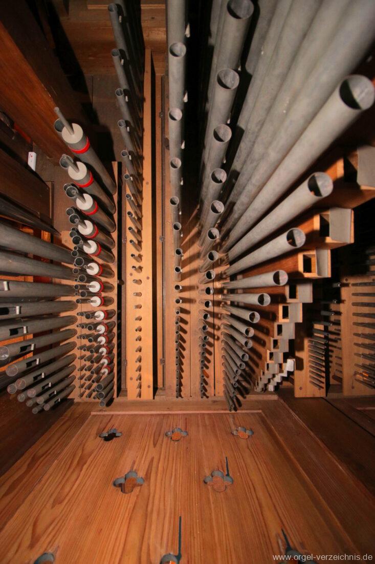Im Unterbau der Orgel sind Metallpfeifen eines 8′ Registers eingelagert, welche jedoch nicht historisch sind. Ebenso ist eine Leitung für eine Walze oder Schwellwerk ersichtlich.