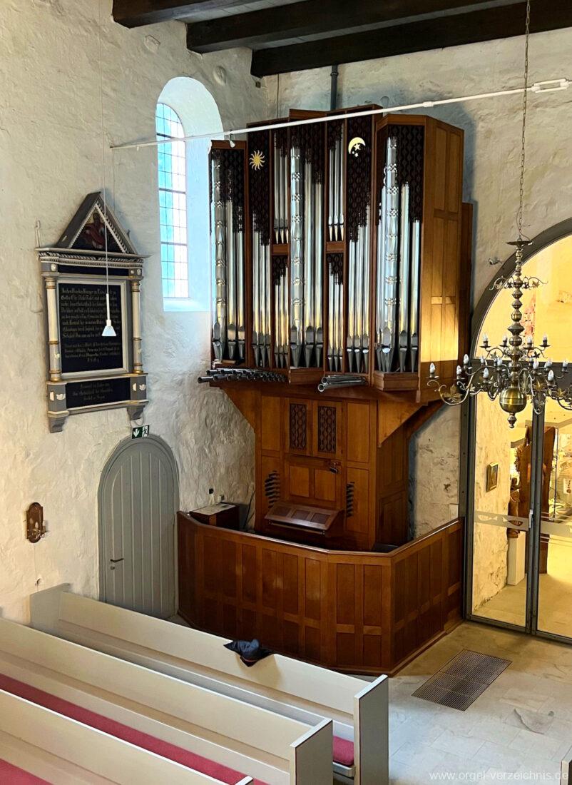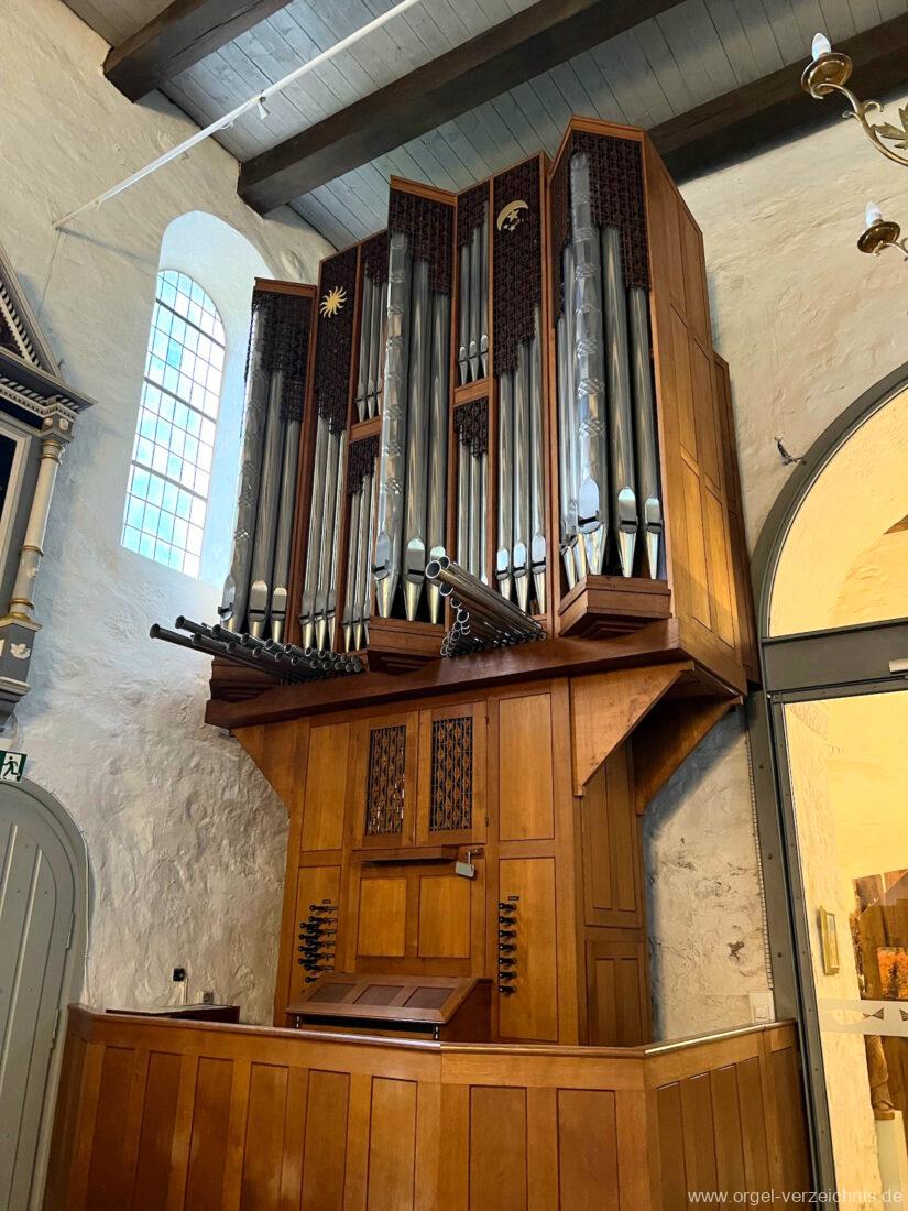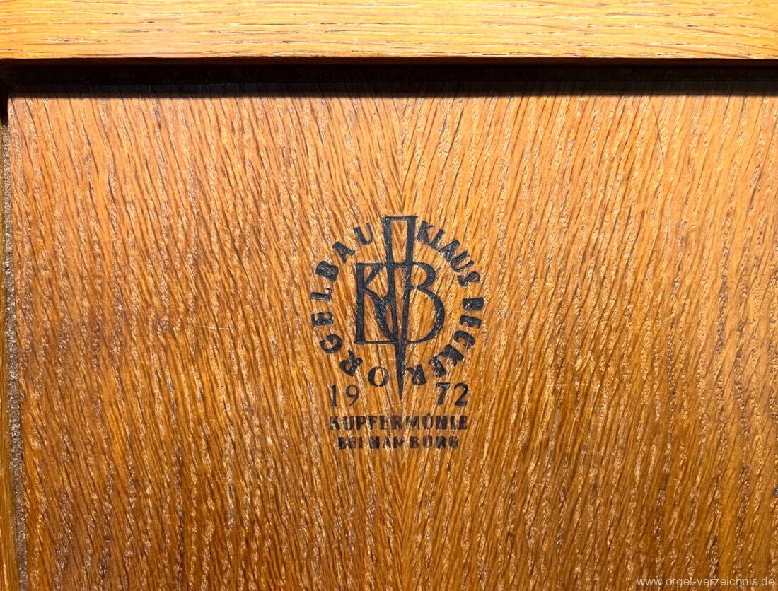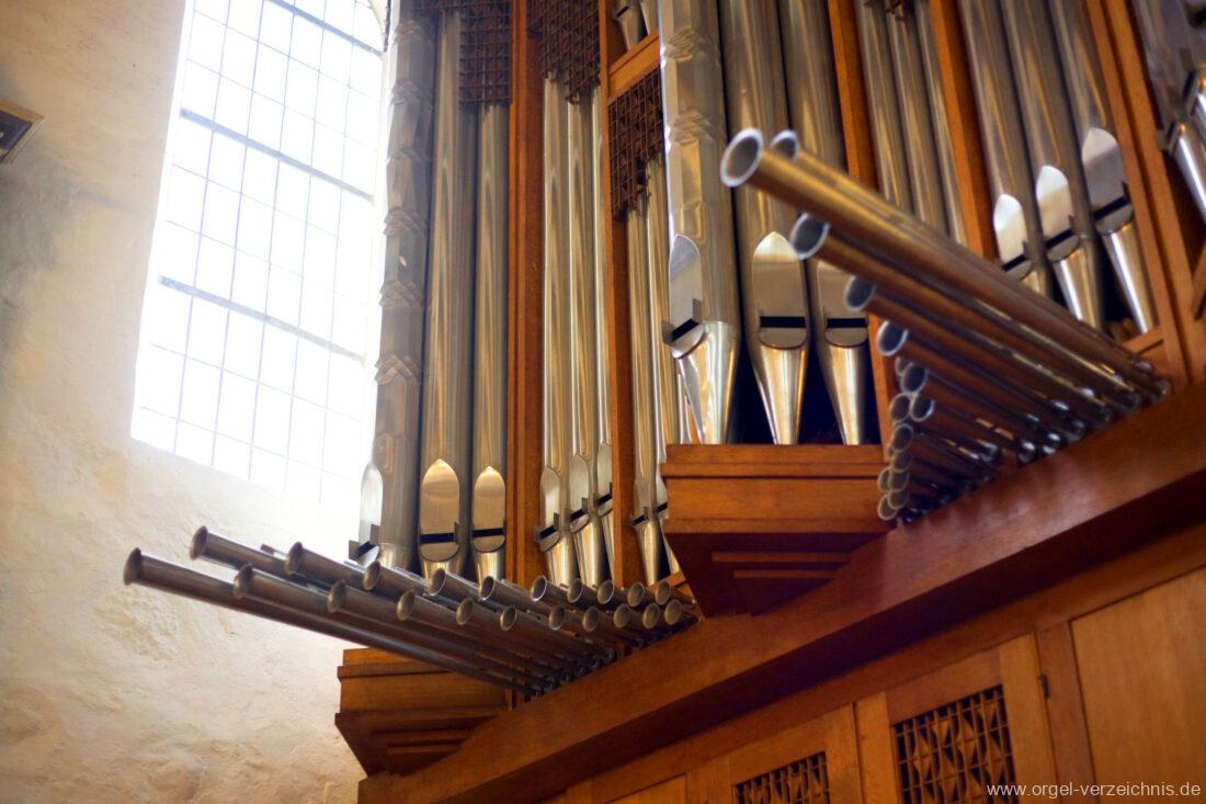 1972 mechanische Schleifladenorgel, erbaut ebenerdig im Kirchenraum seitlich des Zwischenportales mit mittig fest ins Gehäuse eingelassenem Spieltisch durch Orgelbau Klaus Becker (Kupfermühle bei Hamburg) II/18.