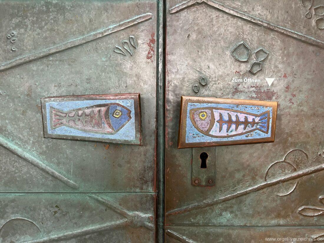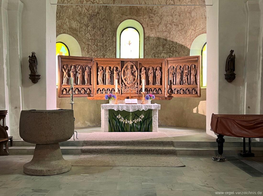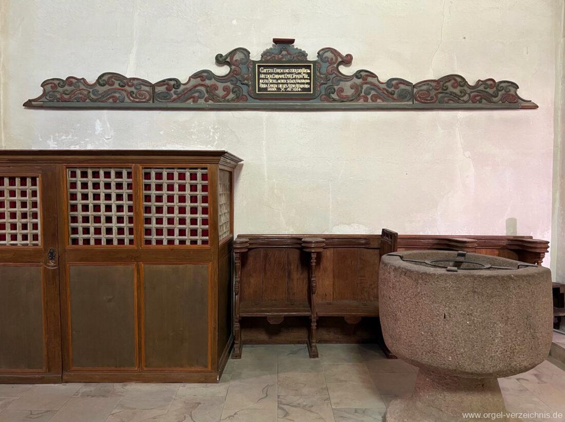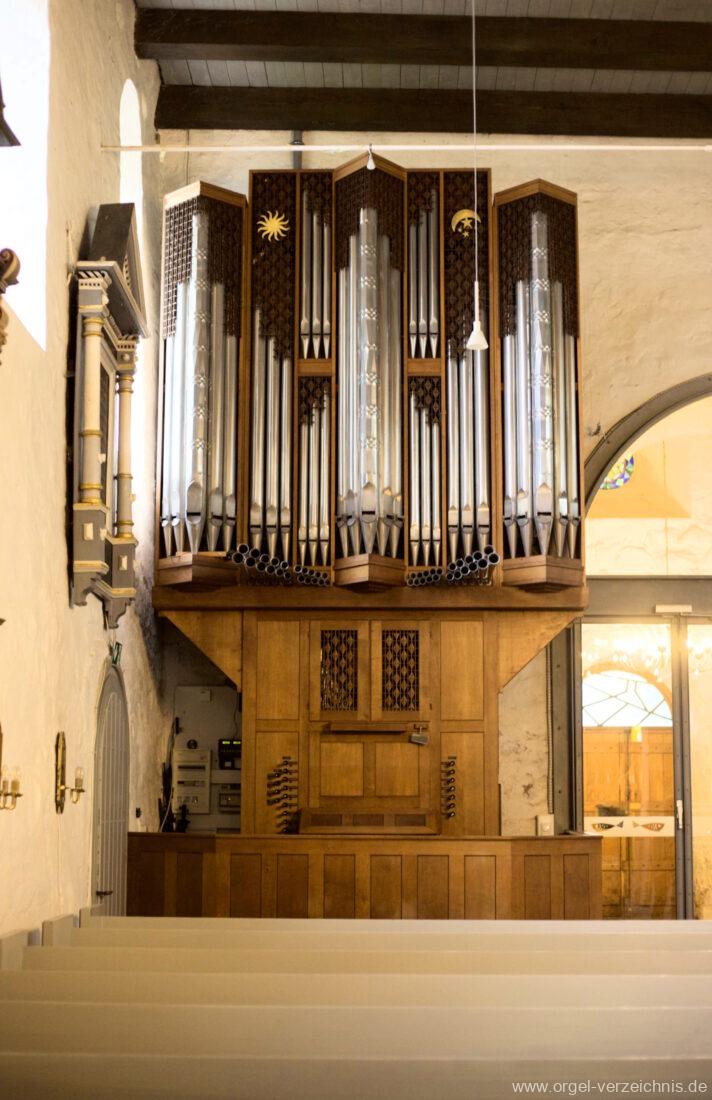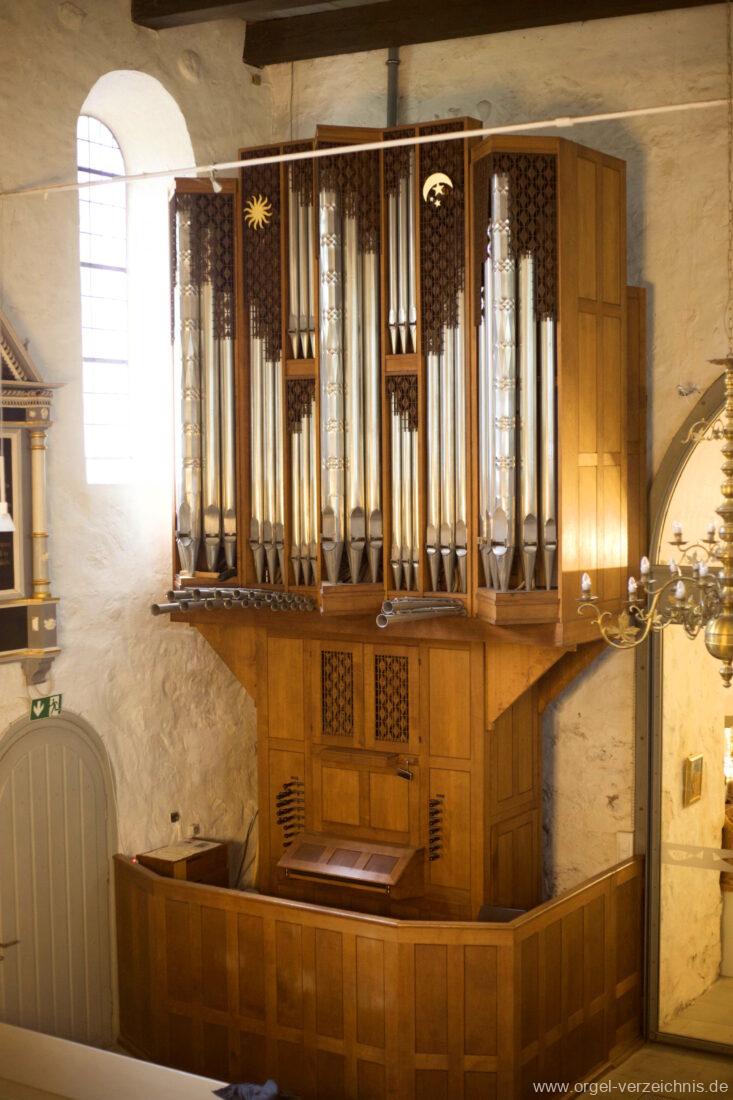 1972 mechanische Schleifladenorgel, erbaut ebenerdig im Kirchenraum seitlich des Zwischenportales mit mittig fest ins Gehäuse eingelassenem Spieltisch durch Orgelbau Klaus Becker (Kupfermühle bei Hamburg) II/18.