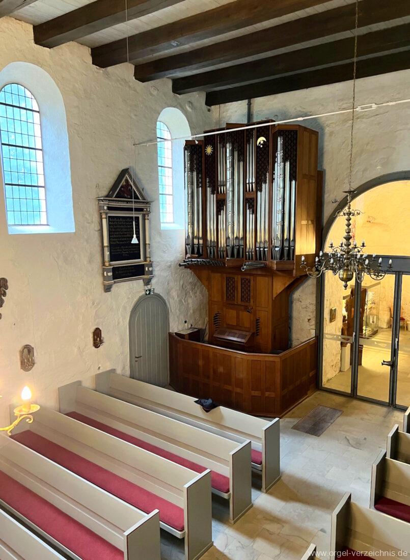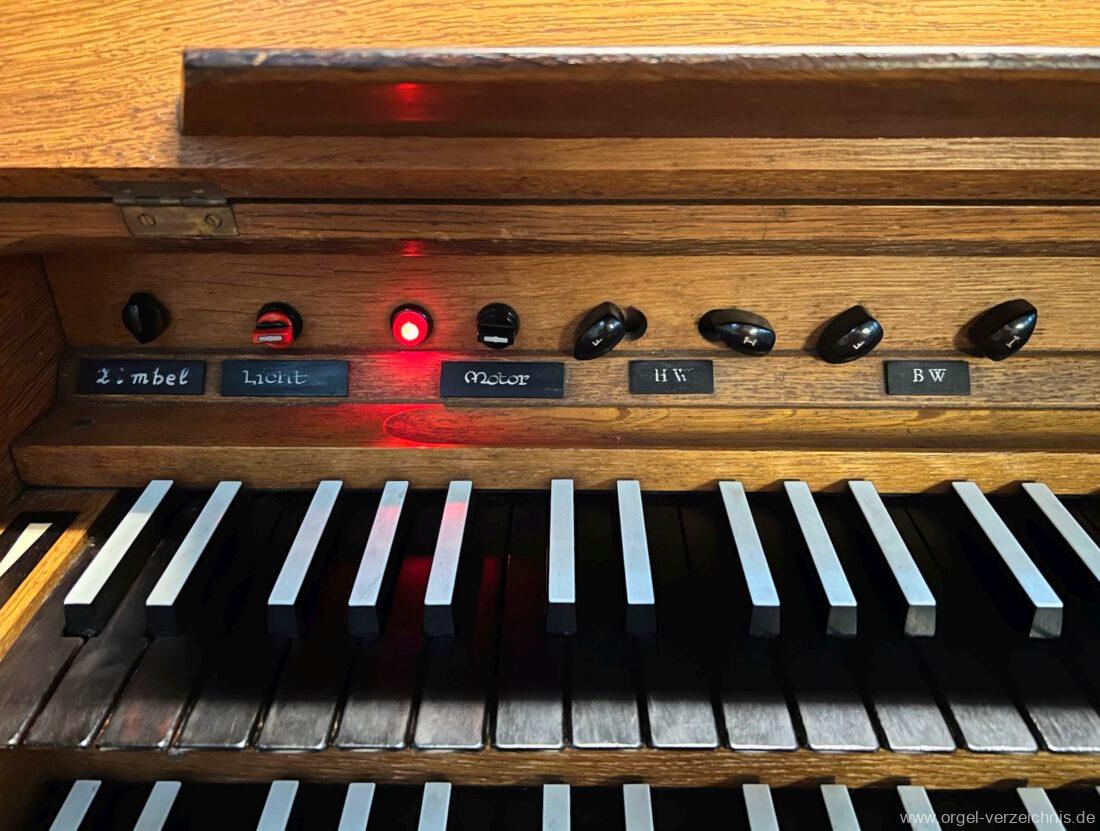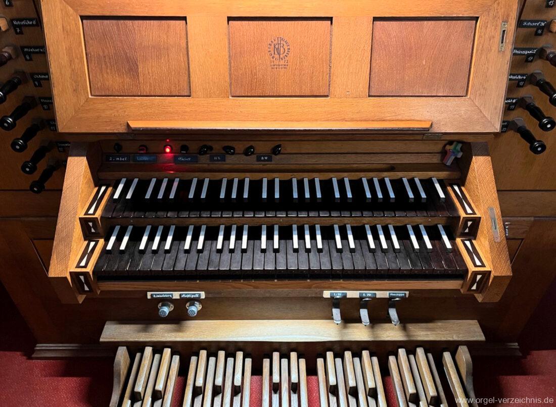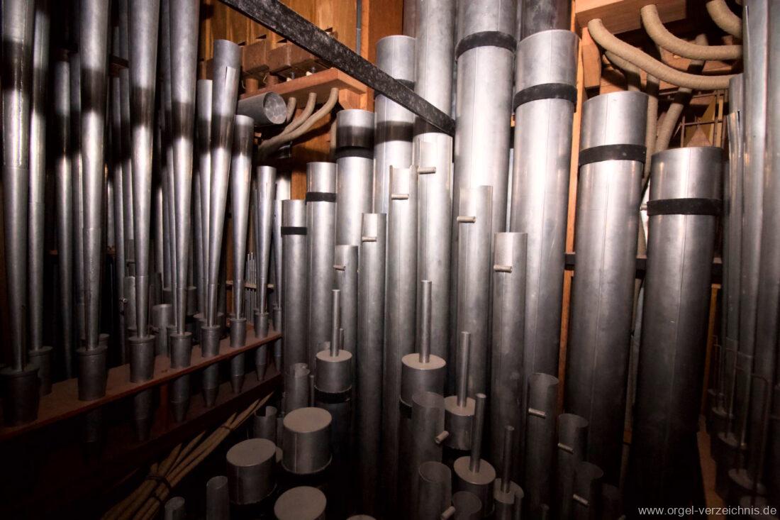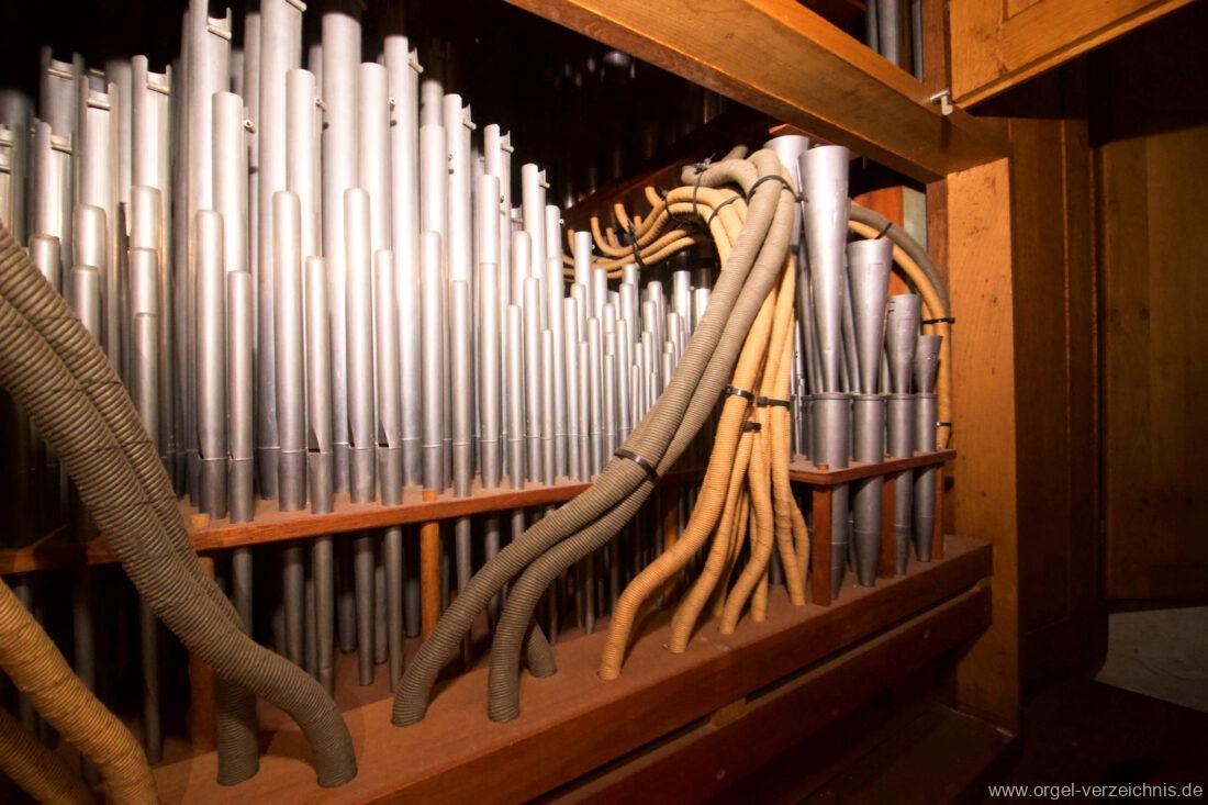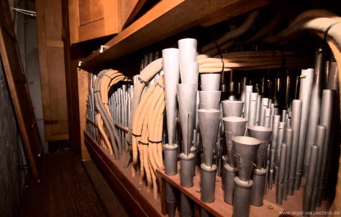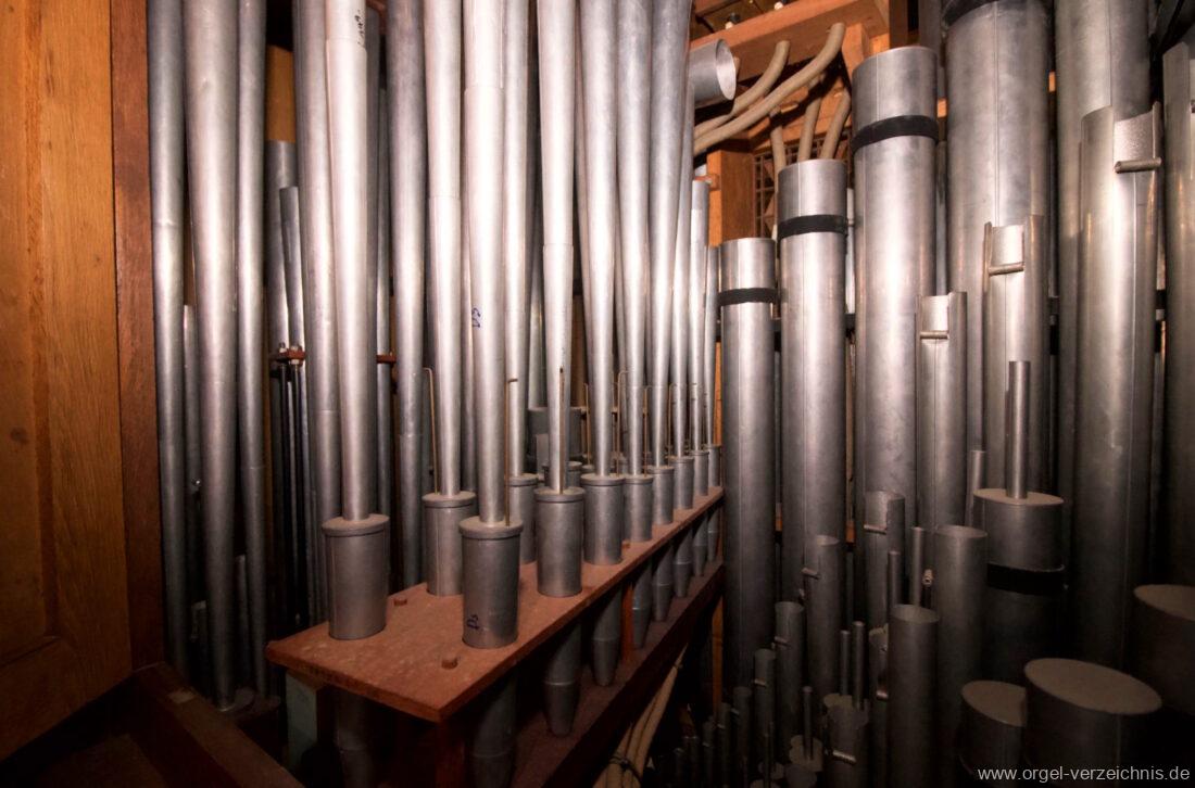 I Hauptwerk C – g“‘Prinzipal 8′ C – E Prospekt, ab F innen Rohrflöte 8′ C – H Holz ged., ab c° Metall rohrged. Oktave 4′ C – H Prospekt, ab c° innen Gedackt 4′ Metall ged., ab fs“ offen konisch Gemshorn 2′ Metall konisch Mixtur 4f. rep. c°/c’/g’/gs“ Trompete 8′ Stiefel/Becher Metall Clarine 4′ horizontal, Stiefel Holz im Gehäuse, Becher Metall, ab fs“ labial innen Tremolant