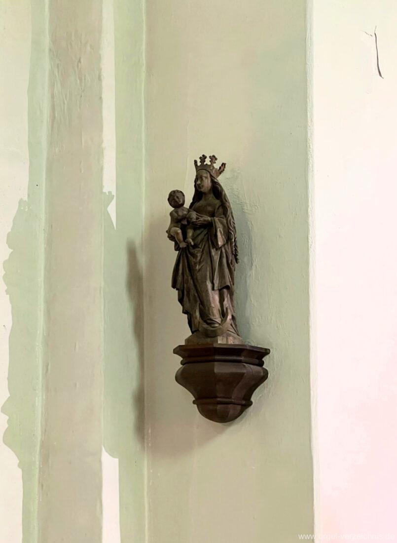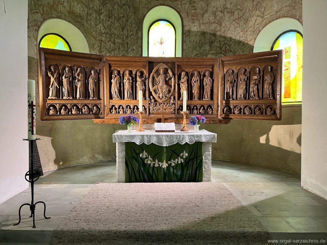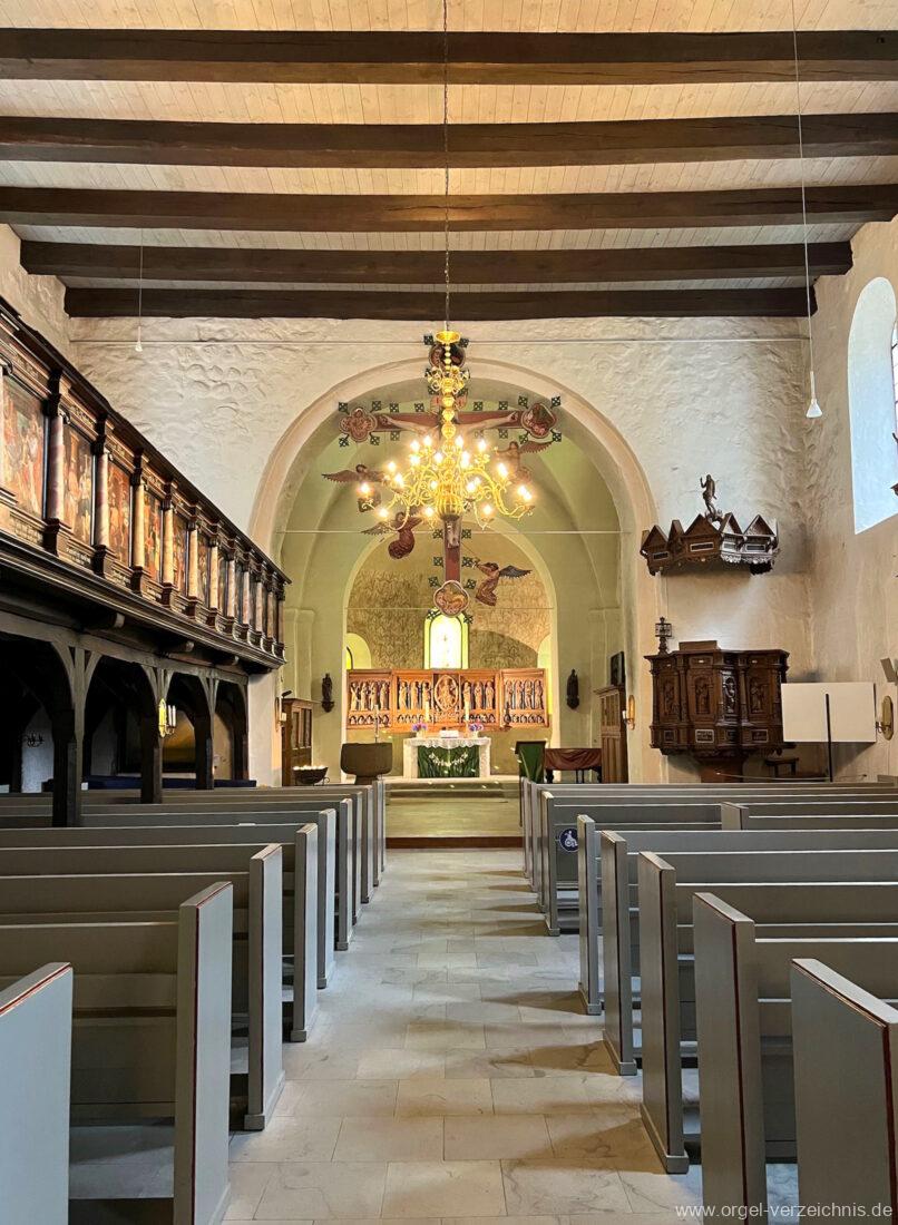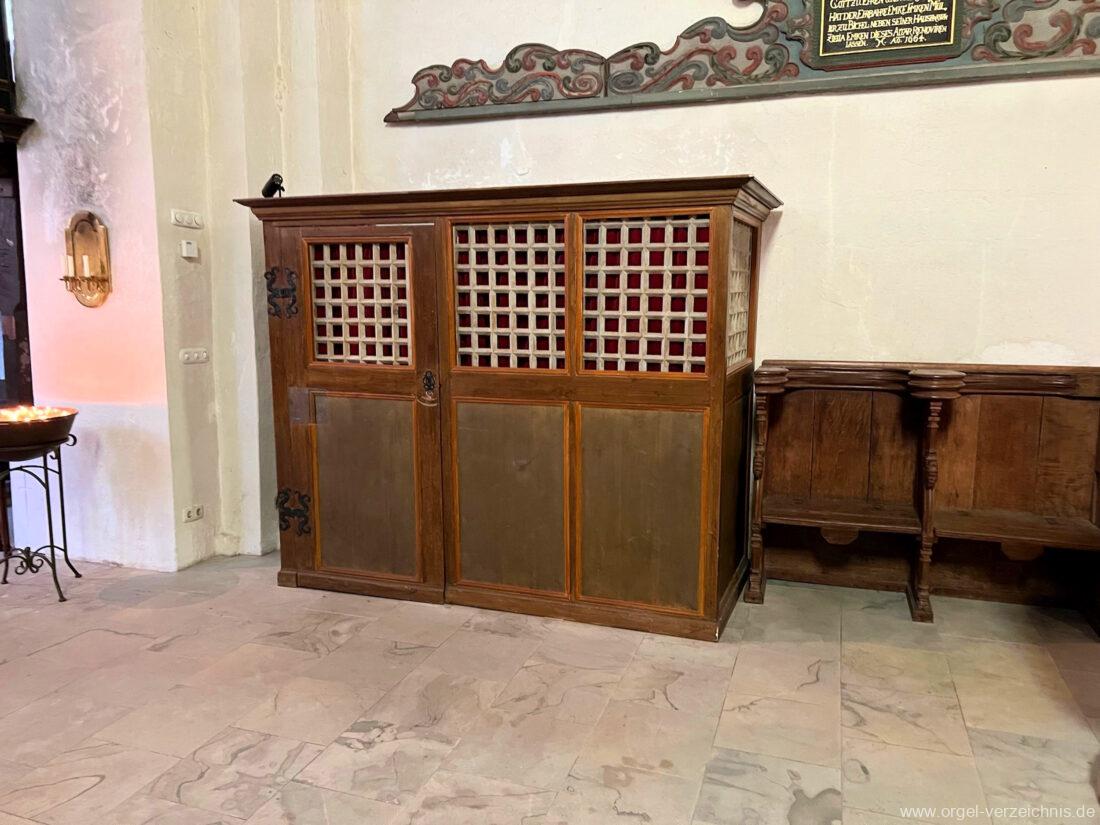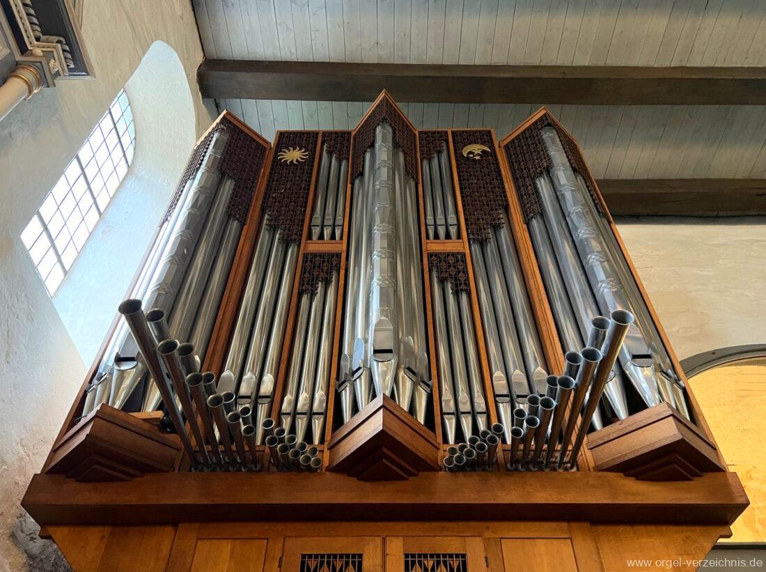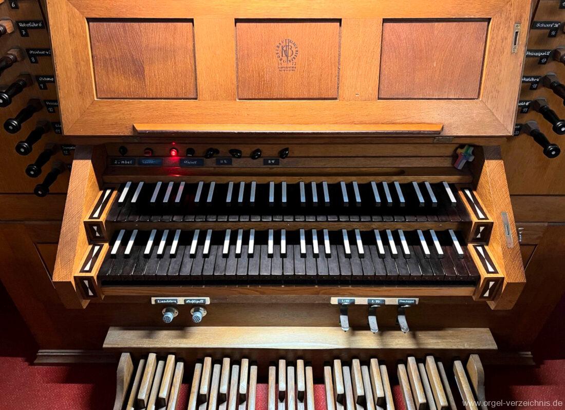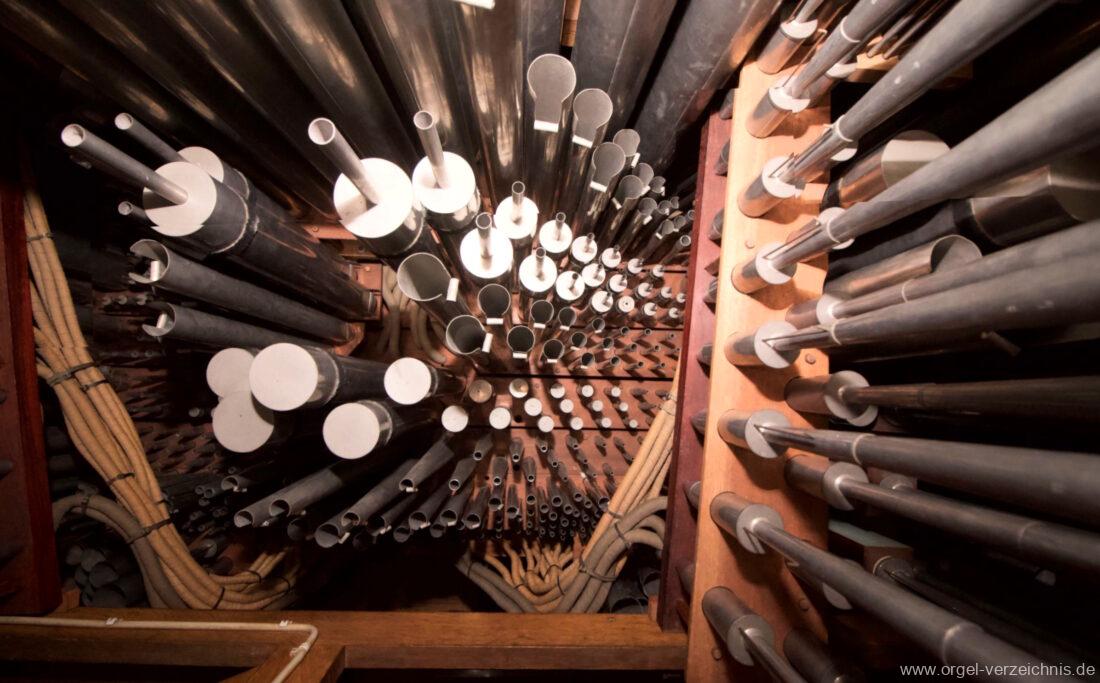 I Hauptwerk C – g“‘Prinzipal 8′ C – E Prospekt, ab F innen Rohrflöte 8′ C – H Holz ged., ab c° Metall rohrged. Oktave 4′ C – H Prospekt, ab c° innen Gedackt 4′ Metall ged., ab fs“ offen konisch Gemshorn 2′ Metall konisch Mixtur 4f. rep. c°/c’/g’/gs“ Trompete 8′ Stiefel/Becher Metall Clarine 4′ horizontal, Stiefel Holz im Gehäuse, Becher Metall, ab fs“ labial innen Tremolant