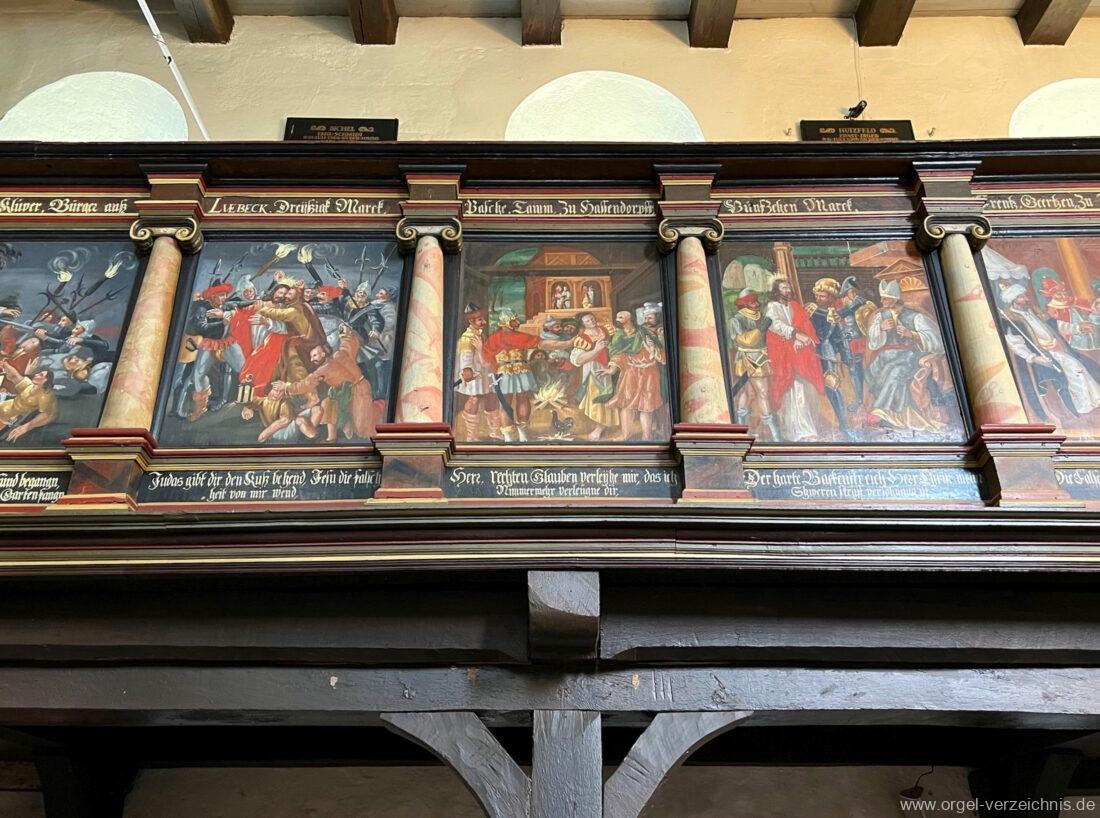1656 Entstehung der Nordempore und der Emporenbilder; die Bilder durch die Maler Hanß Welcker (Lübeck) mit Hilfe von Maler Hanß Stolz.
