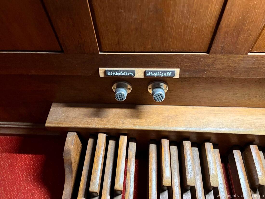 Fuß: Zimbelstern (5 Glocken), Nachtigall als Pistons auf der linken Seite, I/PD, II/PD, Man.Koppel als Pistons auf der rechten Seite