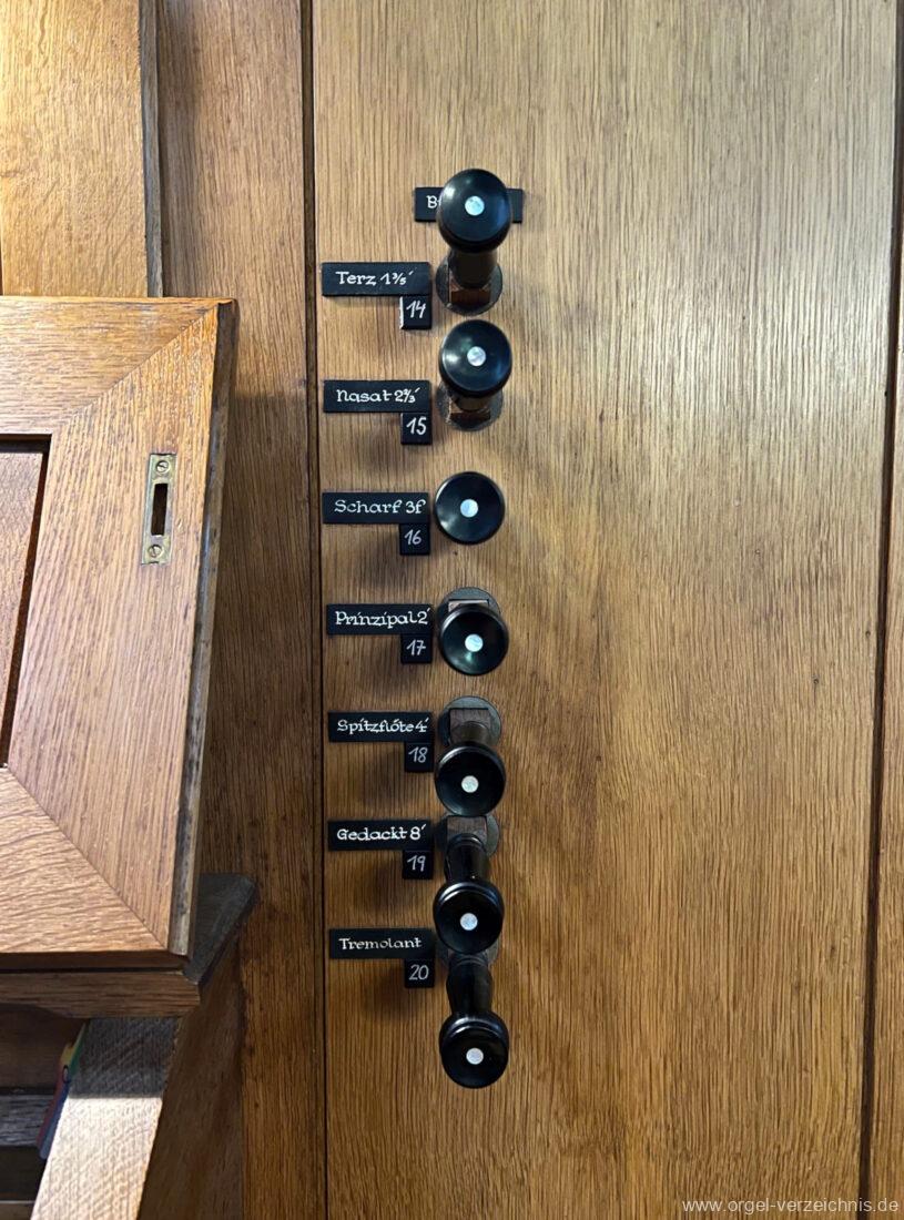 Rechte SeiteTerz 1 3/5′ Nasat 2 2/3′ Scharf 3f Prinzipal 2′ Spitzflöte 4′ Gedackt 8′ Tremolant