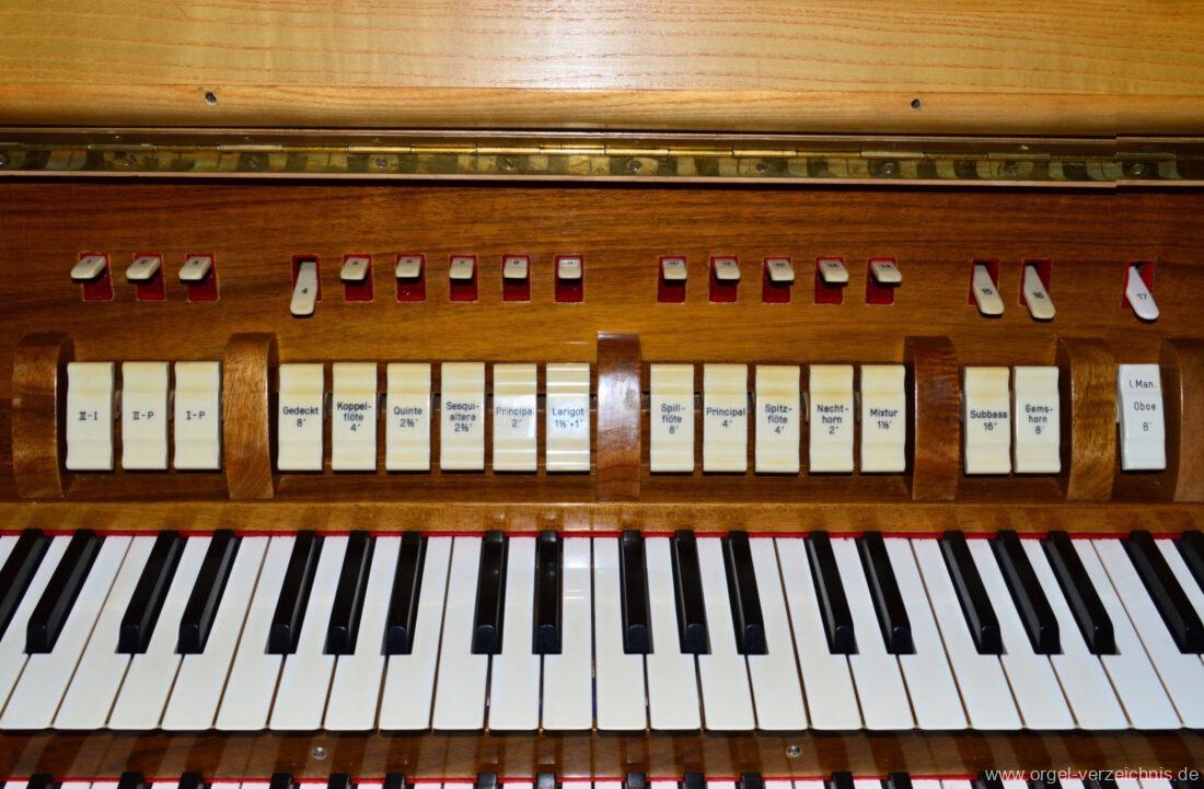 II Positiv C – g“‘Gedeckt 8′ Koppelflöte 4′ Quinte 2 2/3′ Auszug Sesquialtera Principal 2′ Sesquialtera 2-fach 2 2/3′ + 1 3/5′ Larigot 1 1/3′ (vor 2011 urpsr. + 1′) |
