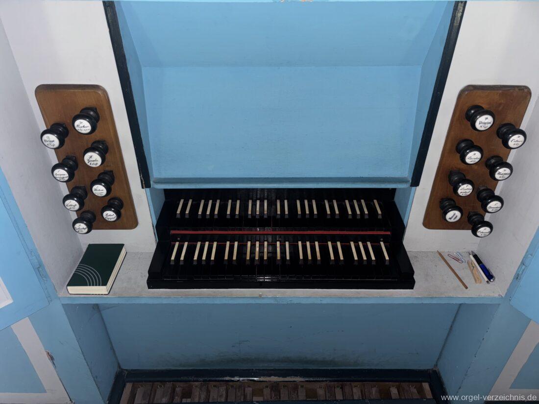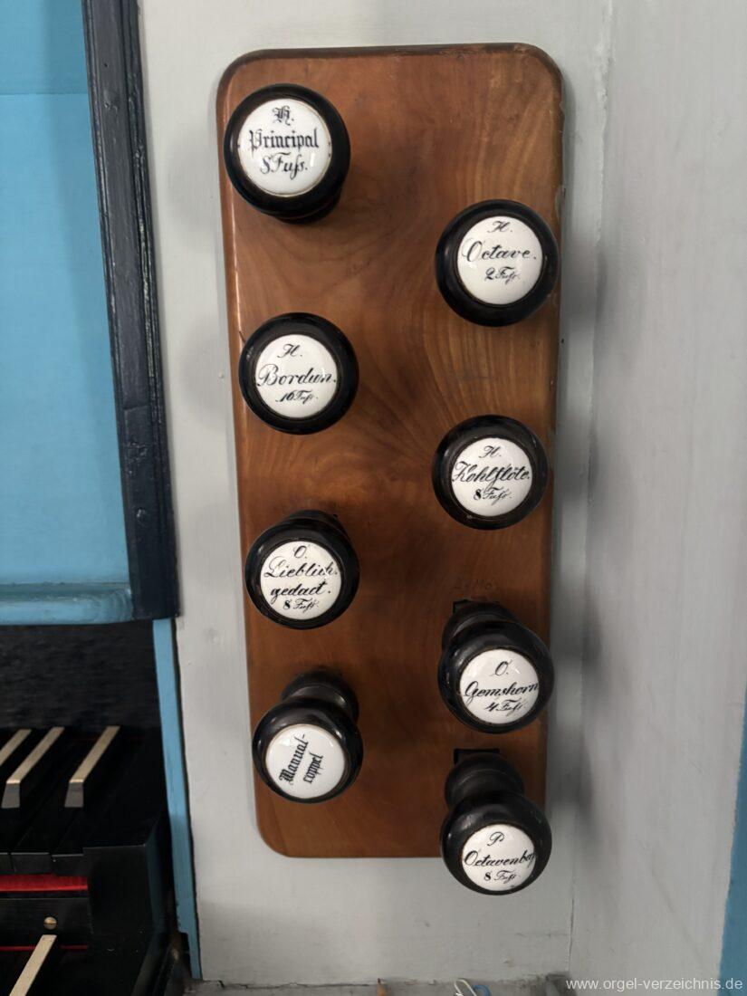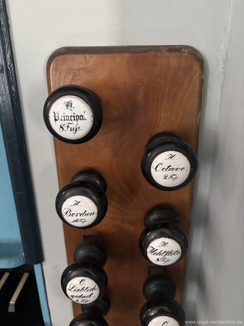 Manual I – Hauptwerk C – d“‘Bordun. 16 Fuß. Principal 8 Fuß. Hohlflöte. 8 Fuß. Gambe. 8 Fuß. Octave 4 Fuß. Octave. 2 Fuß. Mixtur 2 Fuß, 3 fach.