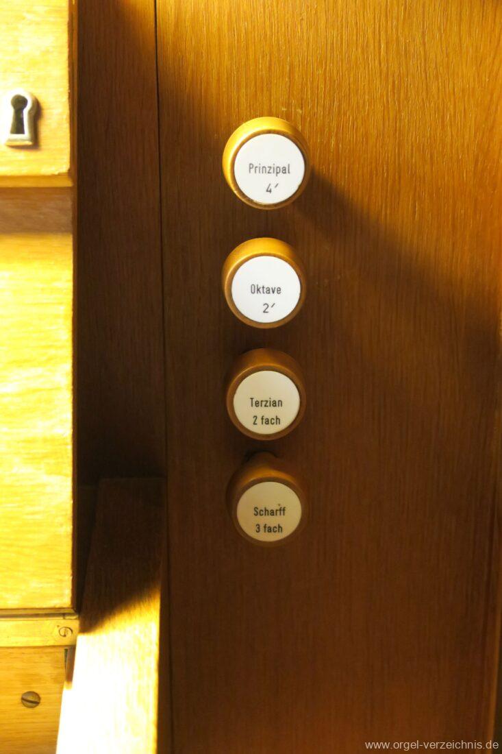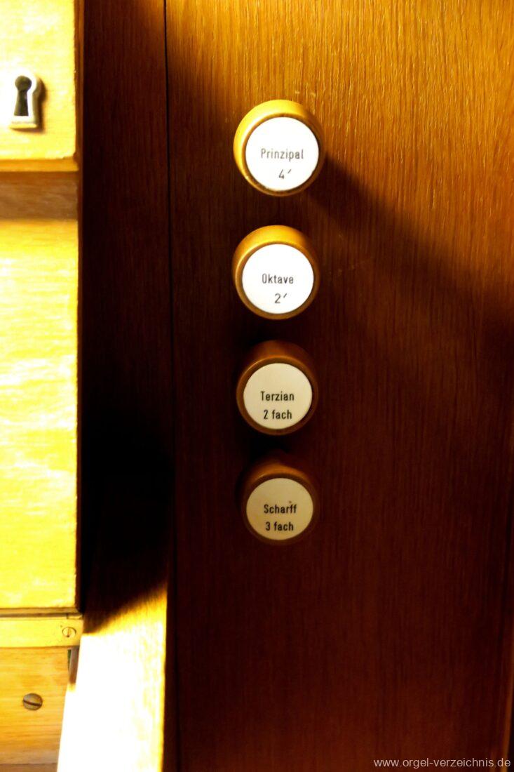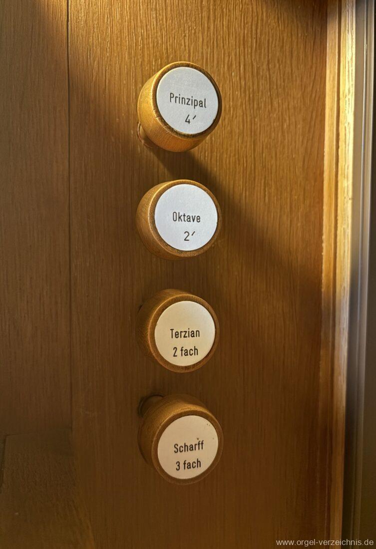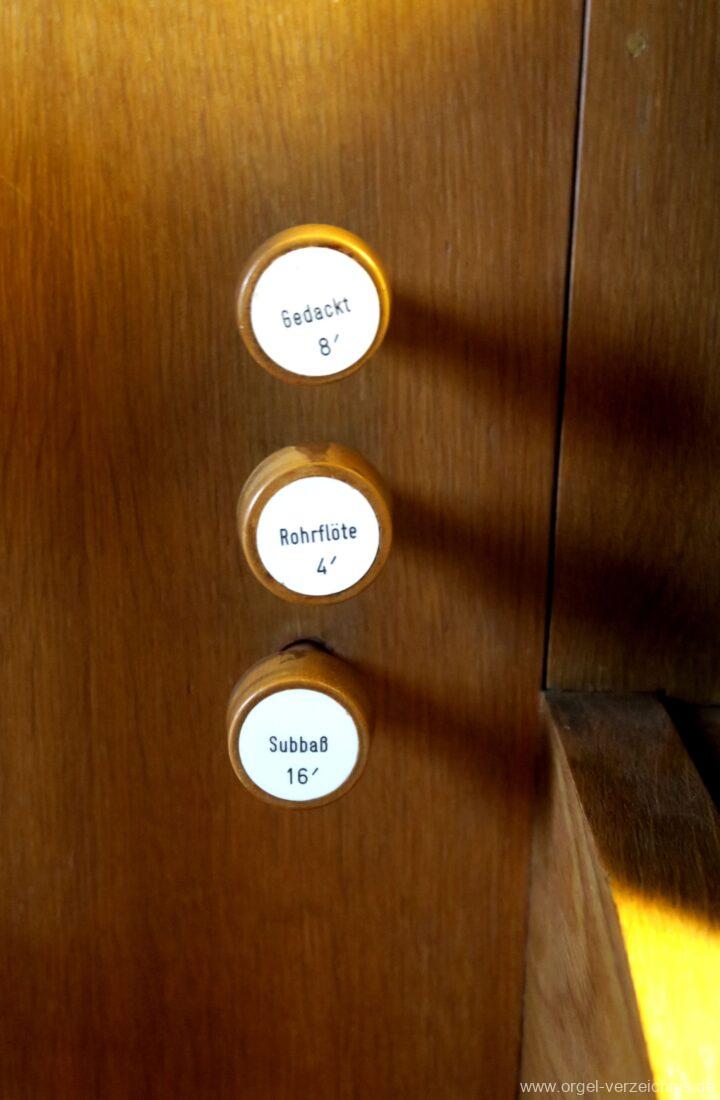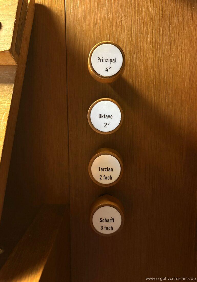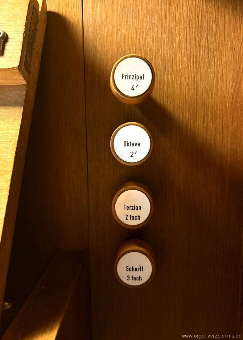 Manual C – c““Gedackt 8′ MPlex ged. Prinzipal 4′ C – F Metall, innen; FS – fs“ Prospekt; ab g“ innen Rohrflöte 4′ Naturguss, rohrged.; ab gs“ offen Oktave 2′ Metall Terzian 2 fach ab b°; b° – f‘ ged.; ab fs‘ offen, konisch Scharff 3 fach 2/3′ – rep. B/gs°/fs’/e“/d“‘