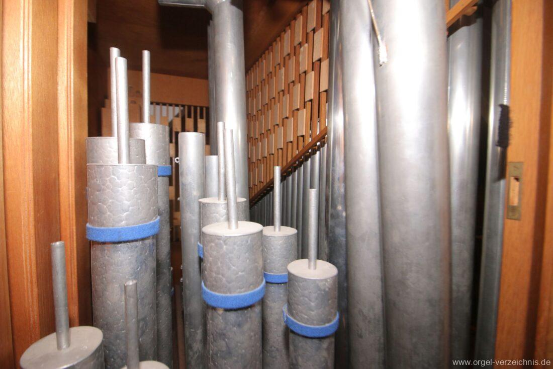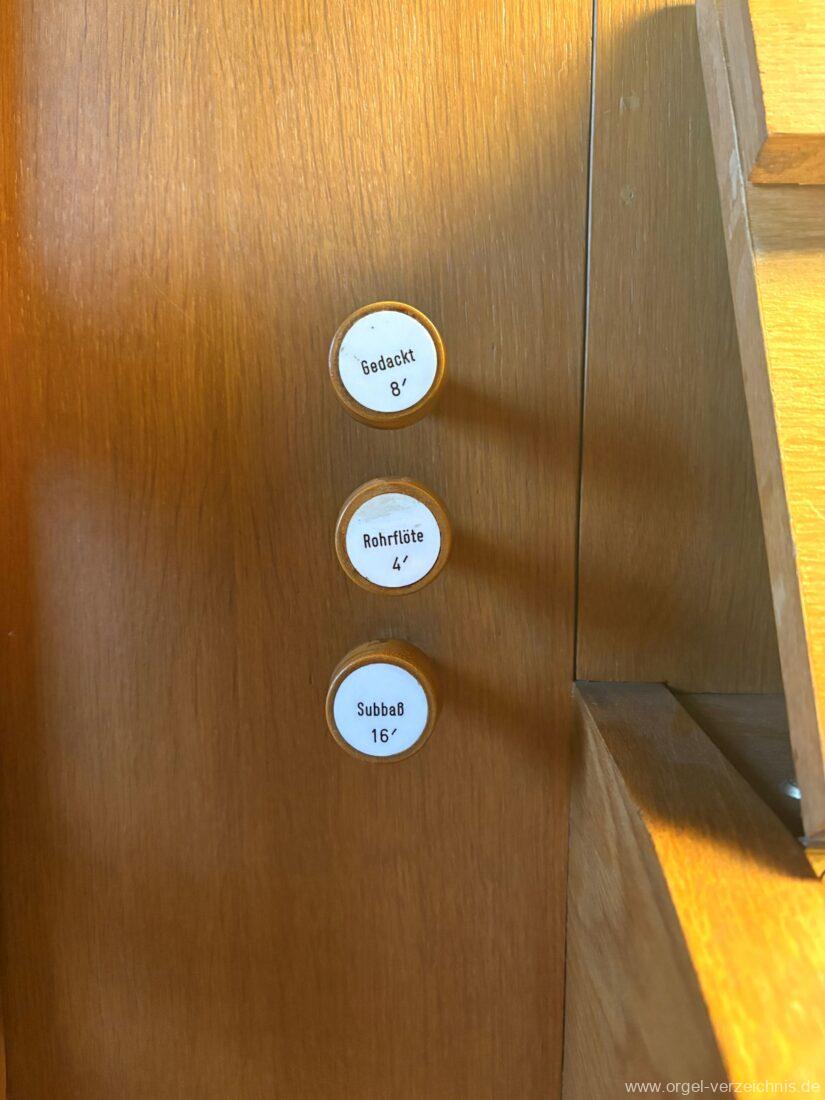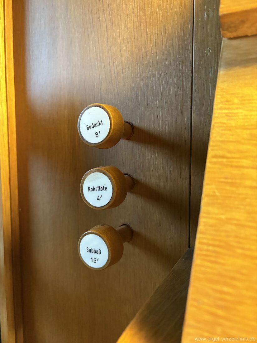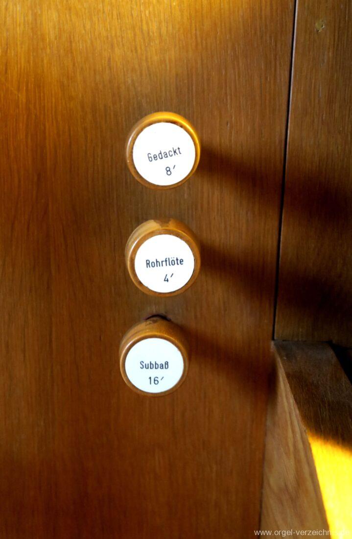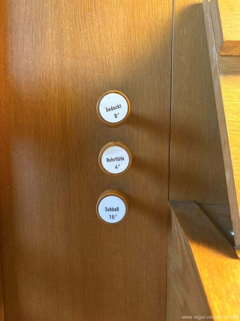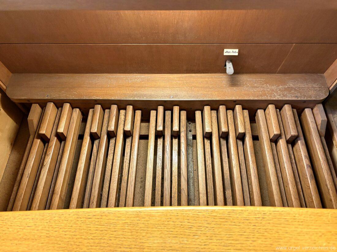 Manual C – c““Gedackt 8′ MPlex ged. Prinzipal 4′ C – F Metall, innen; FS – fs“ Prospekt; ab g“ innen Rohrflöte 4′ Naturguss, rohrged.; ab gs“ offen Oktave 2′ Metall Terzian 2 fach ab b°; b° – f‘ ged.; ab fs‘ offen, konisch Scharff 3 fach 2/3′ – rep. B/gs°/fs’/e“/d“‘