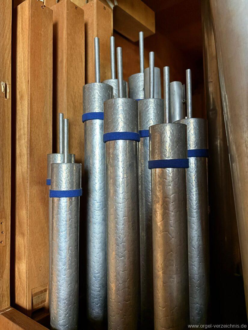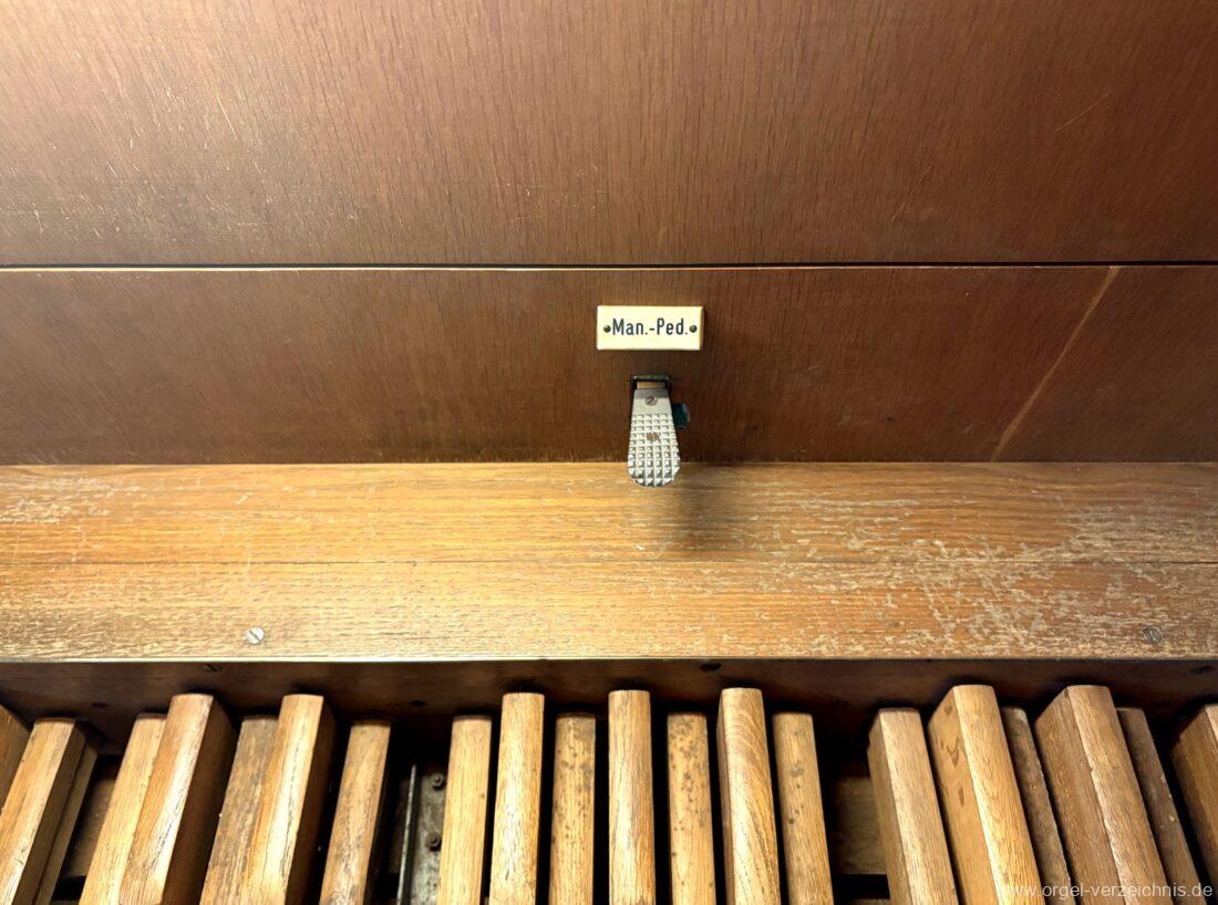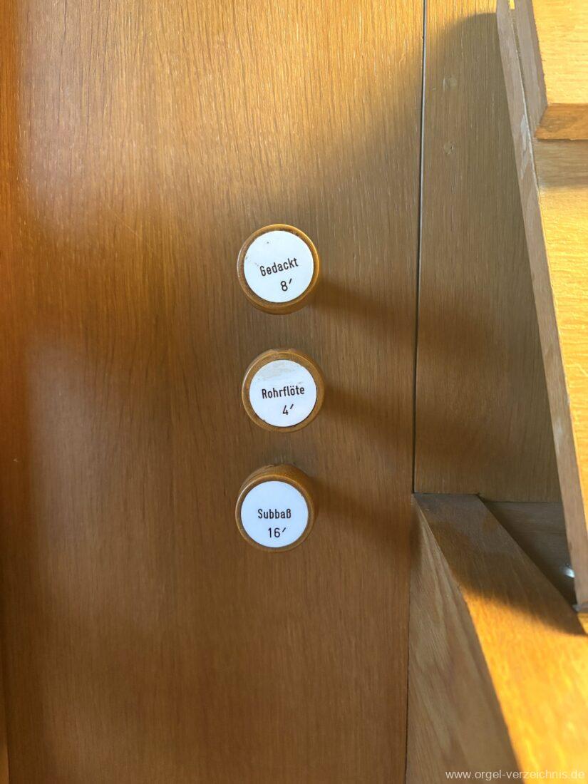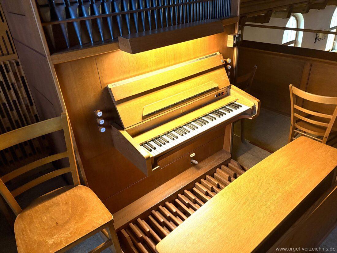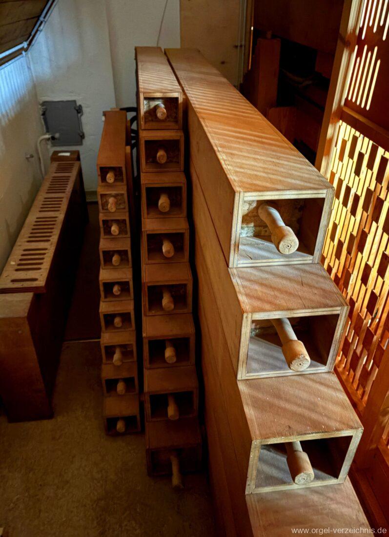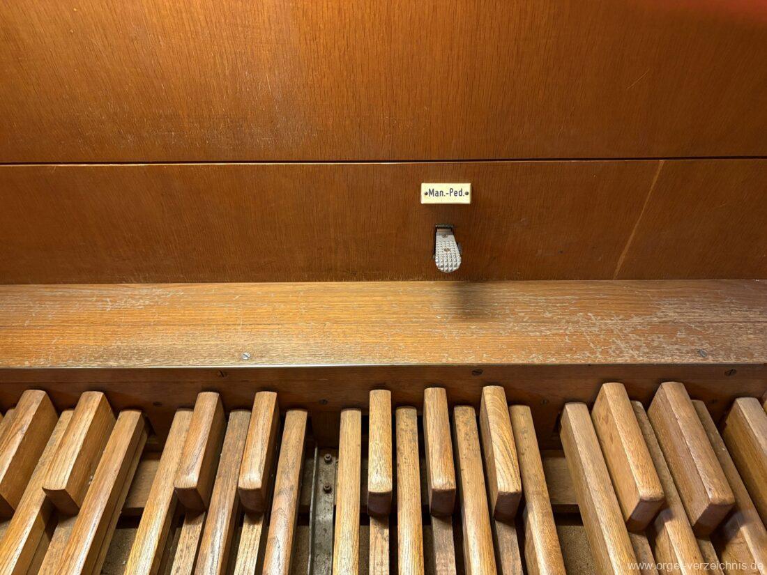 Manual C – c““Gedackt 8′ MPlex ged. Prinzipal 4′ C – F Metall, innen; FS – fs“ Prospekt; ab g“ innen Rohrflöte 4′ Naturguss, rohrged.; ab gs“ offen Oktave 2′ Metall Terzian 2 fach ab b°; b° – f‘ ged.; ab fs‘ offen, konisch Scharff 3 fach 2/3′ – rep. B/gs°/fs’/e“/d“‘