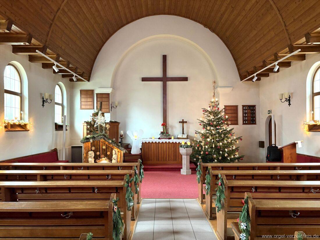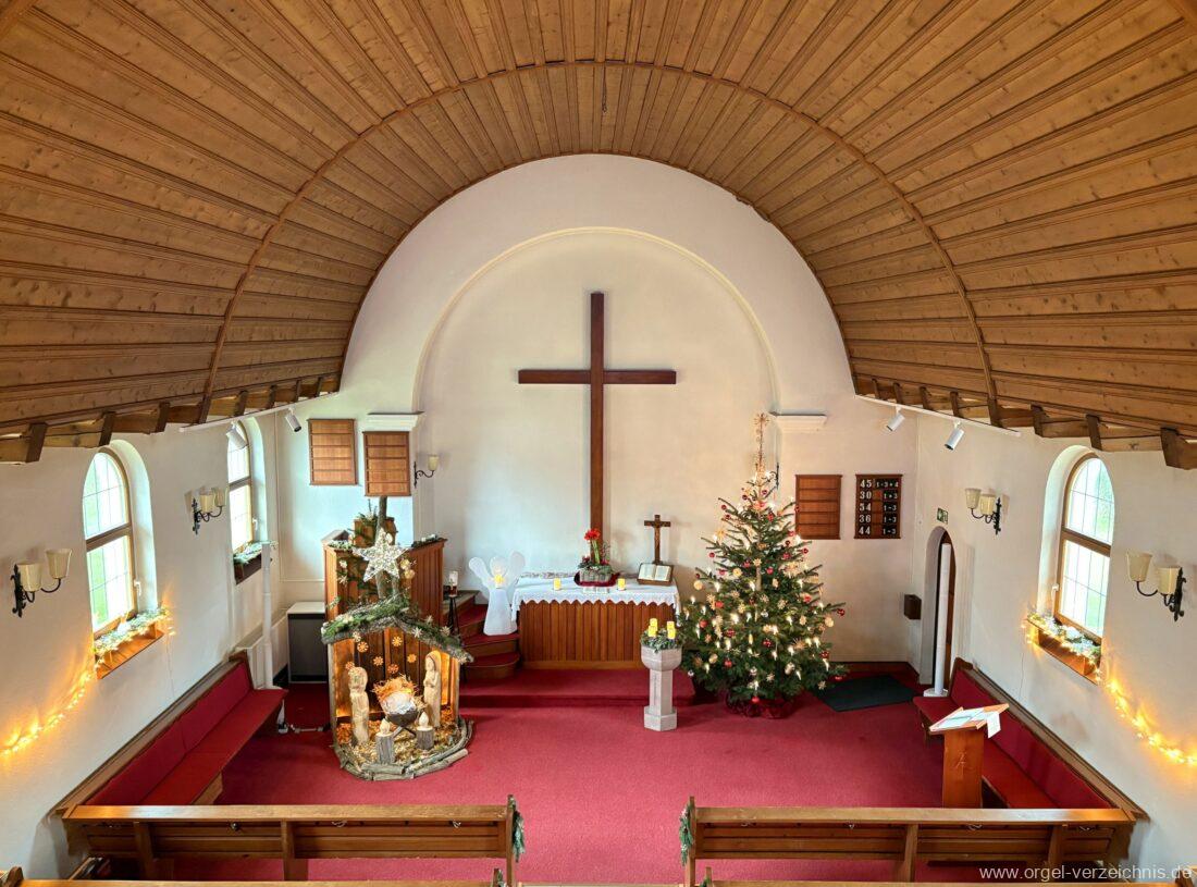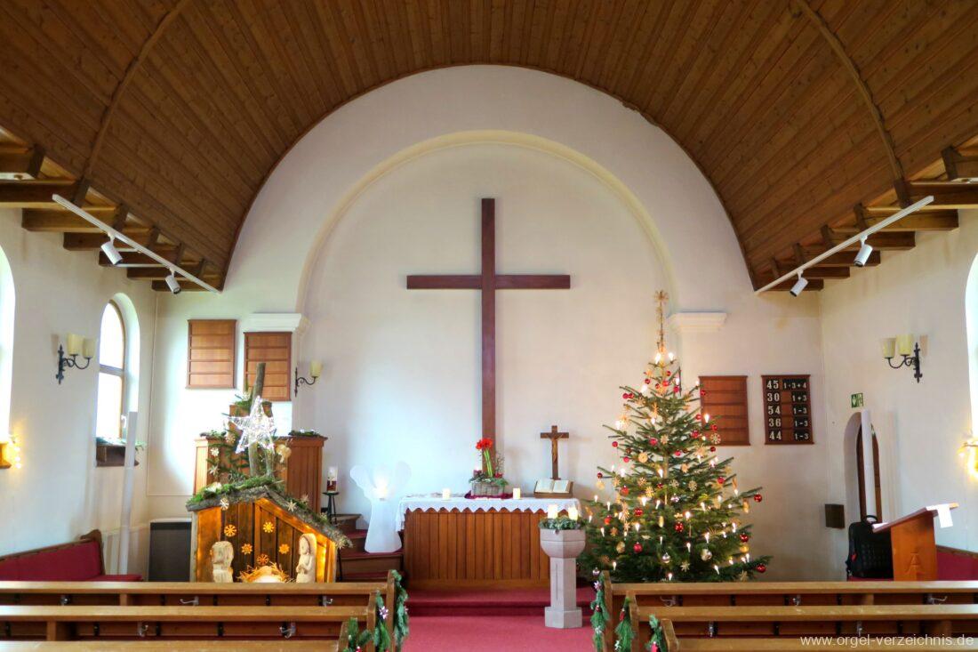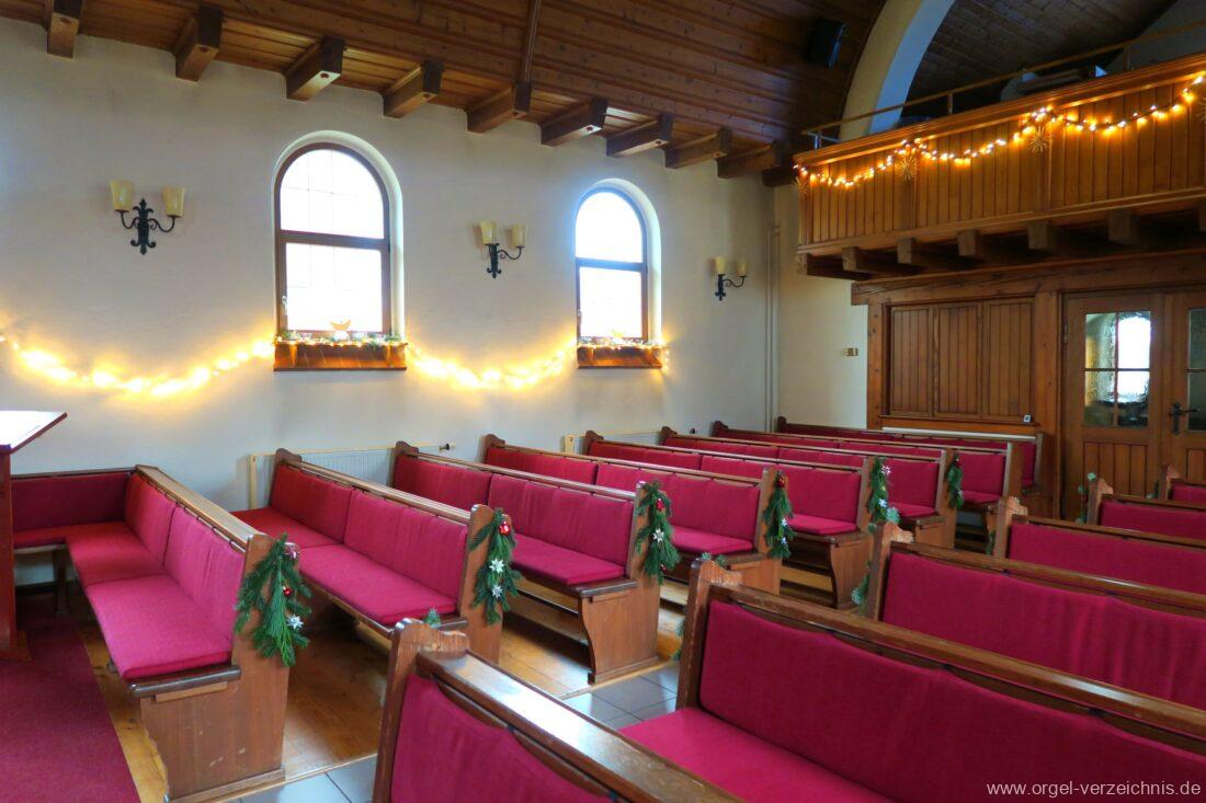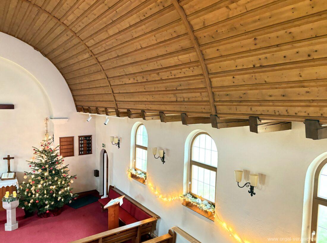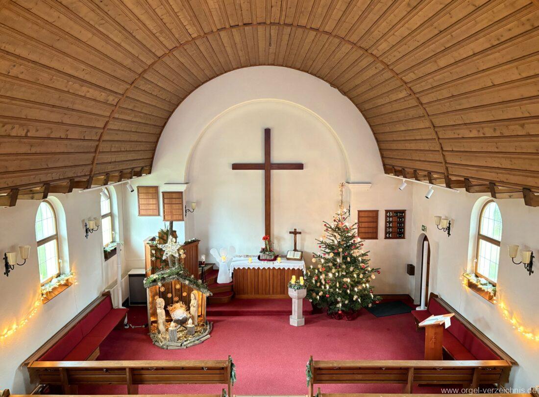 Manual C – c““Gedackt 8′ MPlex ged. Prinzipal 4′ C – F Metall, innen; FS – fs“ Prospekt; ab g“ innen Rohrflöte 4′ Naturguss, rohrged.; ab gs“ offen Oktave 2′ Metall Terzian 2 fach ab b°; b° – f‘ ged.; ab fs‘ offen, konisch Scharff 3 fach 2/3′ – rep. B/gs°/fs’/e“/d“‘