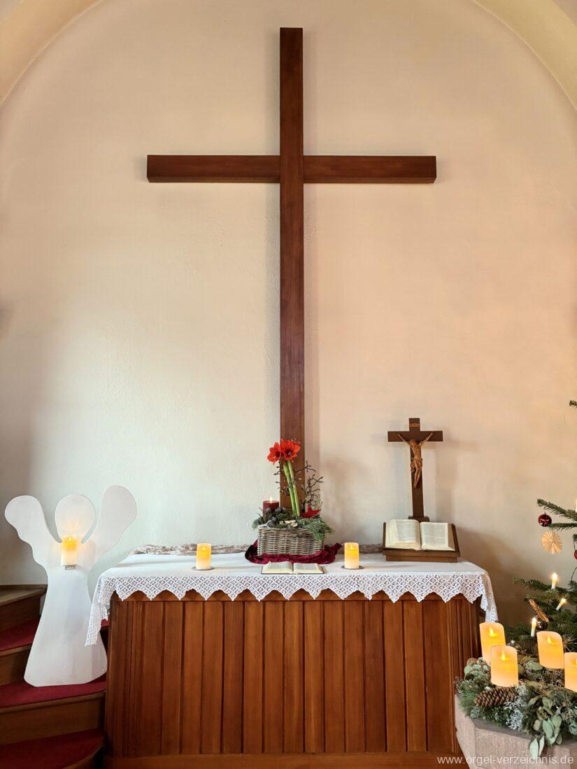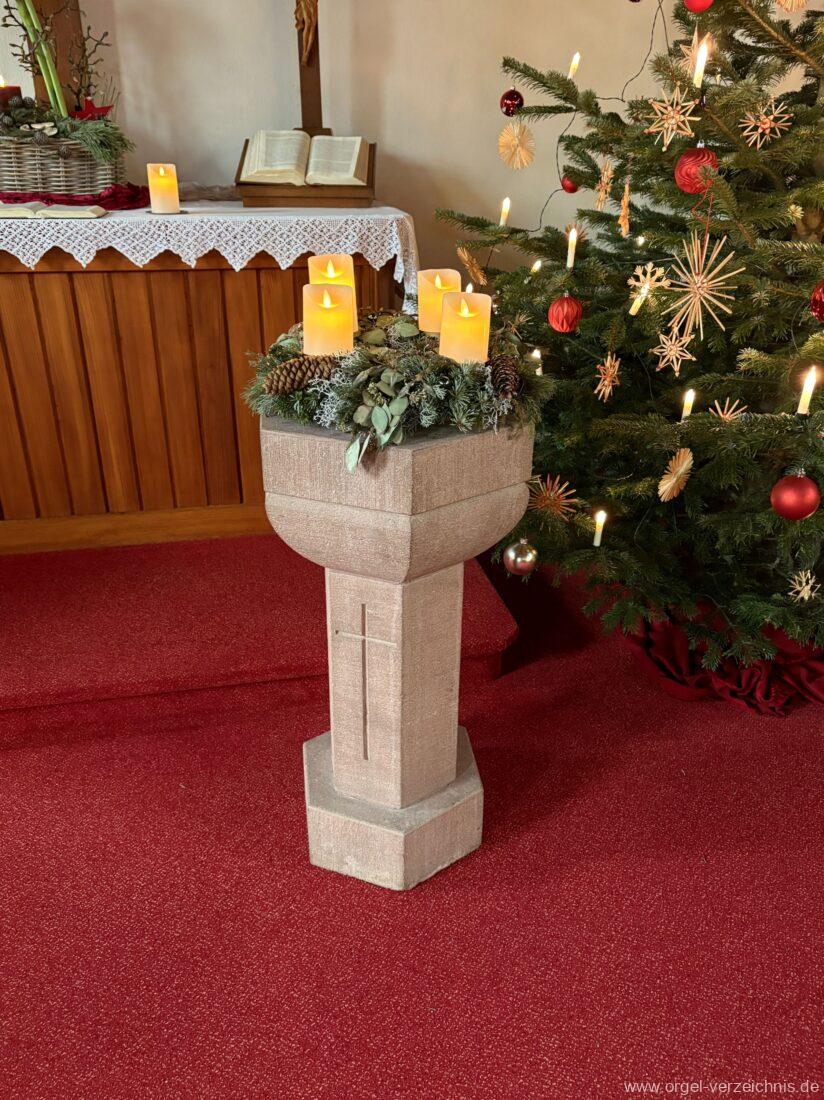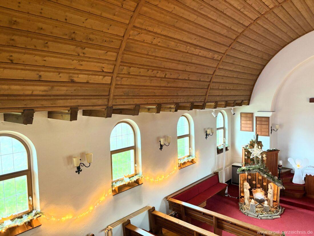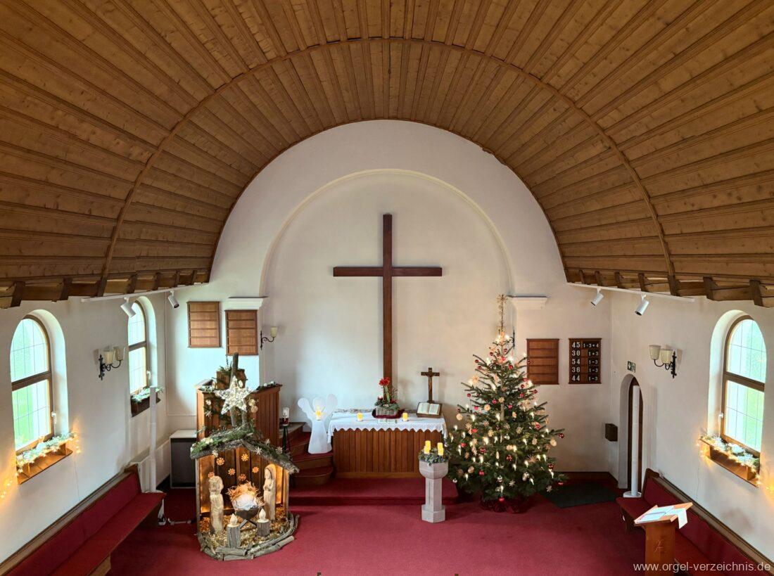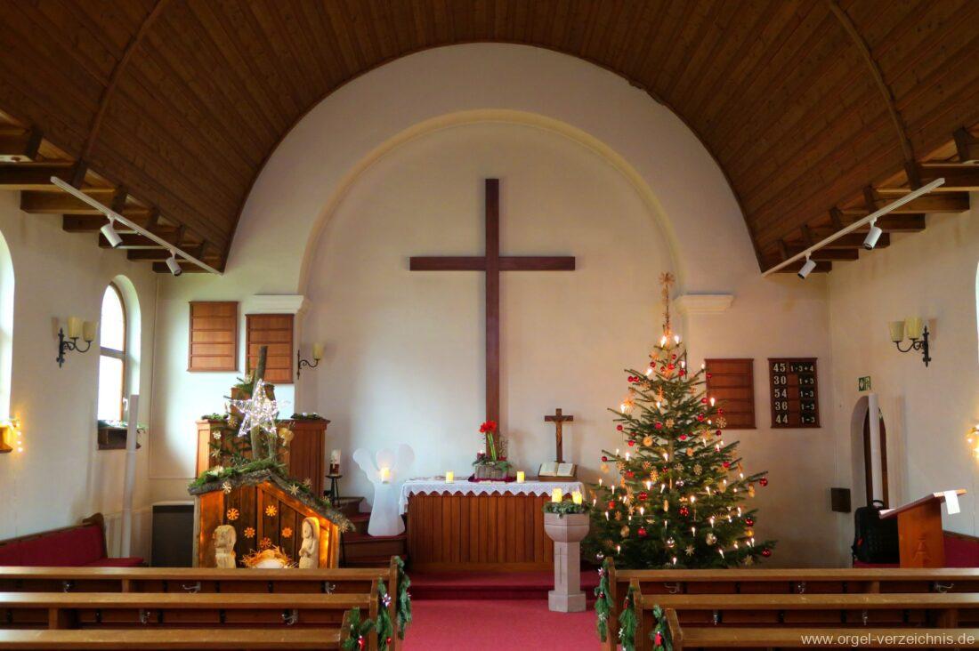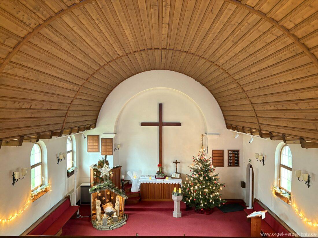 Manual C – c““Gedackt 8′ MPlex ged. Prinzipal 4′ C – F Metall, innen; FS – fs“ Prospekt; ab g“ innen Rohrflöte 4′ Naturguss, rohrged.; ab gs“ offen Oktave 2′ Metall Terzian 2 fach ab b°; b° – f‘ ged.; ab fs‘ offen, konisch Scharff 3 fach 2/3′ – rep. B/gs°/fs’/e“/d“‘