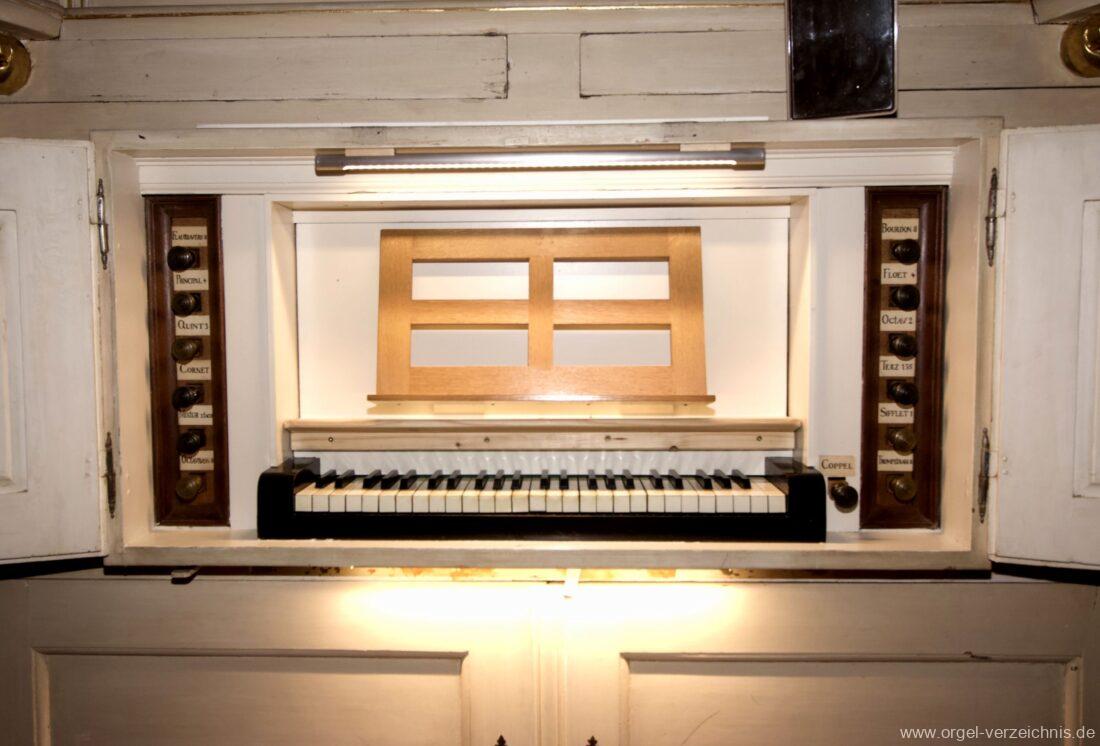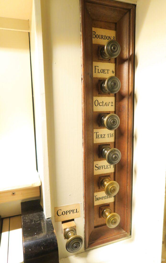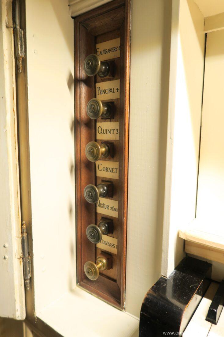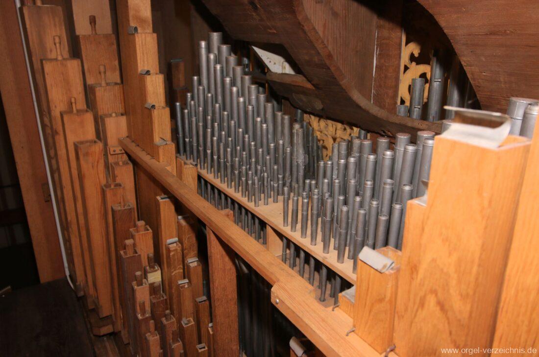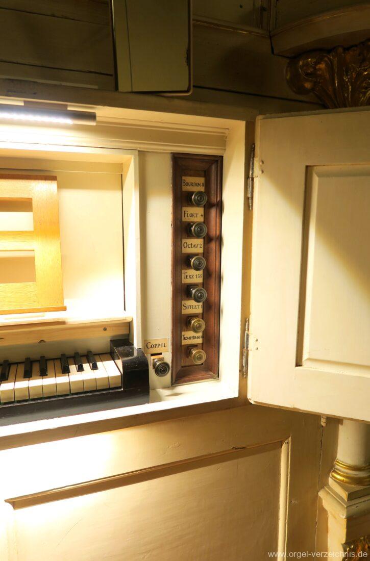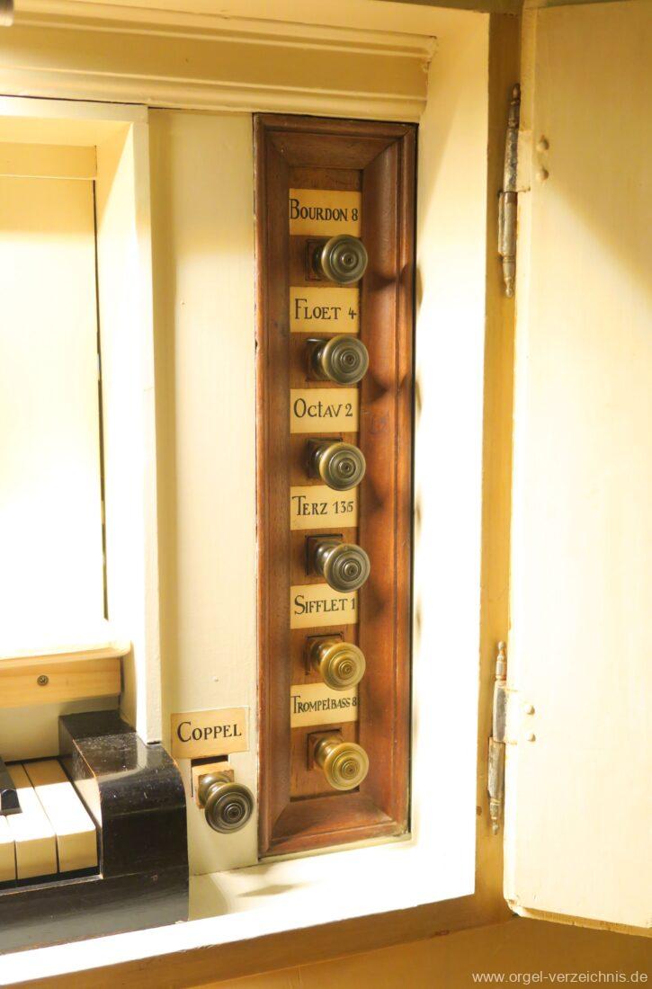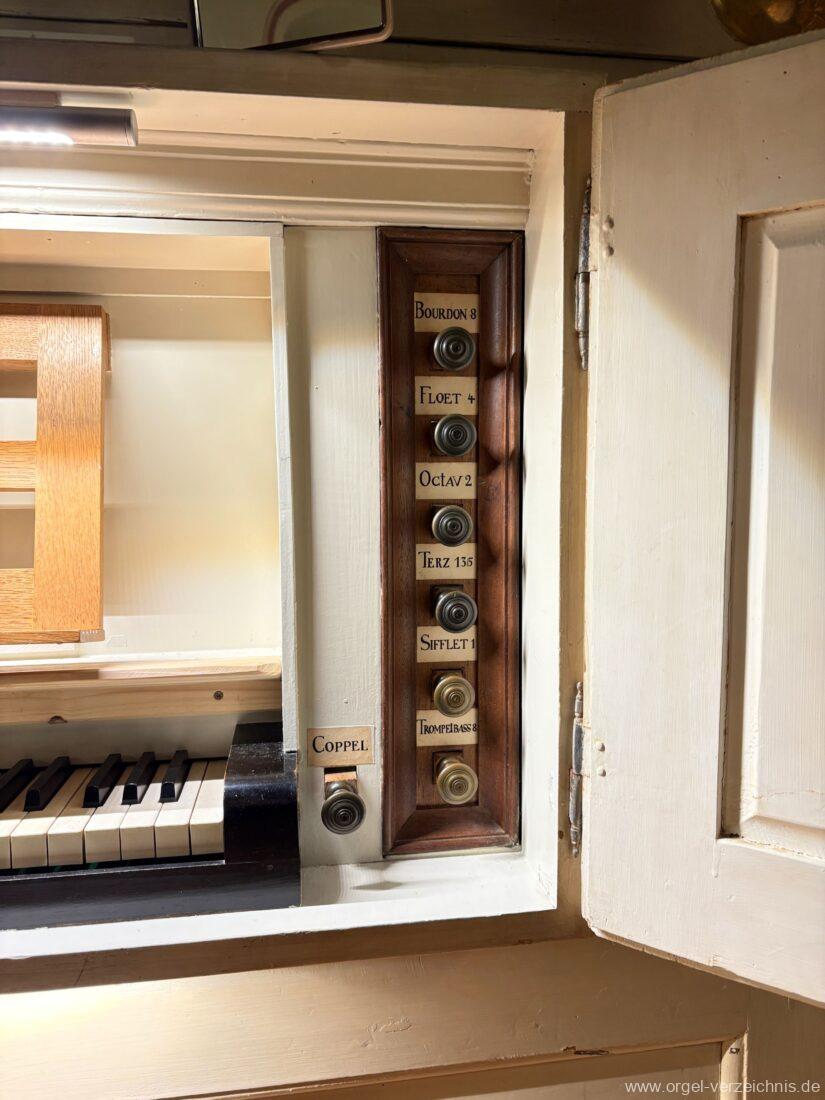 Rechte SeiteBourdon 8′ Floet 4′ Octav 2′ Terz 1 3/5′ Sifflet 1′ Trompetbass 8′ Coppel (links innen)