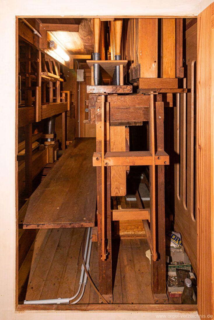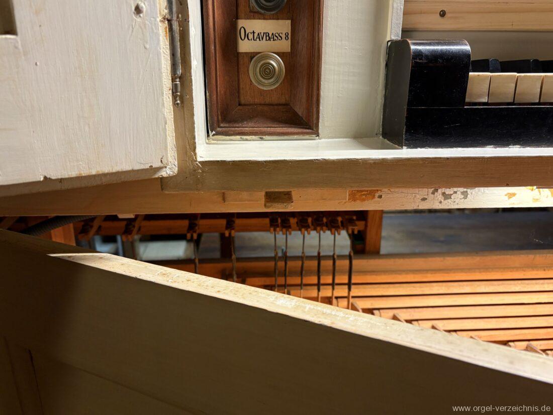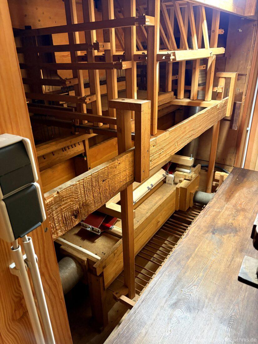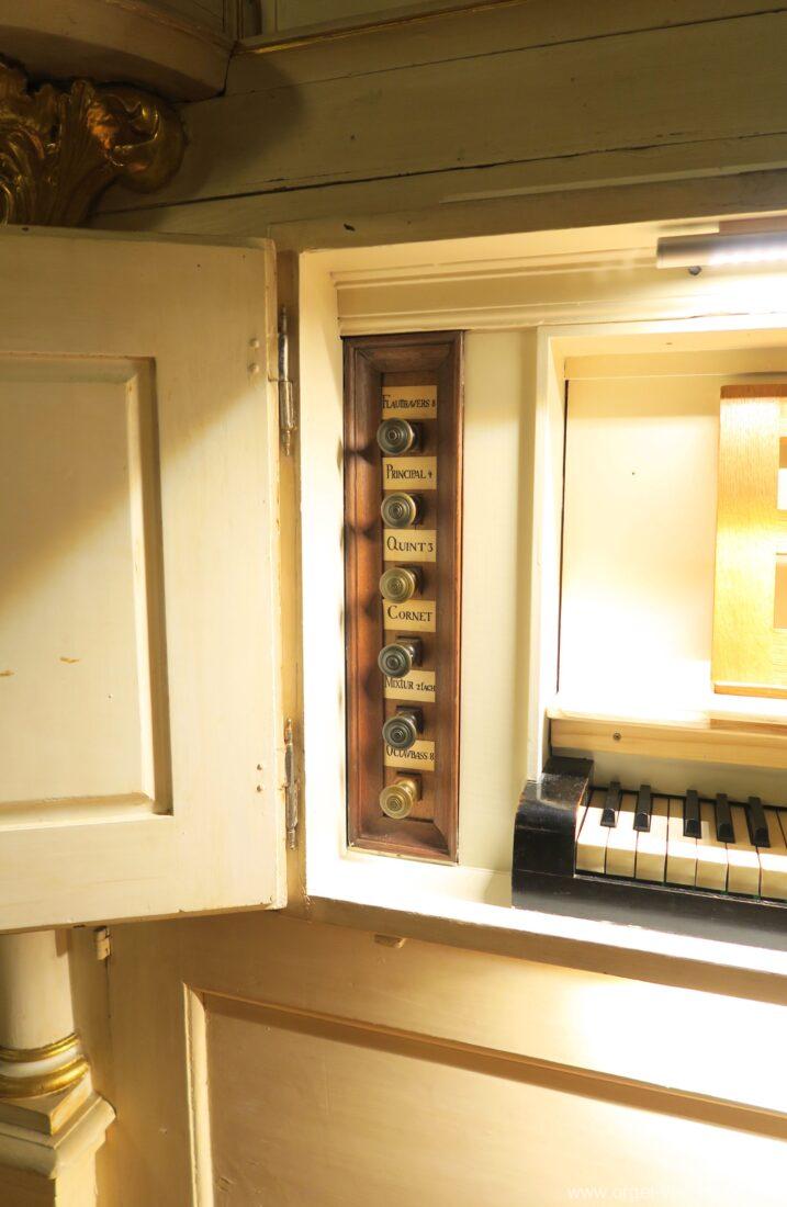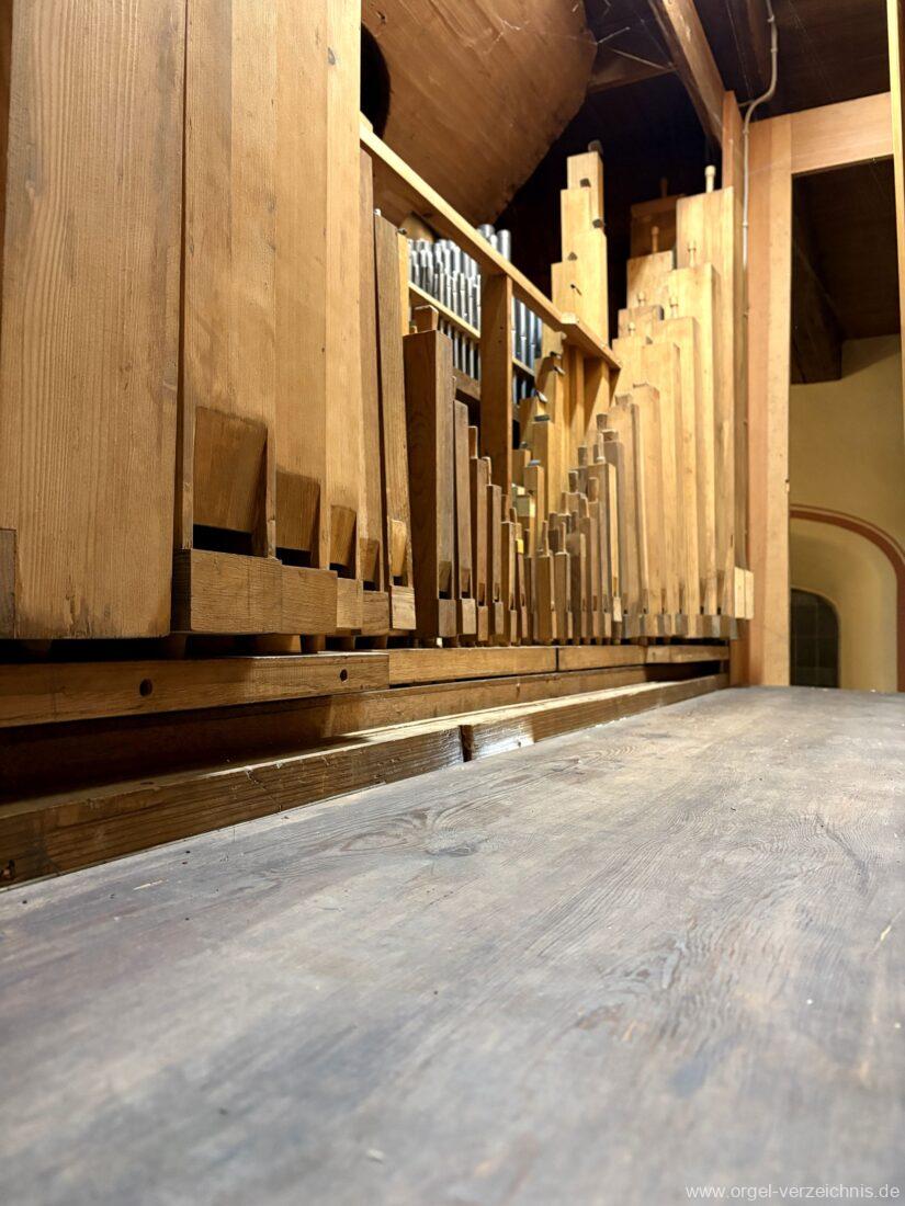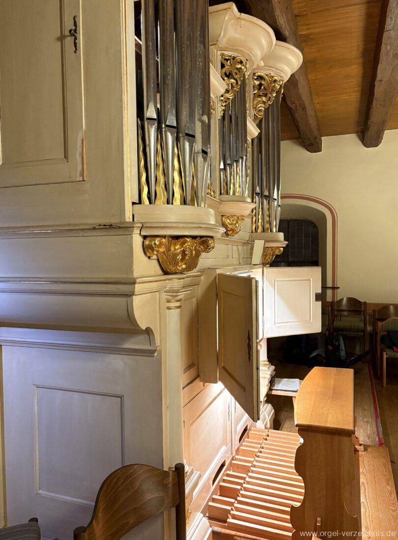 Rechte SeiteBourdon 8′ Floet 4′ Octav 2′ Terz 1 3/5′ Sifflet 1′ Trompetbass 8′ Coppel (links innen)