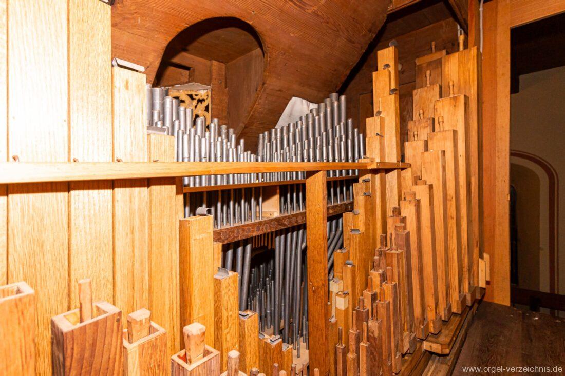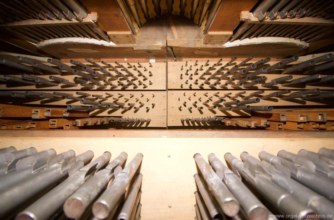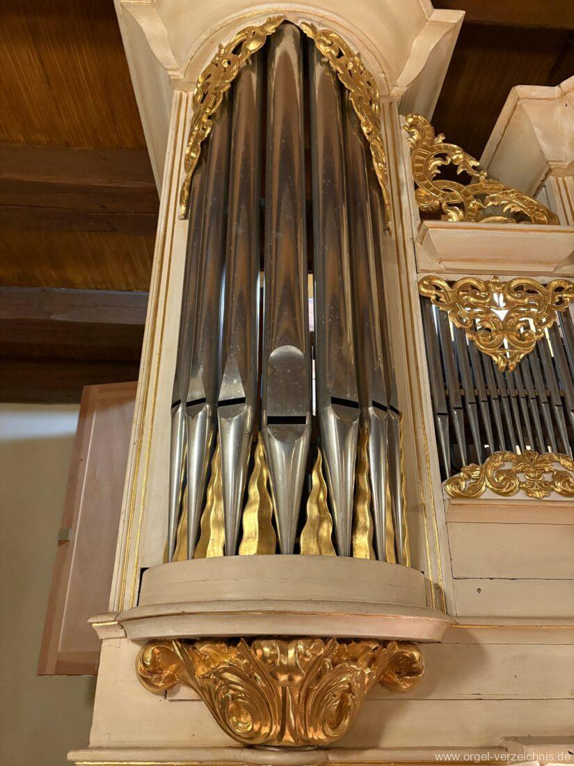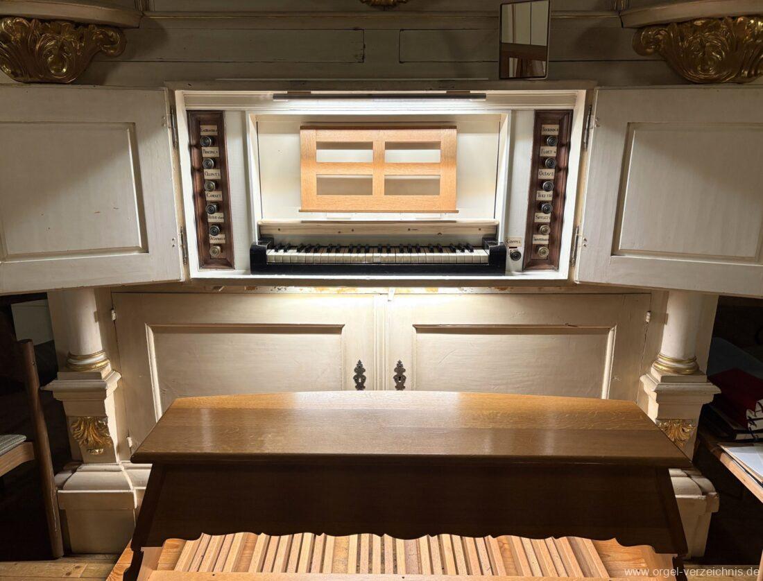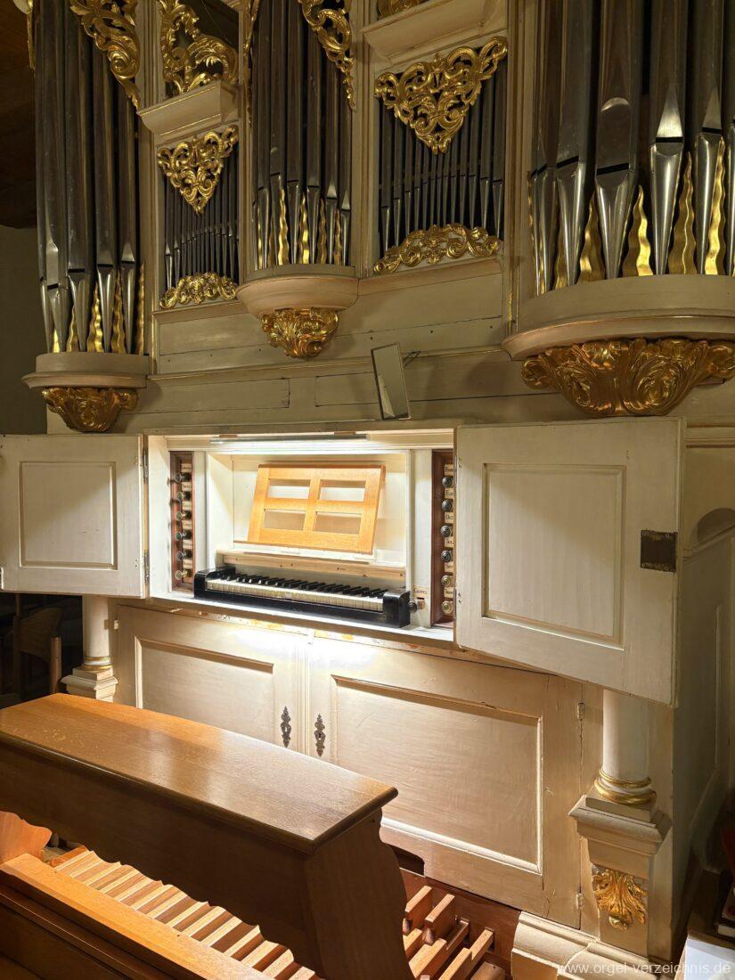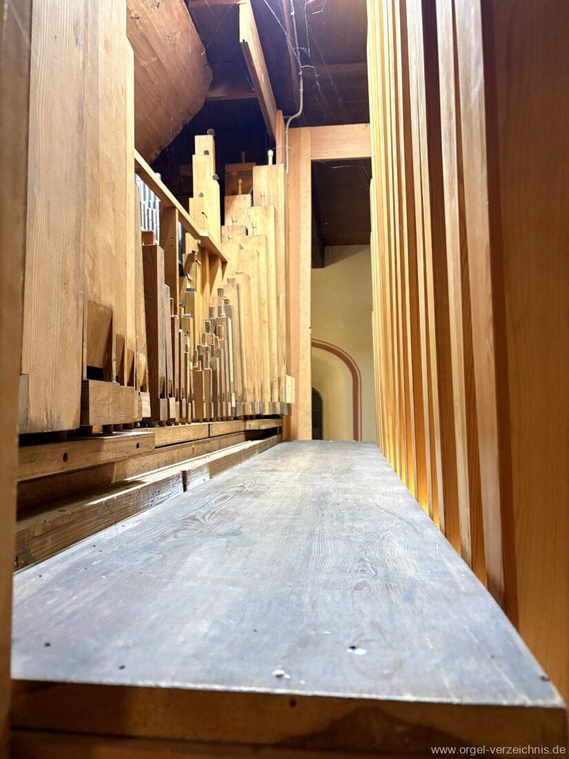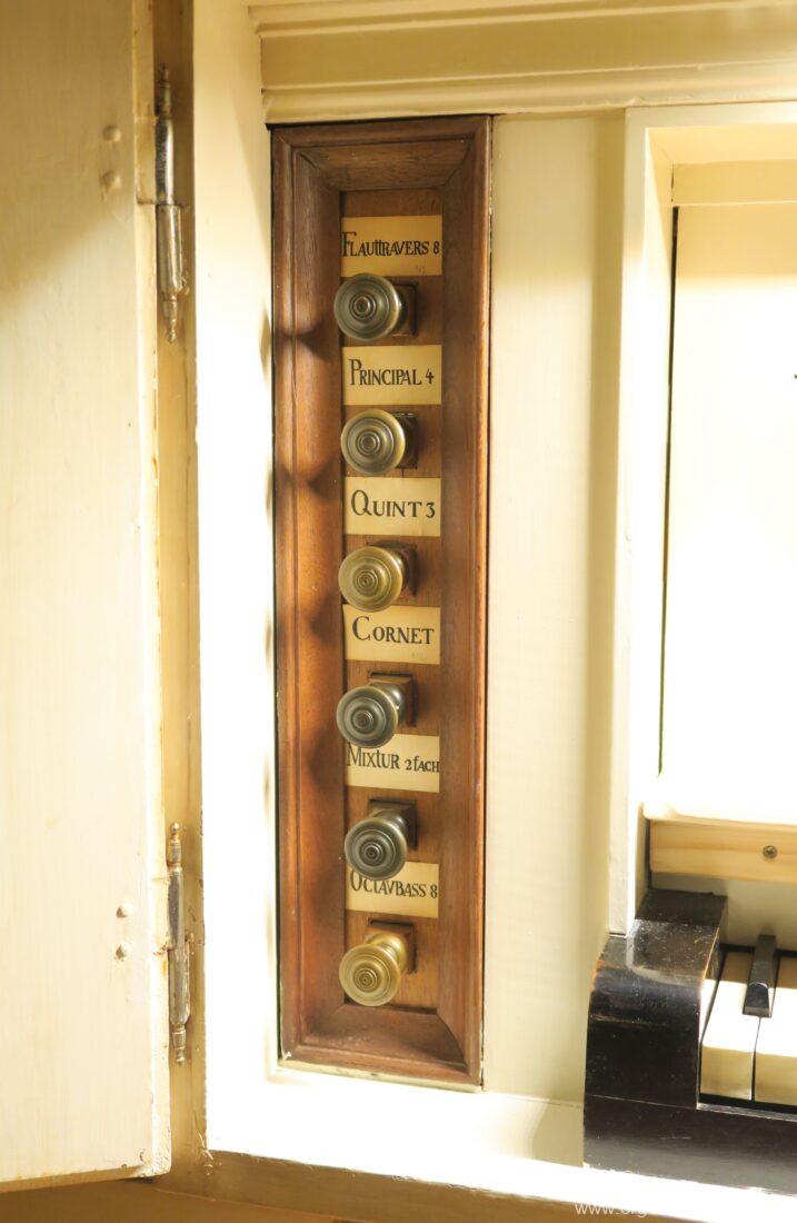 Rechte SeiteBourdon 8′ Floet 4′ Octav 2′ Terz 1 3/5′ Sifflet 1′ Trompetbass 8′ Coppel (links innen)