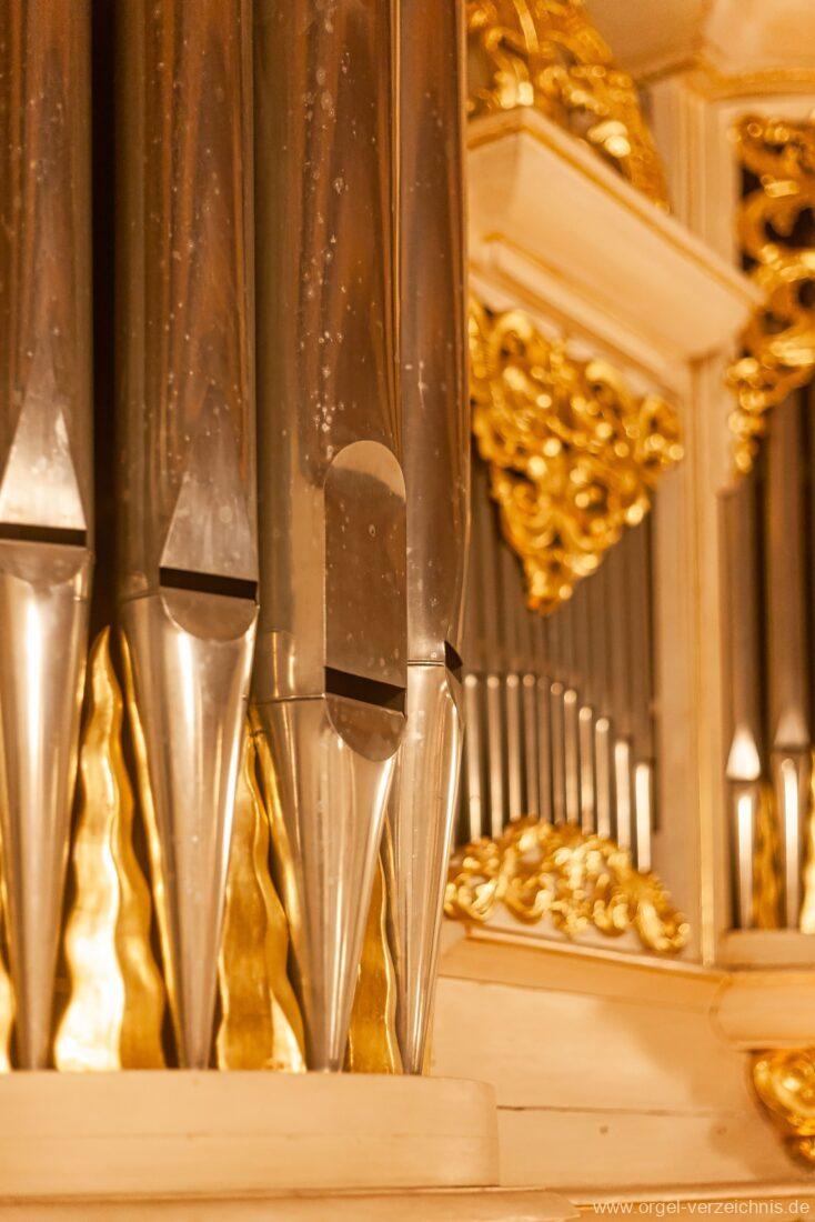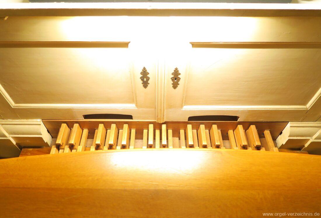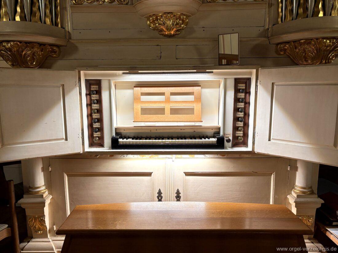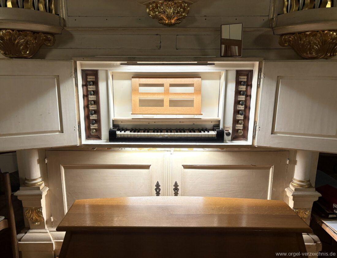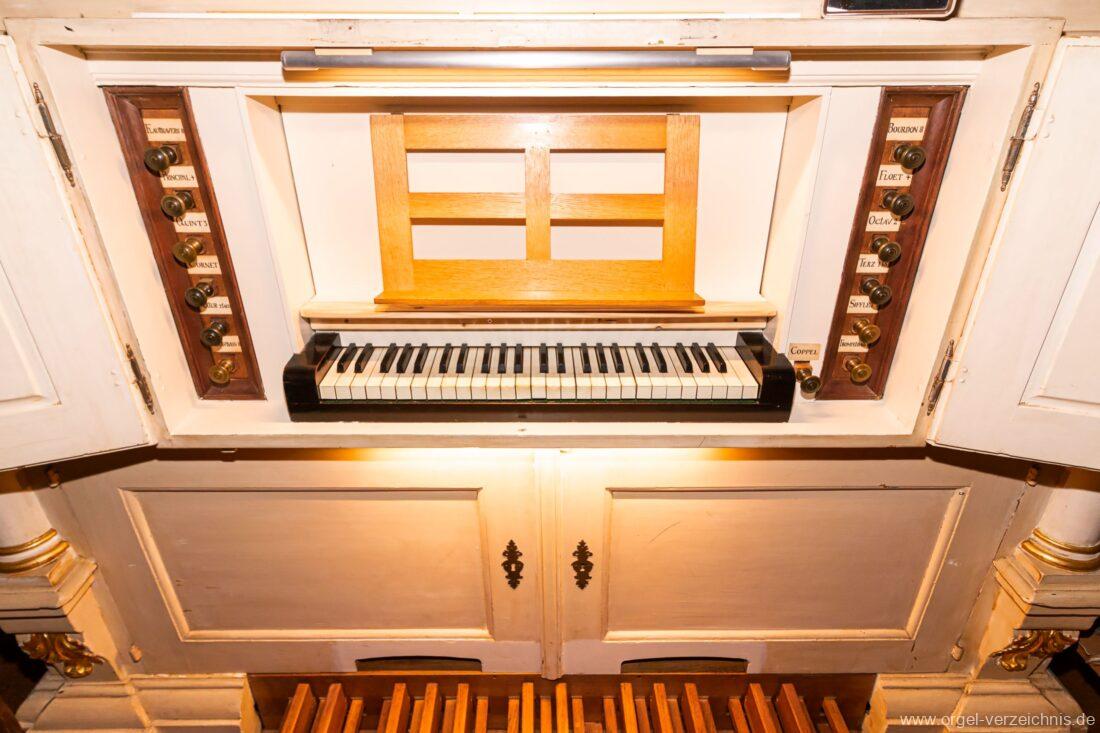 Manual C – c“‘Bourdon 8′ Holz ged.; 1734 Flauttravers 8′ ab ds°; Holz offen; teilw. alt Principal 4′ Prospekt, Metall Floet 4′ Holz rohrged.; ab c“ Metall, offen, konisch; 1734 Quint 3′ Holz offen; ab c‘ Metall, flötig; teilw. 1734 Octav 2′ Metall; 1734 Terz 1 3/5′ ab c‘; Metall, prinzipalisch Sifflet 1′ Metall; neu Cornet ab c‘; V 8′; 8′ ged.; aufgebänkt; 1813 Mixtur 2fach 1′; Metall – rep. c°/c’/c“; teilw. 1734