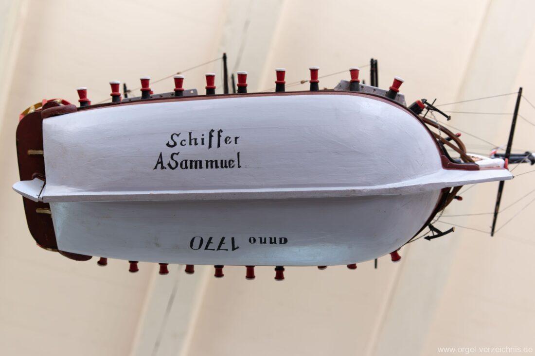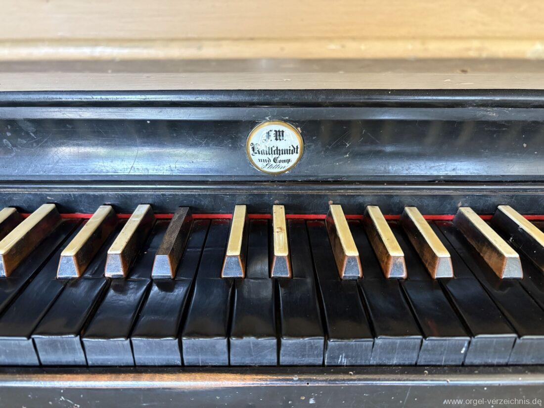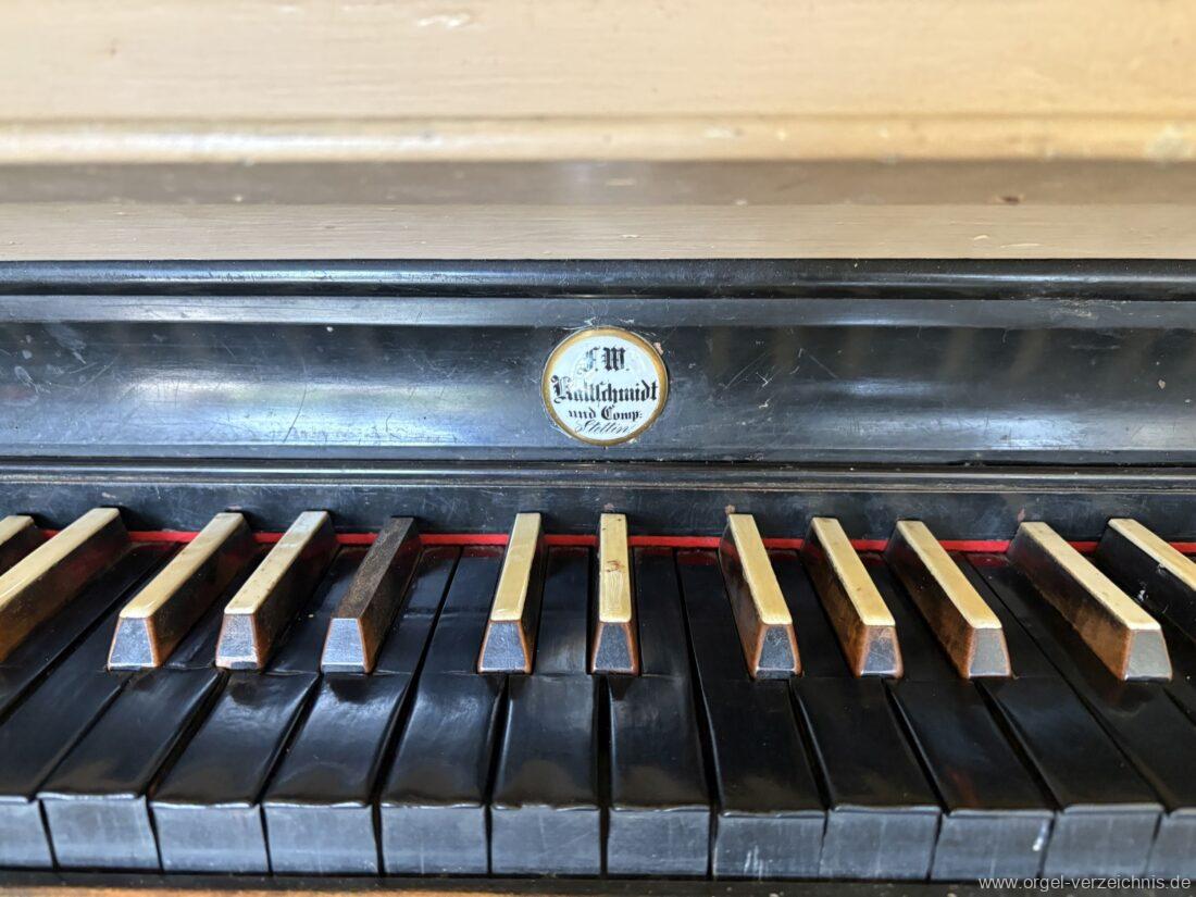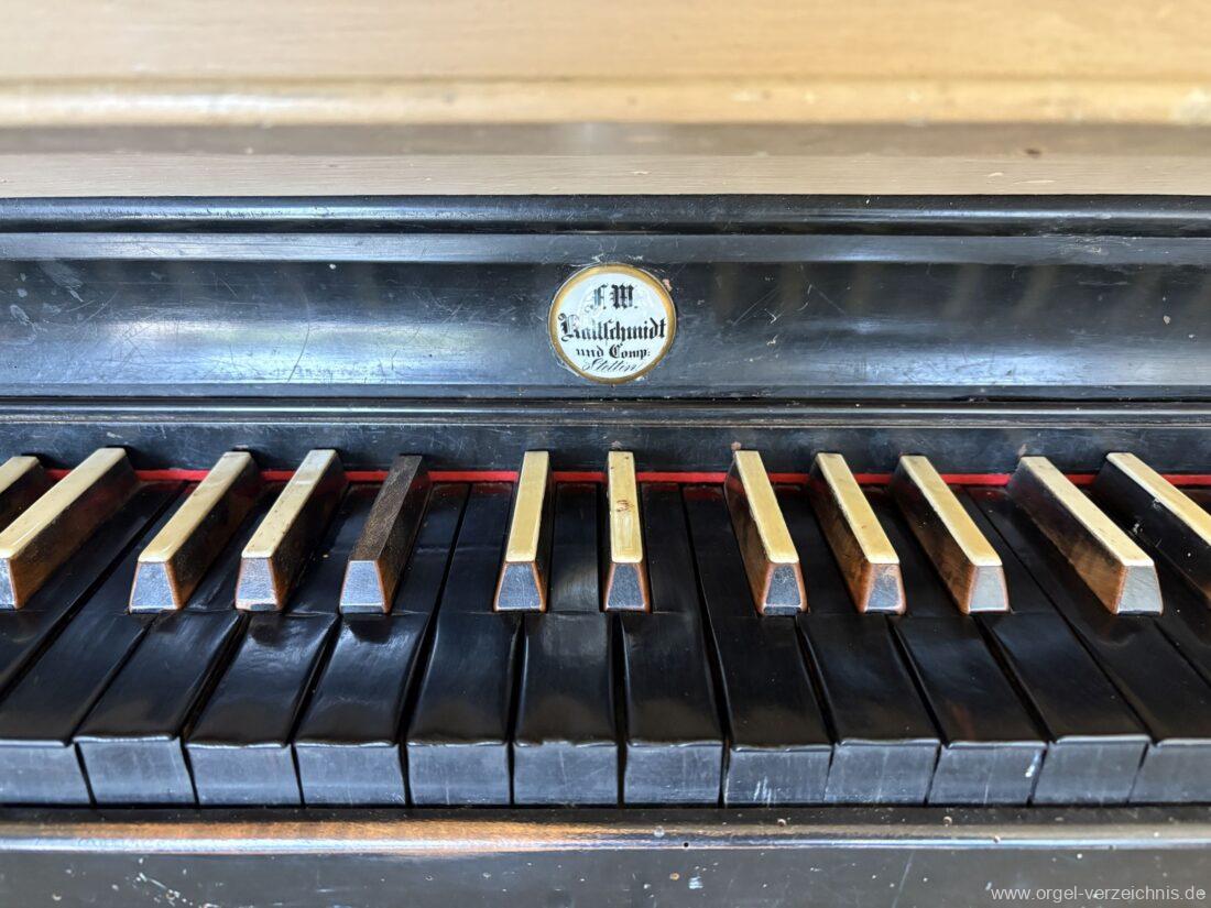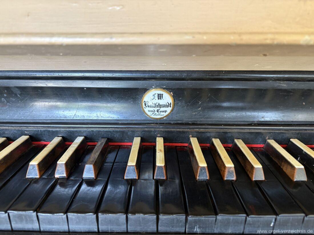 1856 seitenspielige mechanische Schleifladenorgel (Brüstungsorgel) mit linksseitig fest eingebautem Spielschrank, erbaut von Orgelbauer Friedrich Wilhelm Kaltschmidt (Stettin) I/8. Schreibweise Firmenschild: F.W. Kaltschmidt und Comp: Stettin..